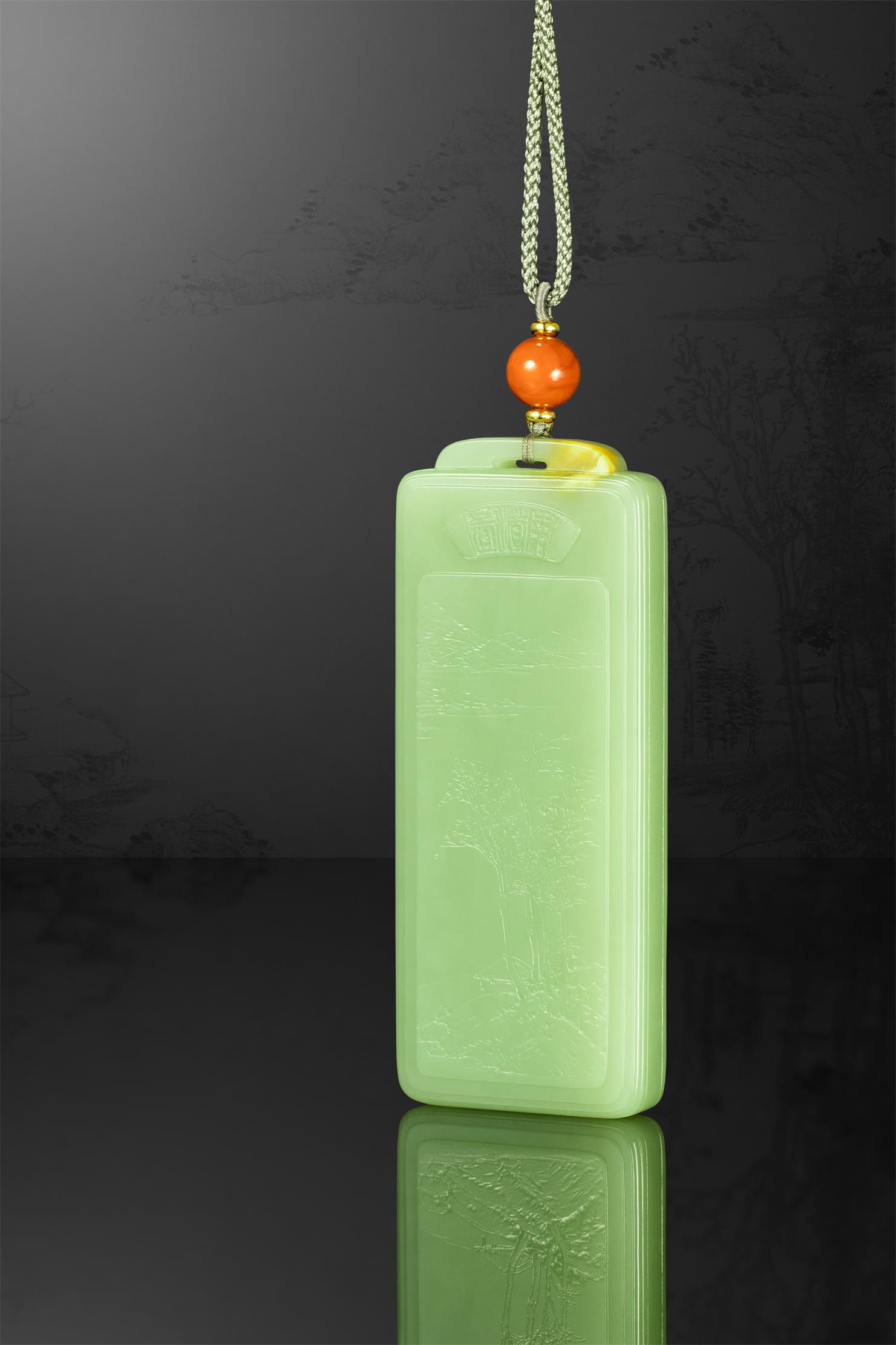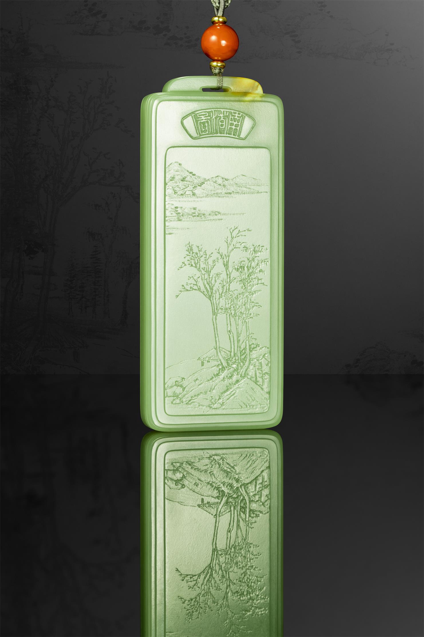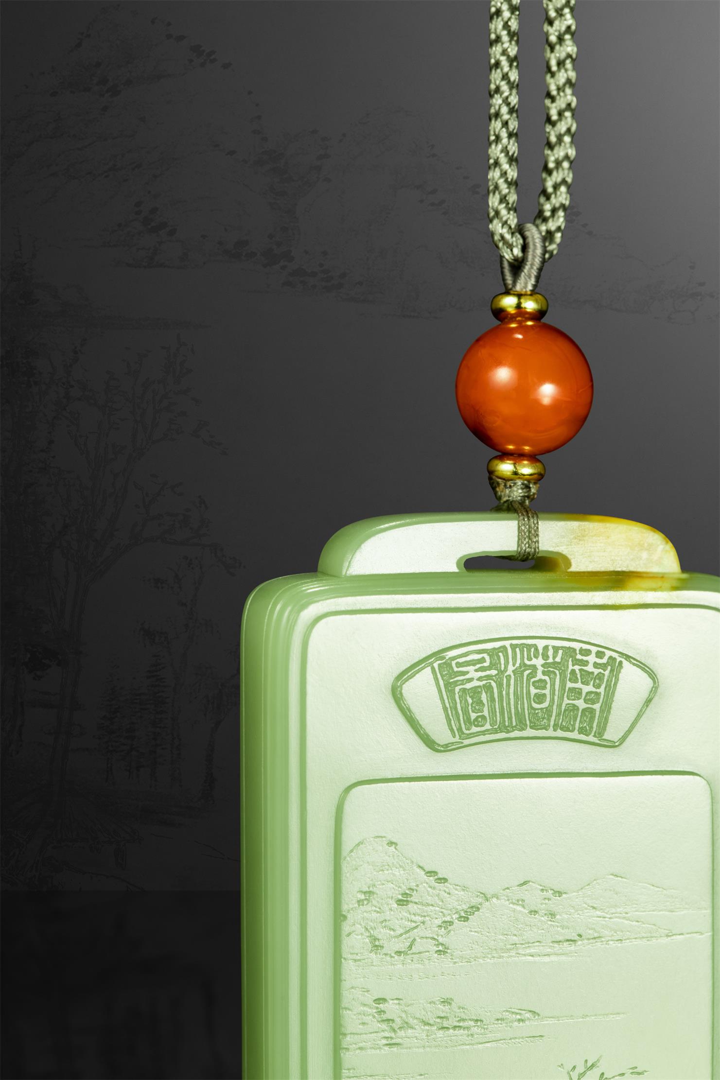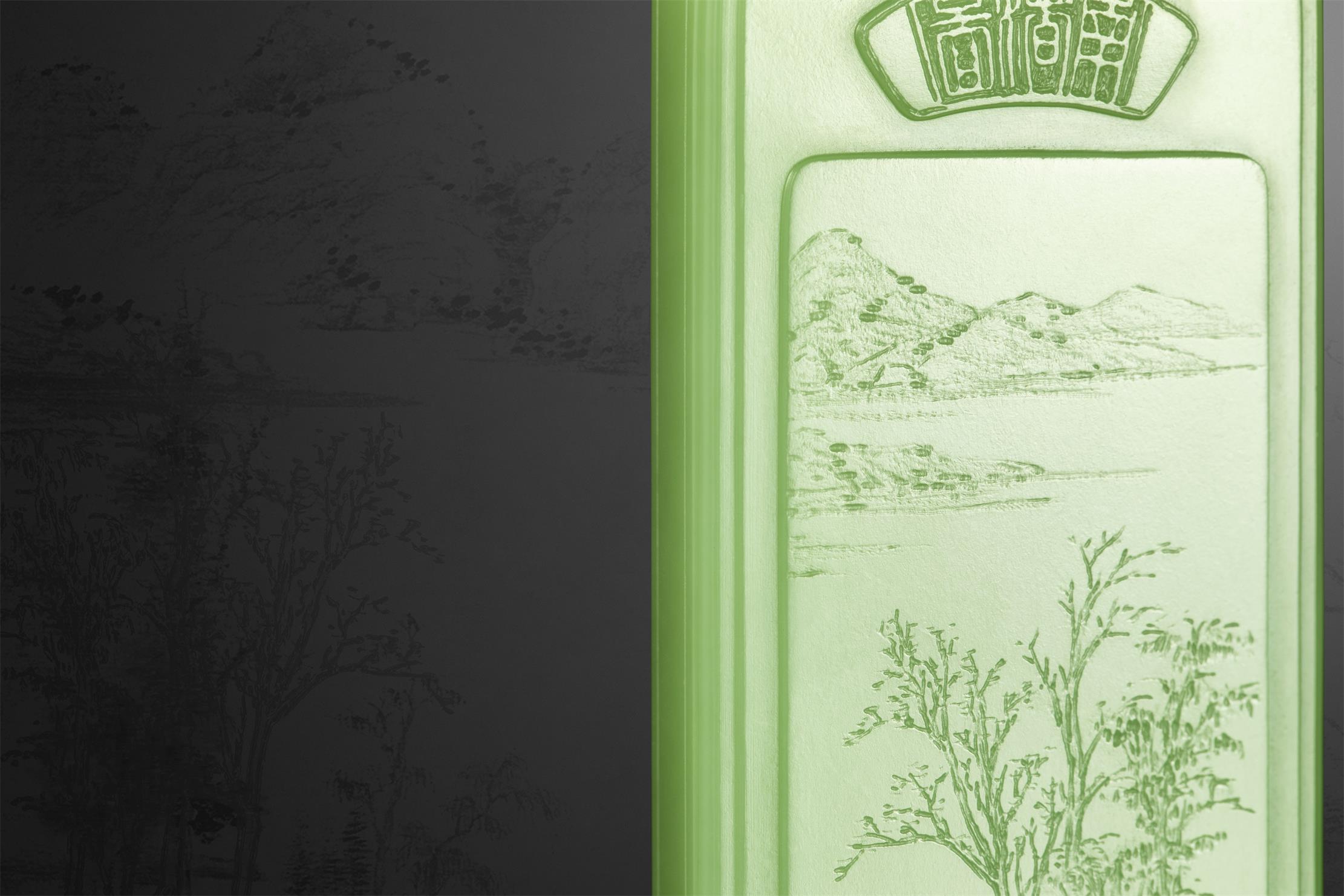 作者以简洁流畅的边框线,将清润细腻的玉面分隔出牌头和牌面的诗画感。