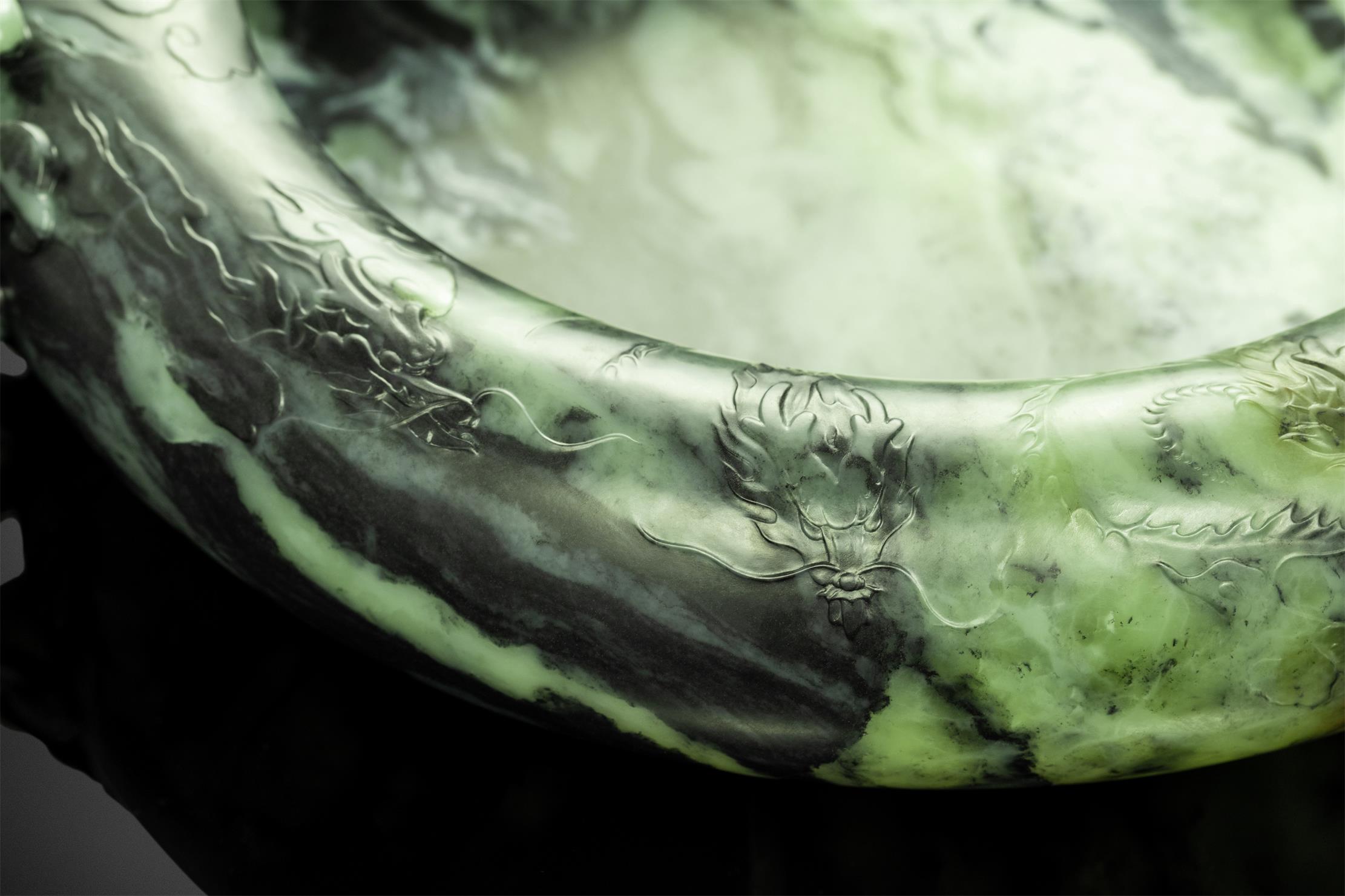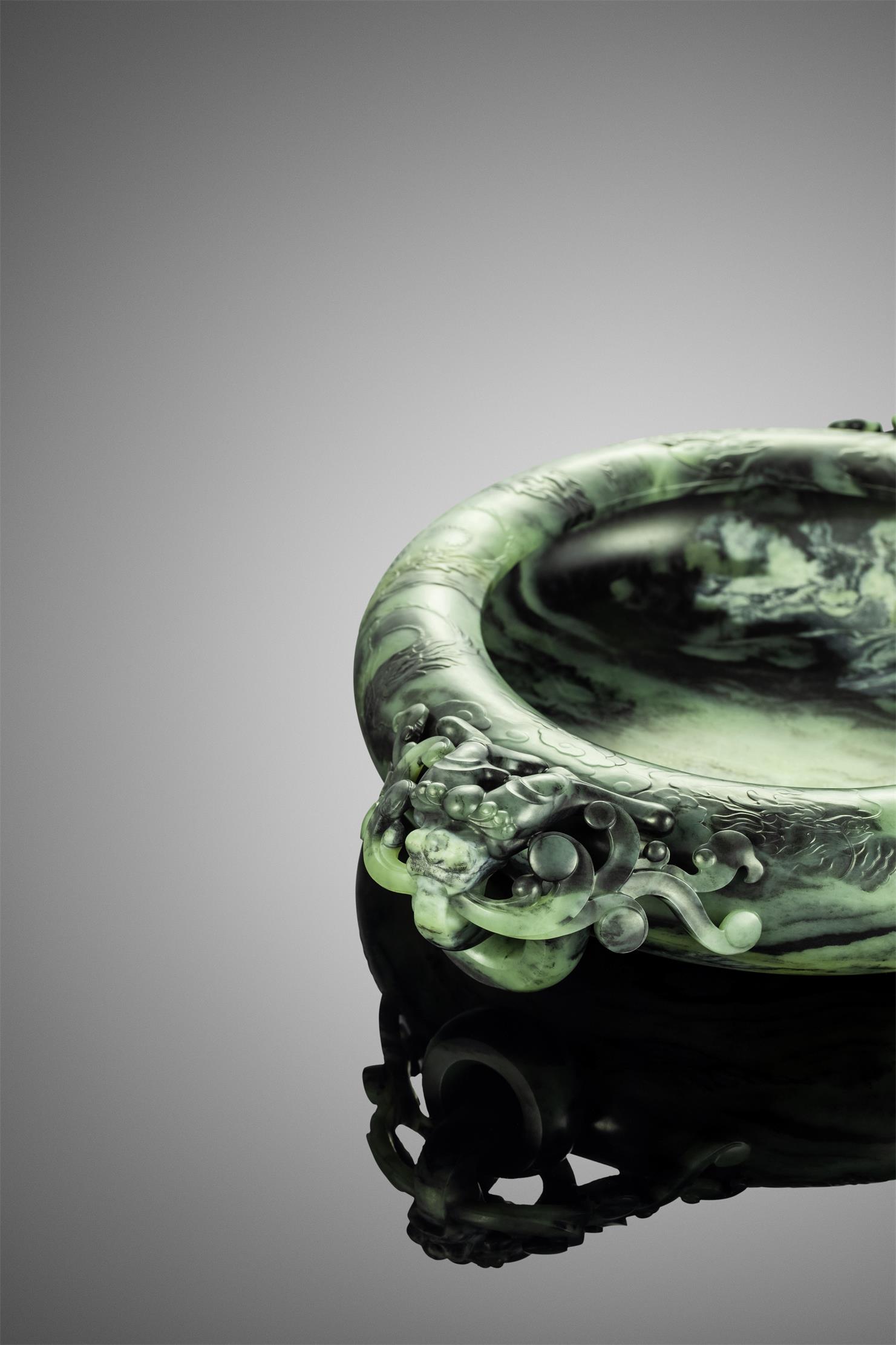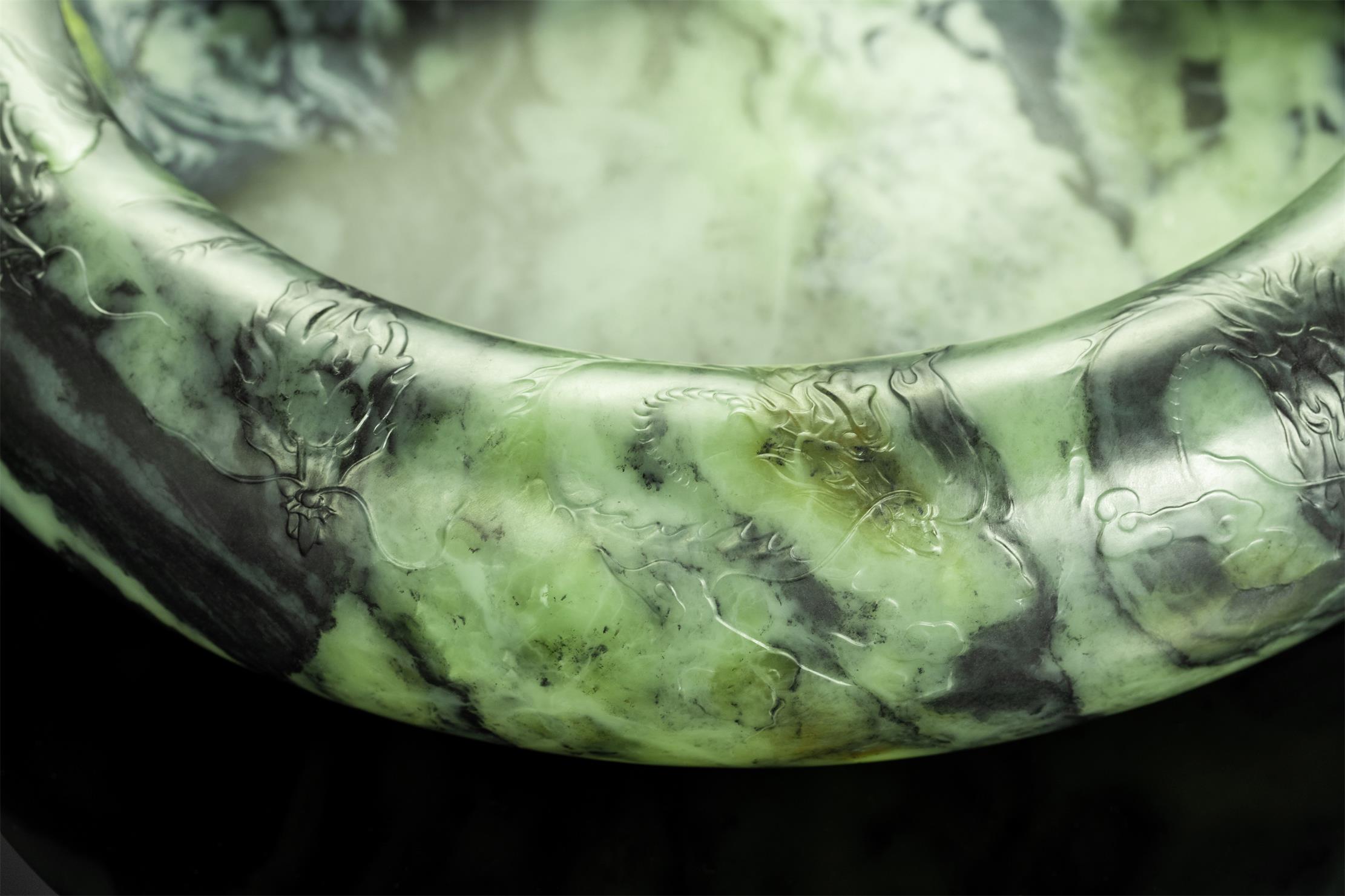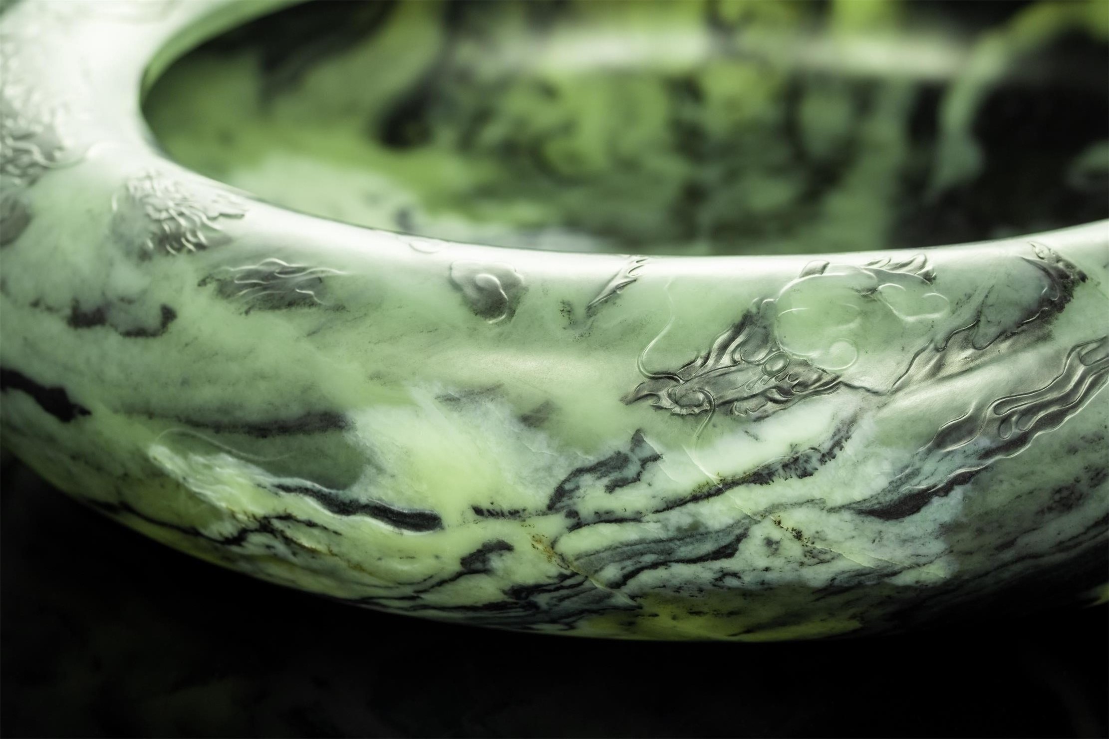 千璞滙旗下玉雕师李旭,最近就以析木玉的青花料,雕刻了一个与龙有关的笔洗,名为《九龙洗》。