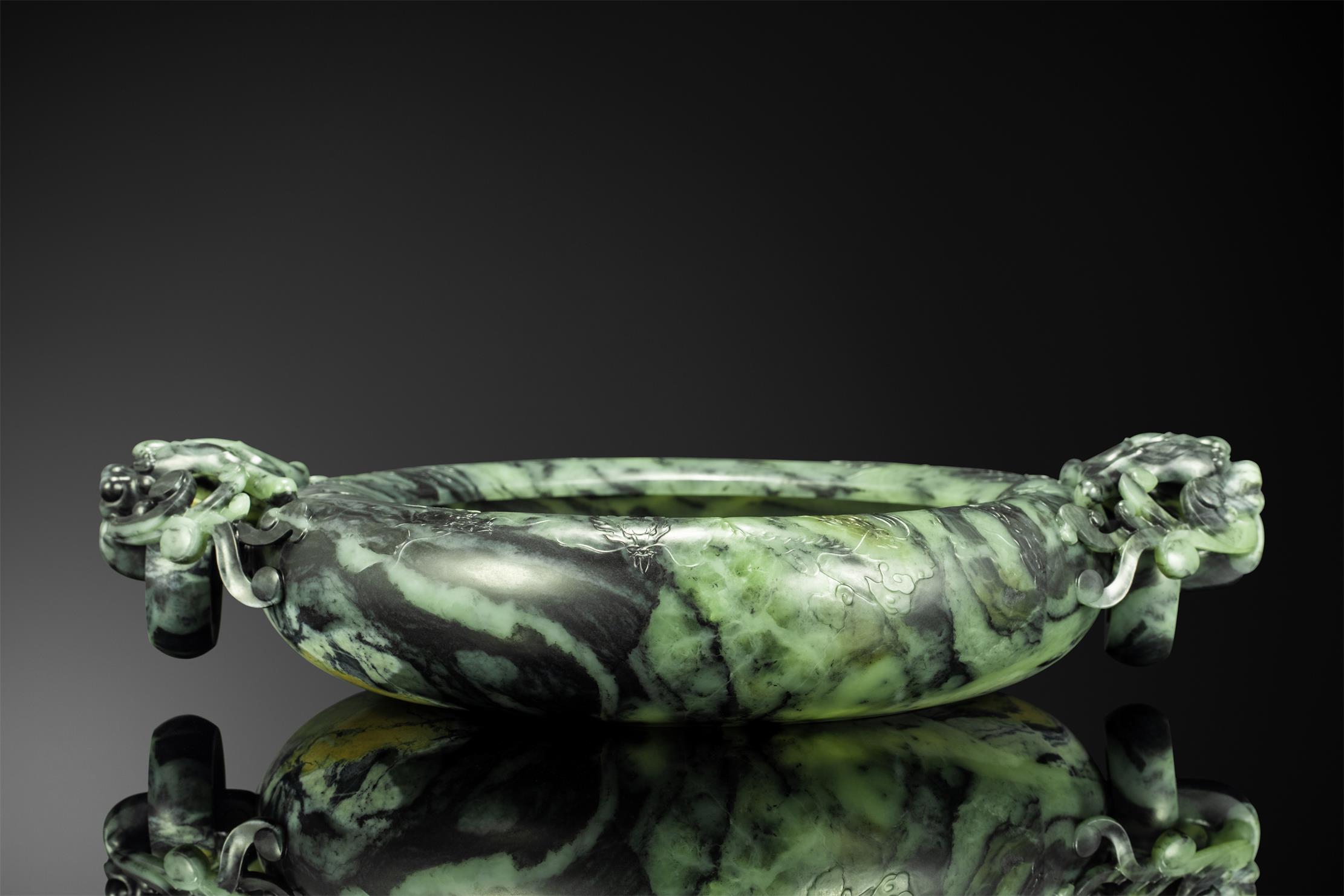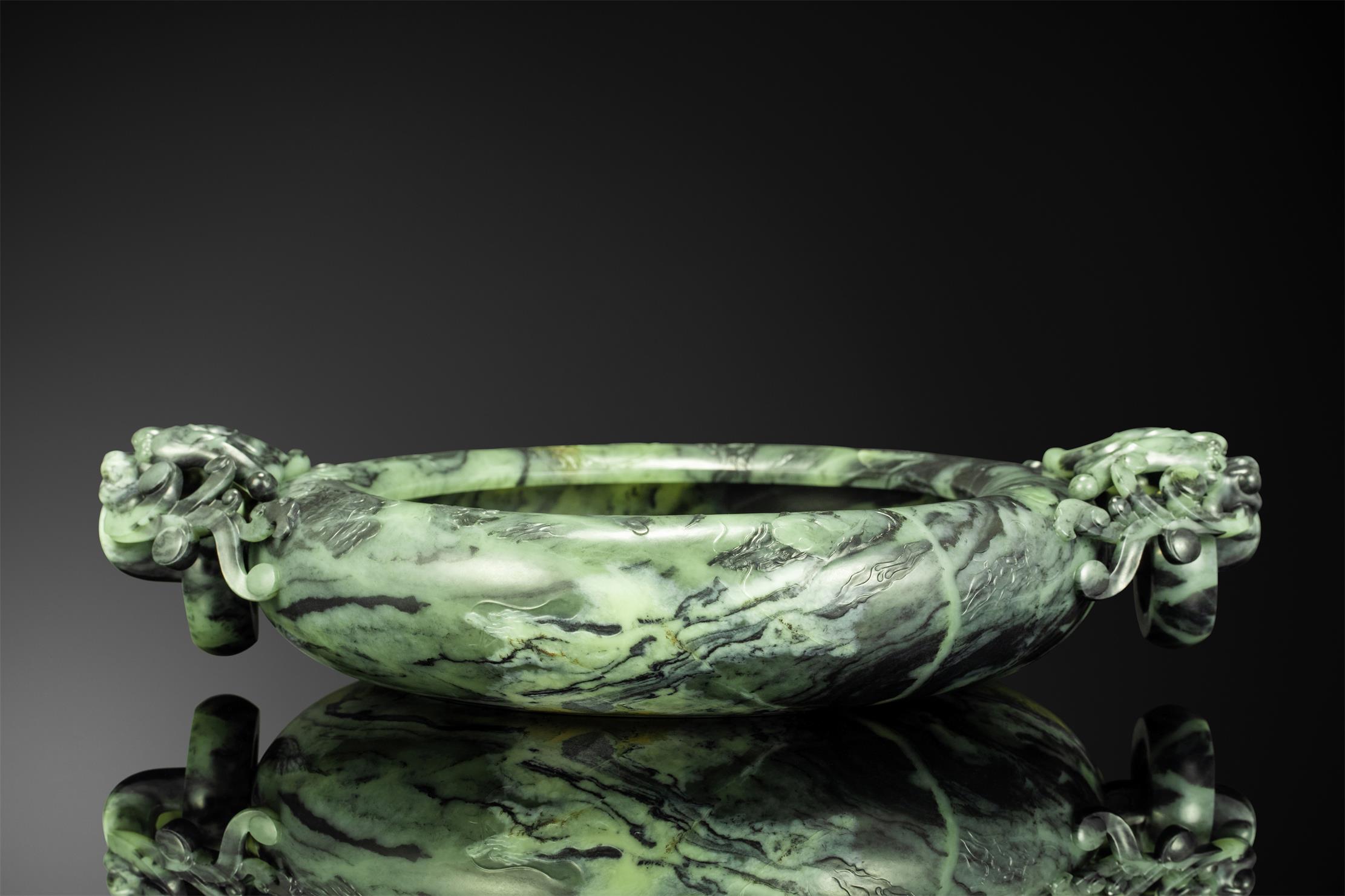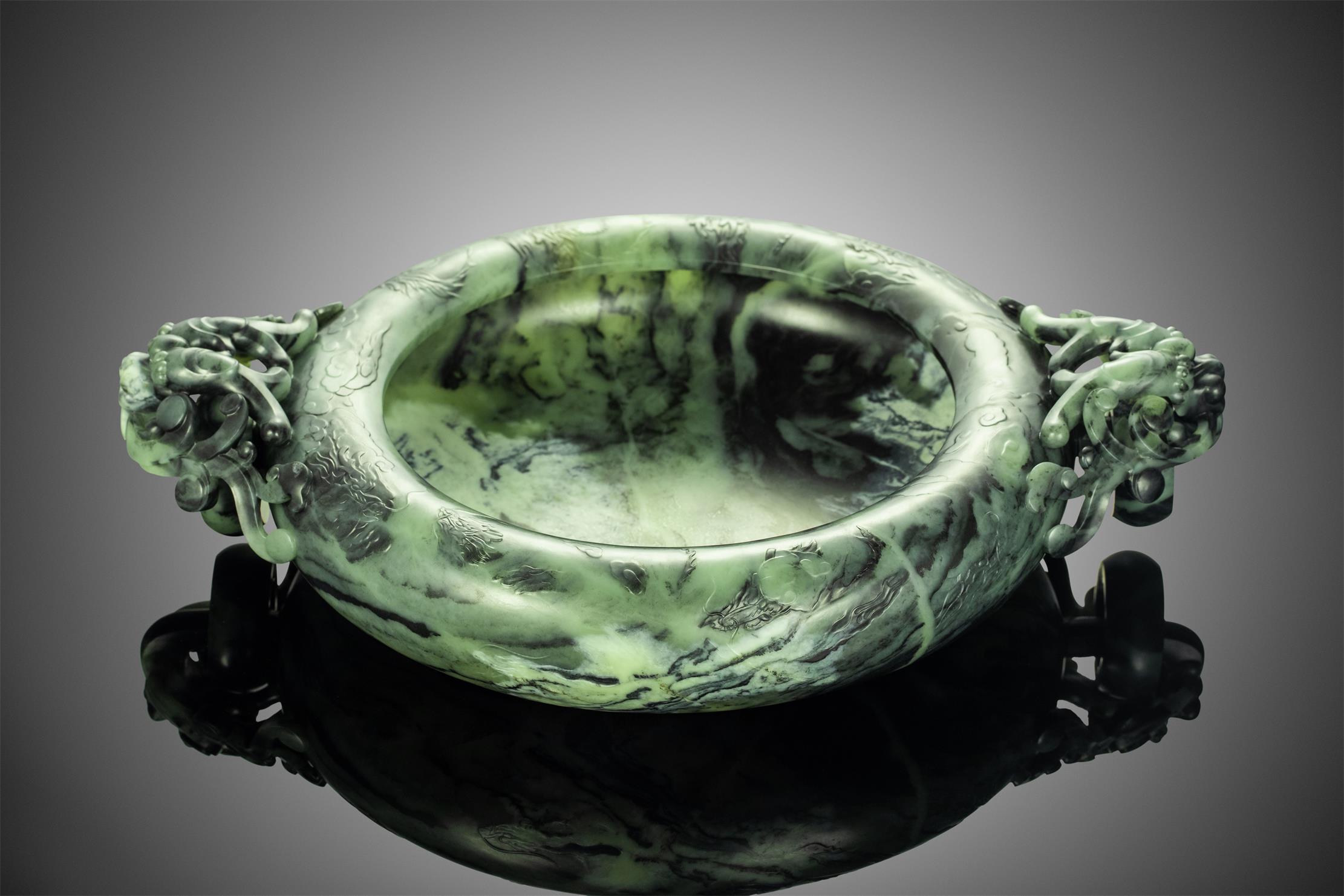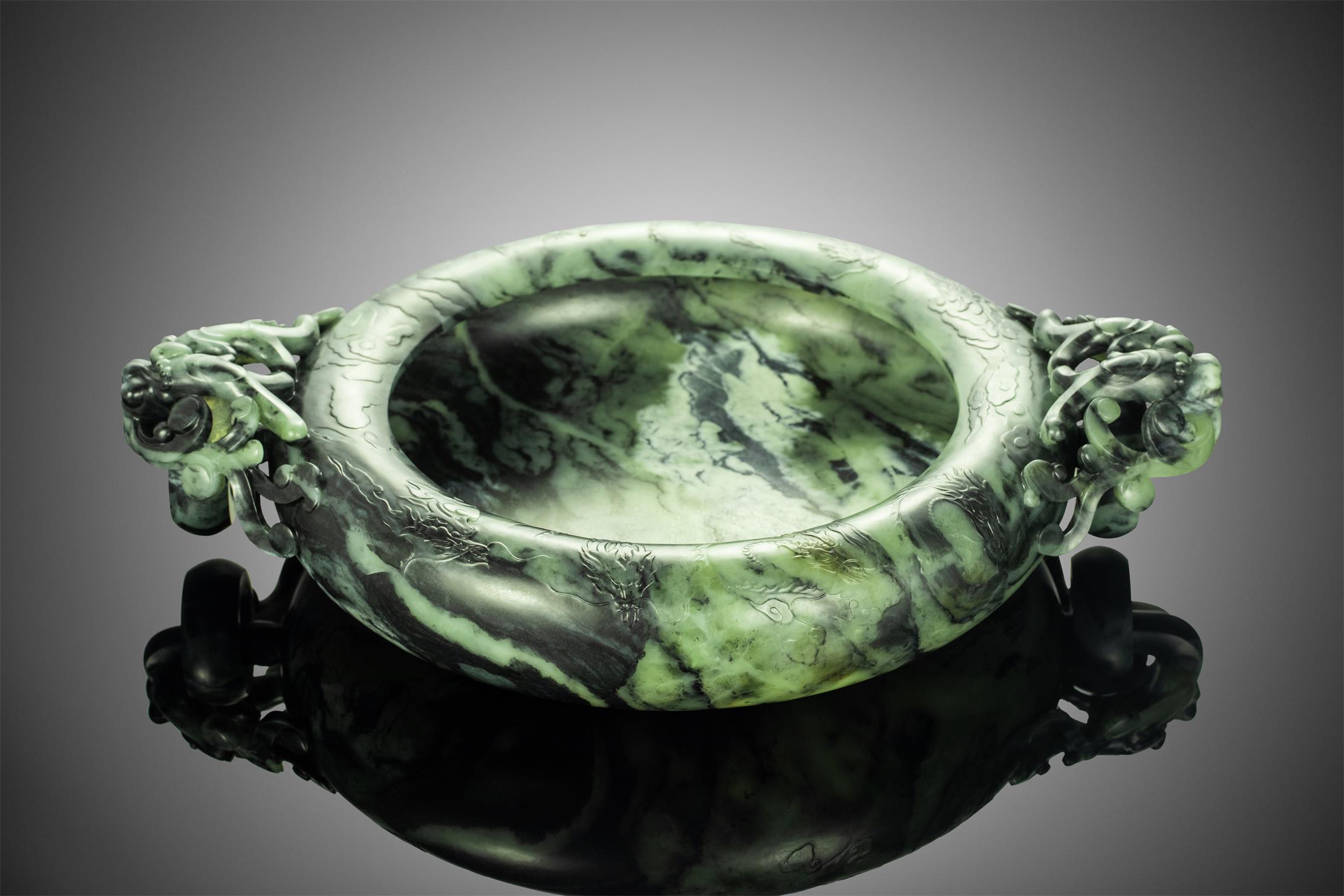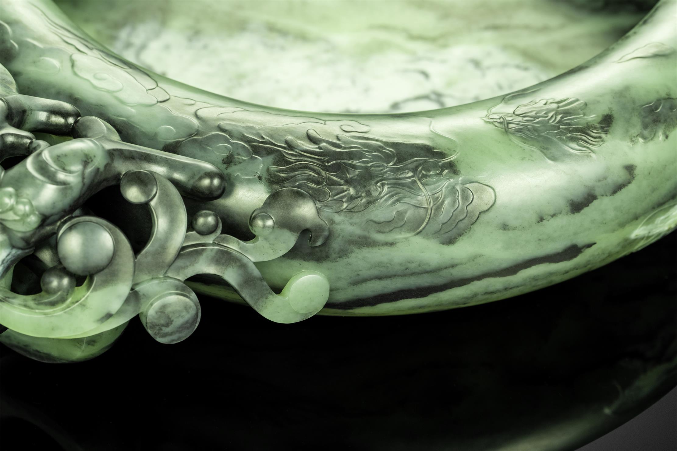 千璞滙旗下玉雕师李旭,最近就以析木玉的青花料,雕刻了一个与龙有关的笔洗,名为《九龙洗》。