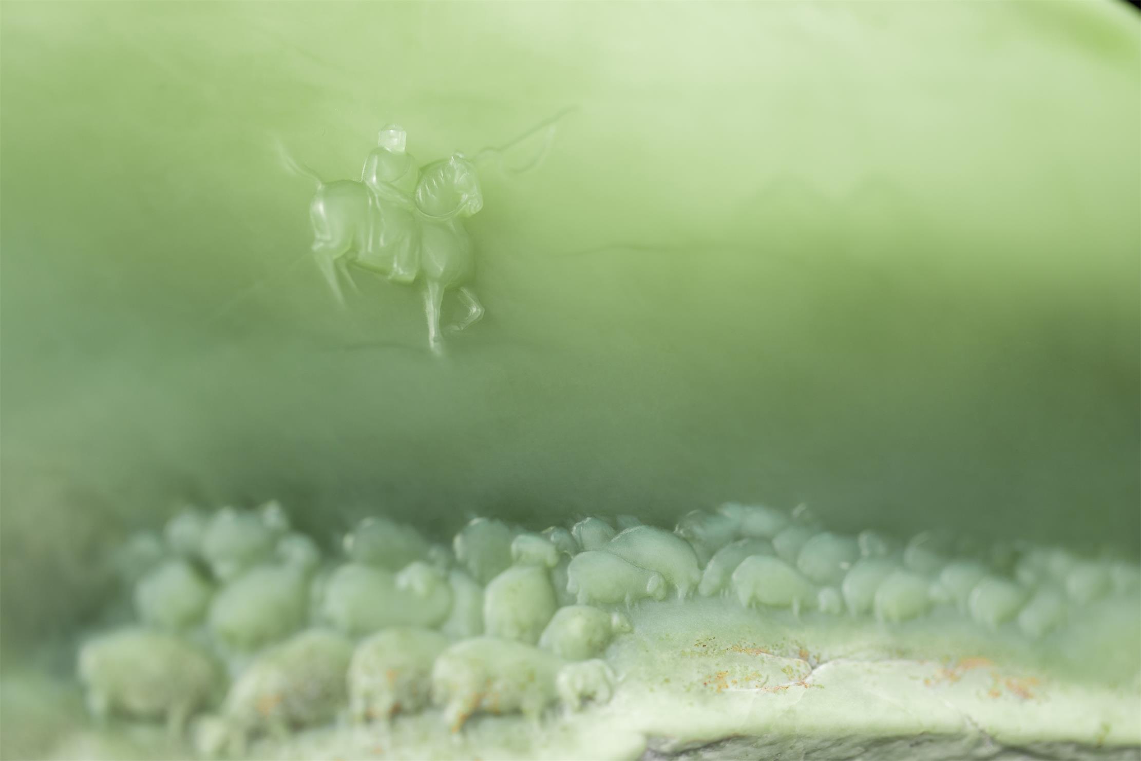 后来,没见赵泽民,倒是先见了这个白皮料的成品《牧羊人》,发现他又挑战了高难度的玉石雕刻界新类别,即被人称为非镂空平面透雕“双面绣”的双面透雕。