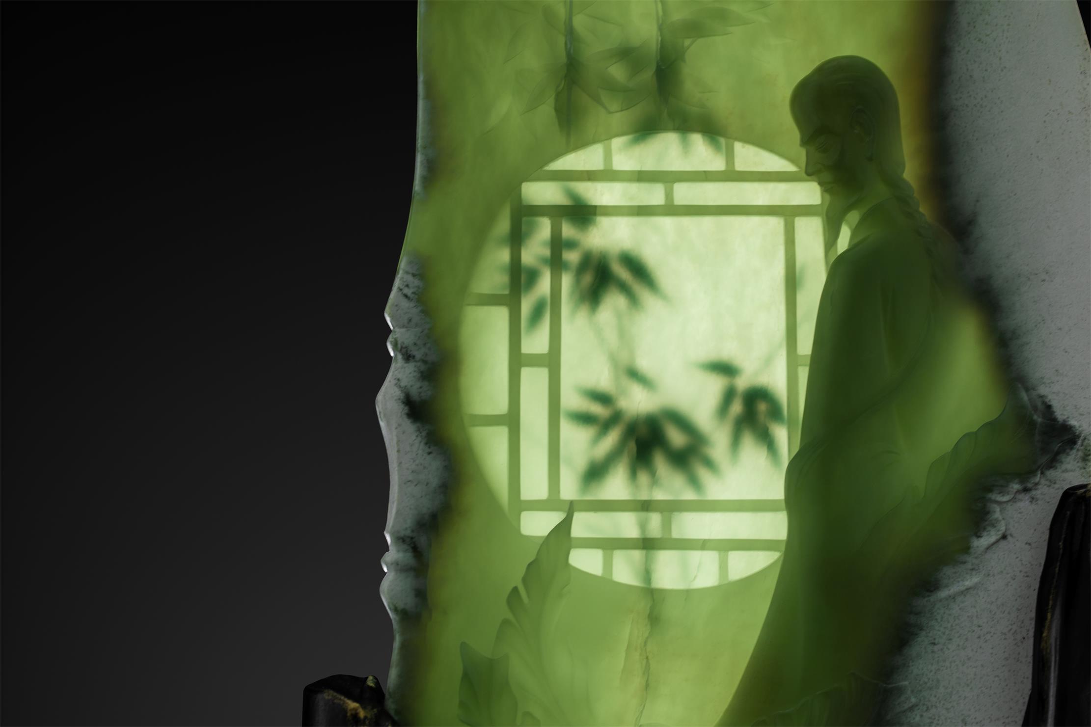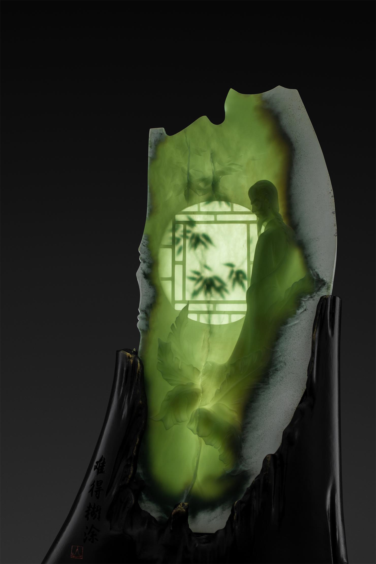 玉面上,有一个面相清秀淳朴、气质刚直孤高的清代雅士正临窗而立。