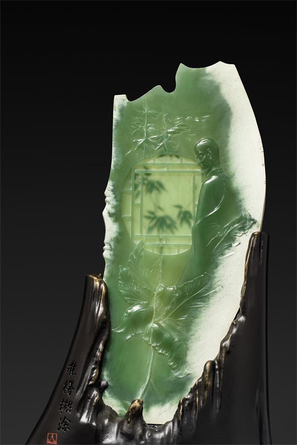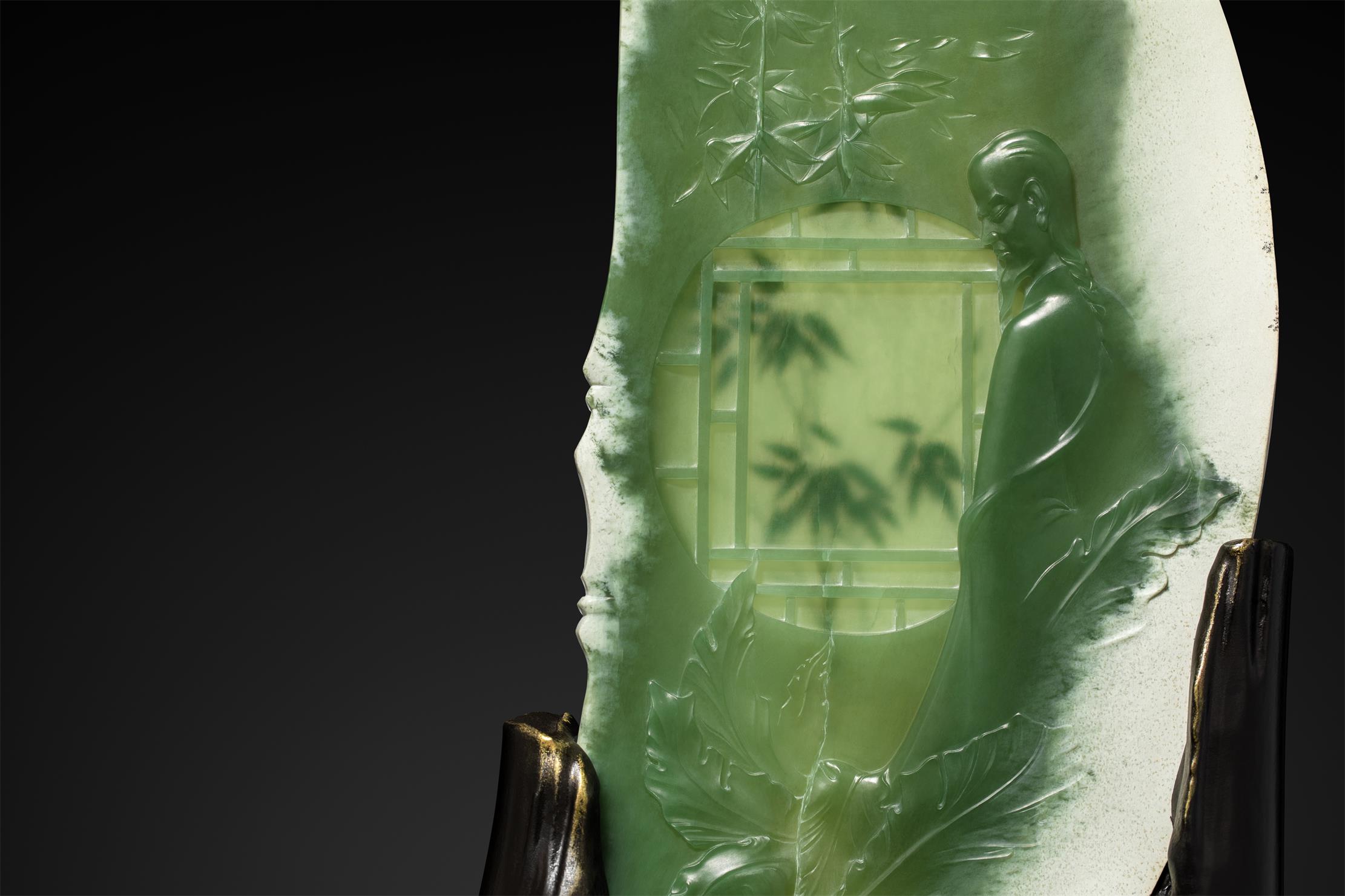 蕉叶上下垂落,虚实相间,与人物正前的瘦竹形成呼应,其间透雕的圆窗与适当留白,烘托出主体的鲜明。