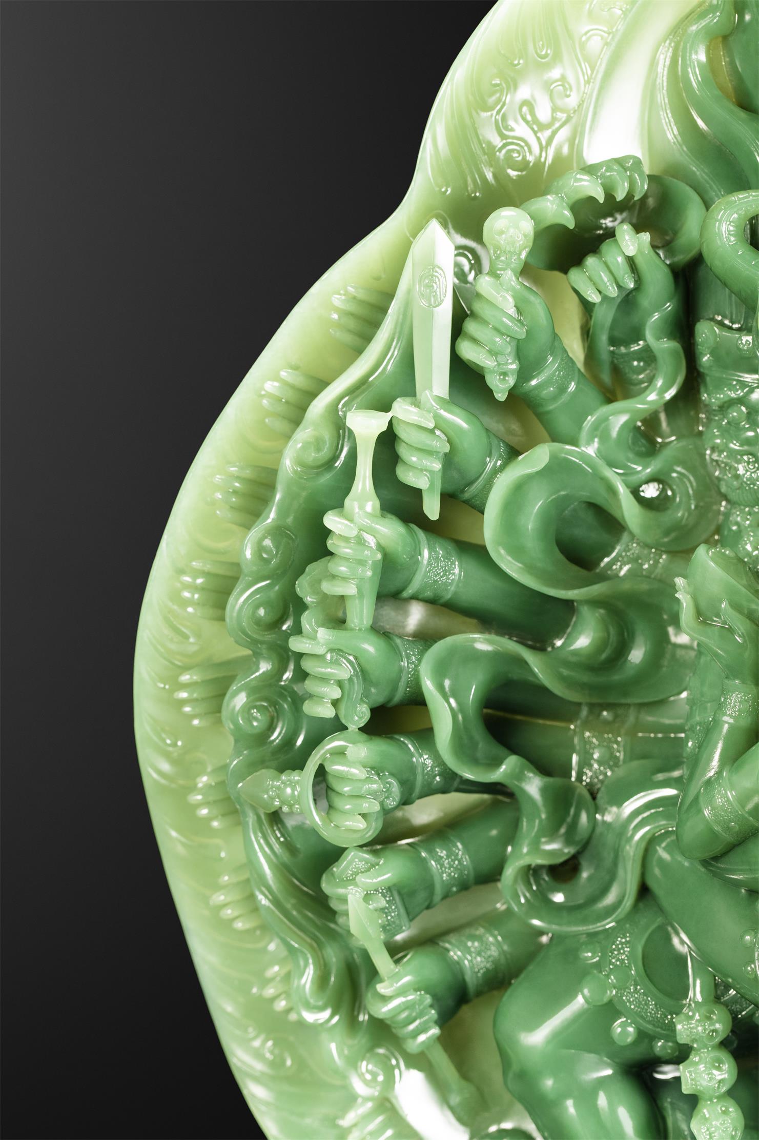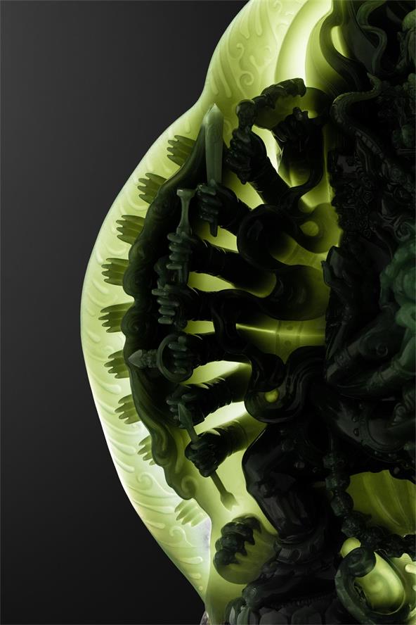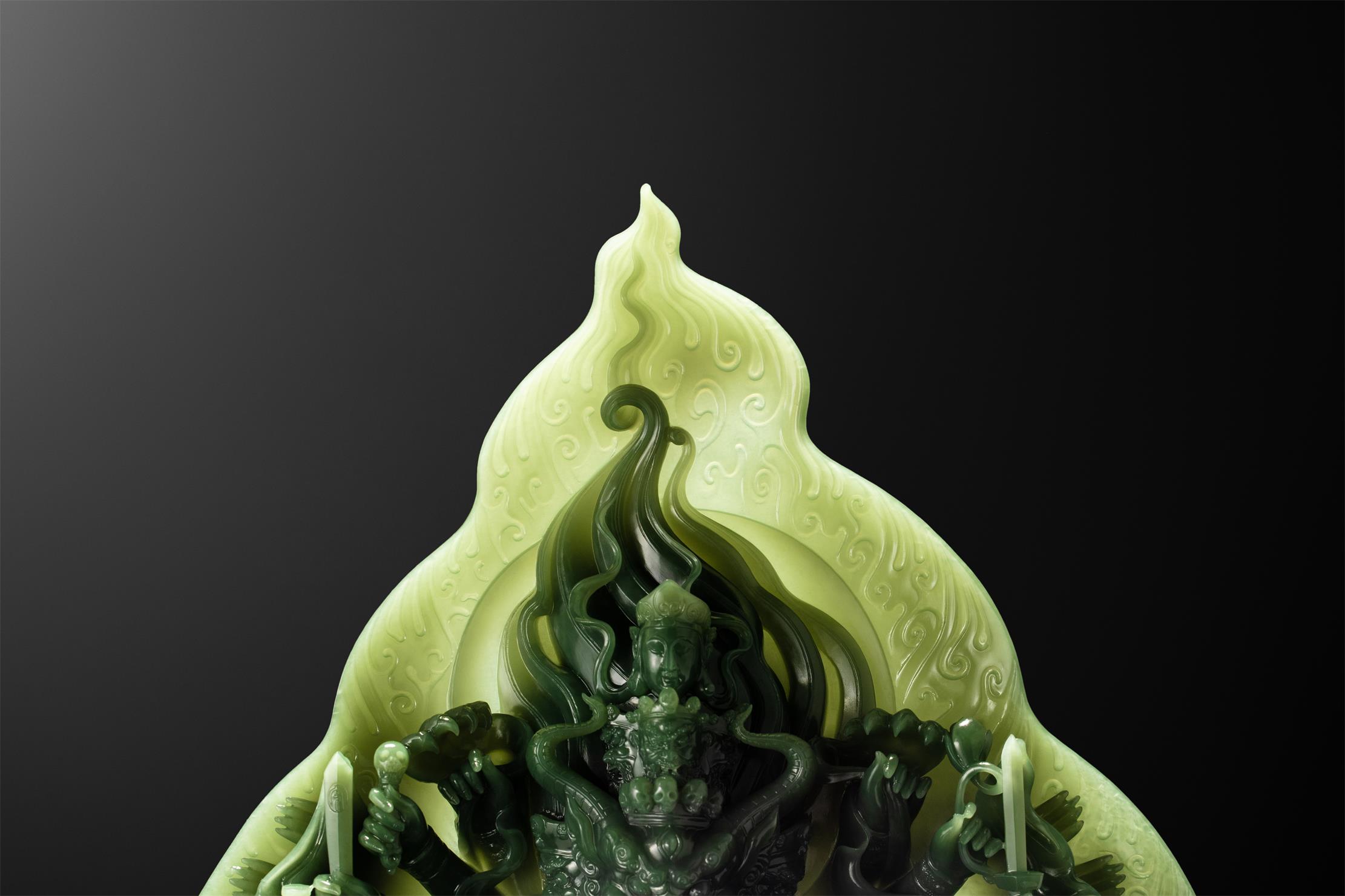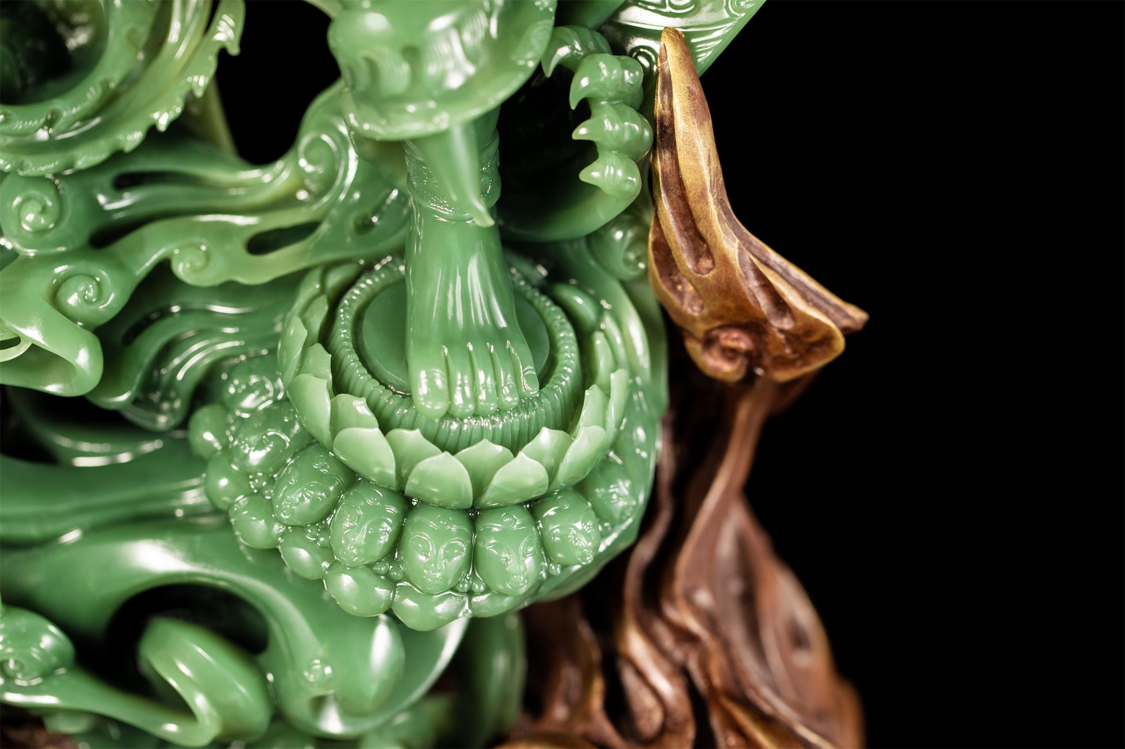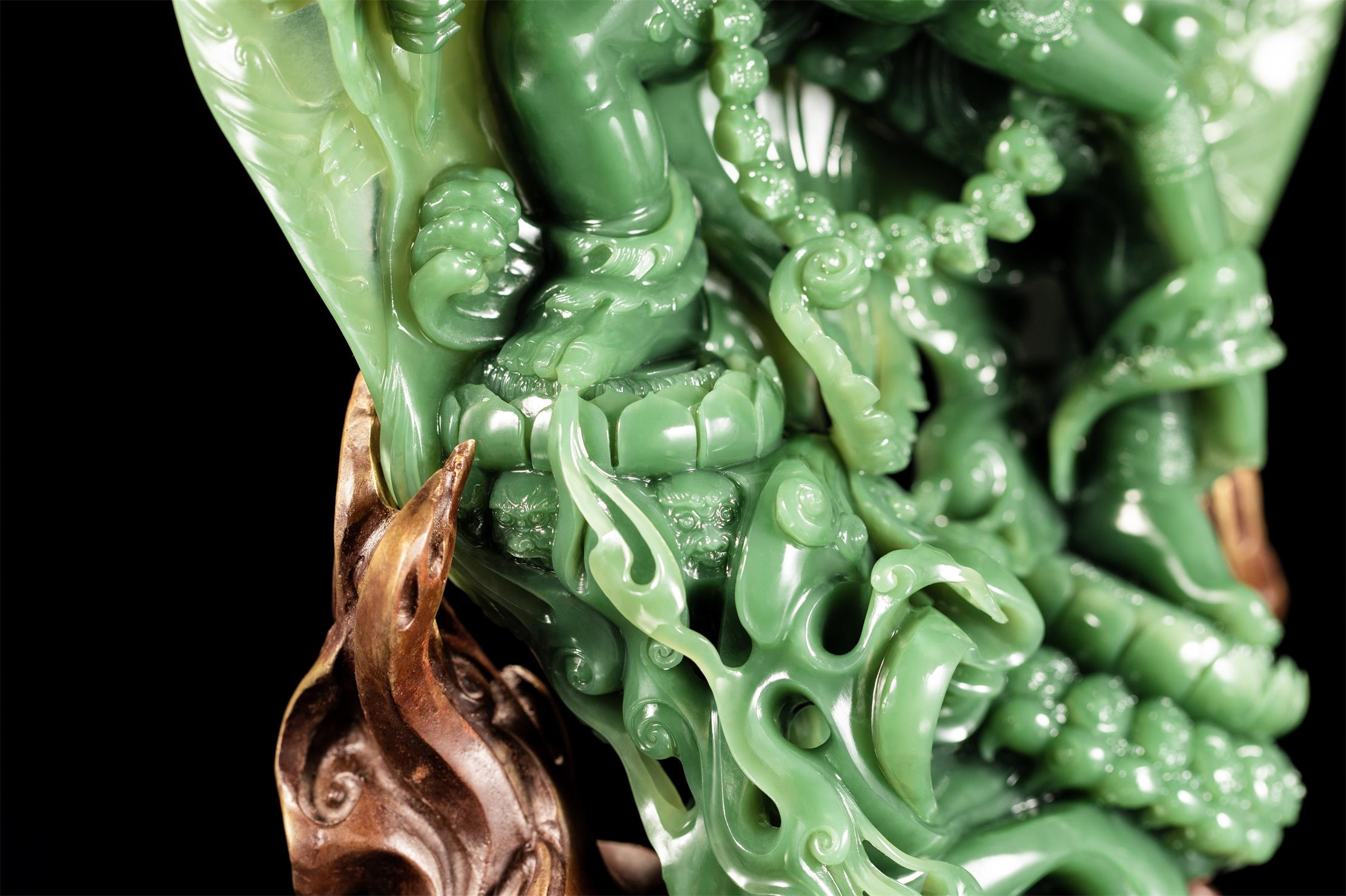 作者将一尊无论身形、法器、神态都有象征意义的、可佑天下苍生的造像提炼至卓绝,将析木玉材质的天然美发挥到极致,实为后人留下一件国宝级稀世珍品!