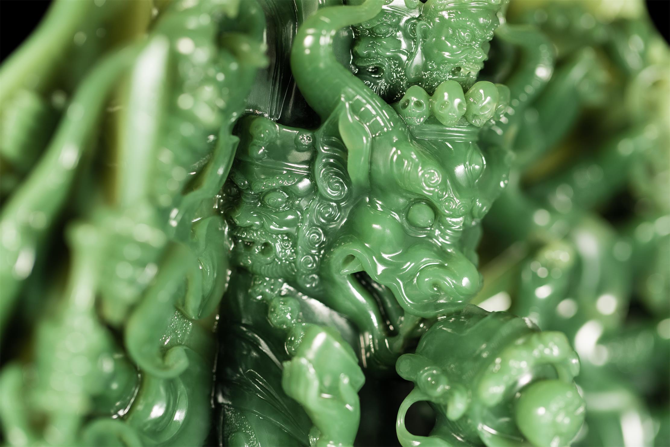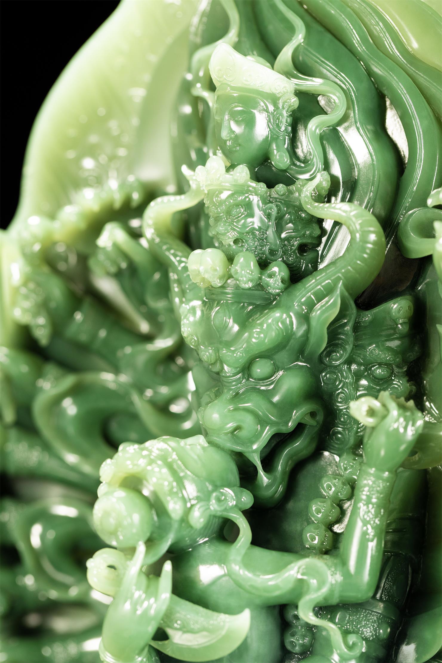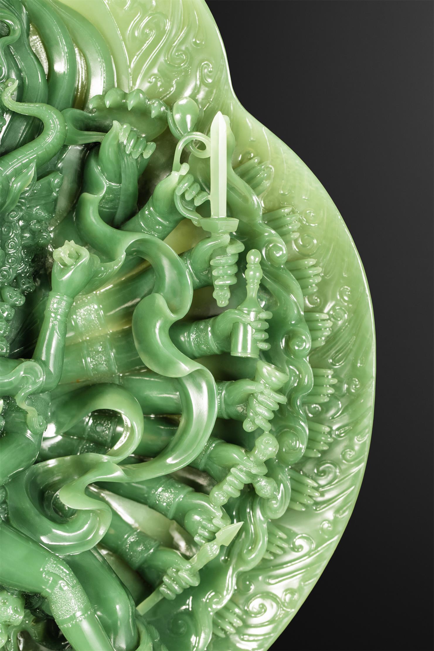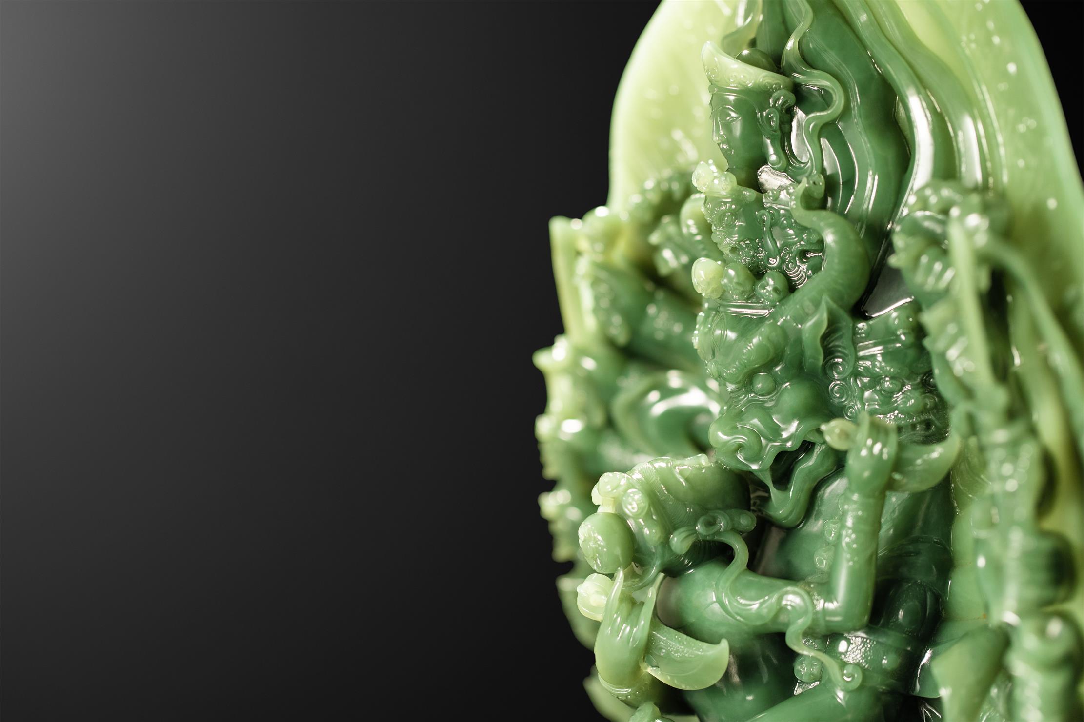 作者将一尊无论身形、法器、神态都有象征意义的、可佑天下苍生的造像提炼至卓绝,将析木玉材质的天然美发挥到极致,实为后人留下一件国宝级稀世珍品!