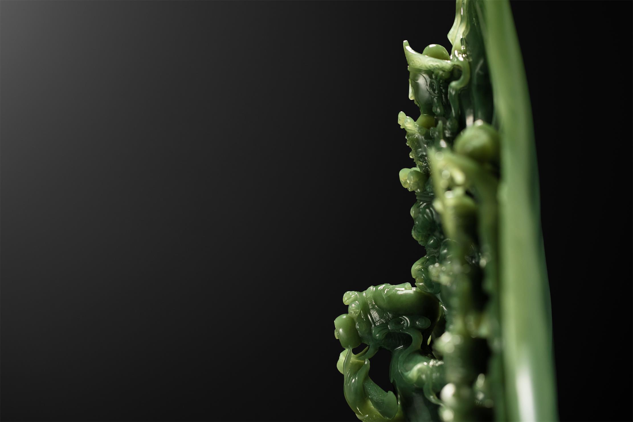 作者依料型匠心巧思,化纯净温润的析木玉为一团火焰,营造出动感和紧张气氛。