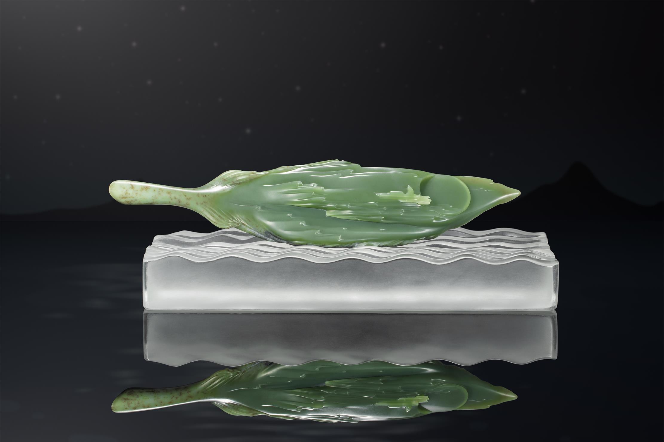 羽毛飘起,代表人生故事新的开启。而窄长的羽片中间,玉肉纯净无杂,细腻润美,仿佛是这片羽毛展开的新篇章。