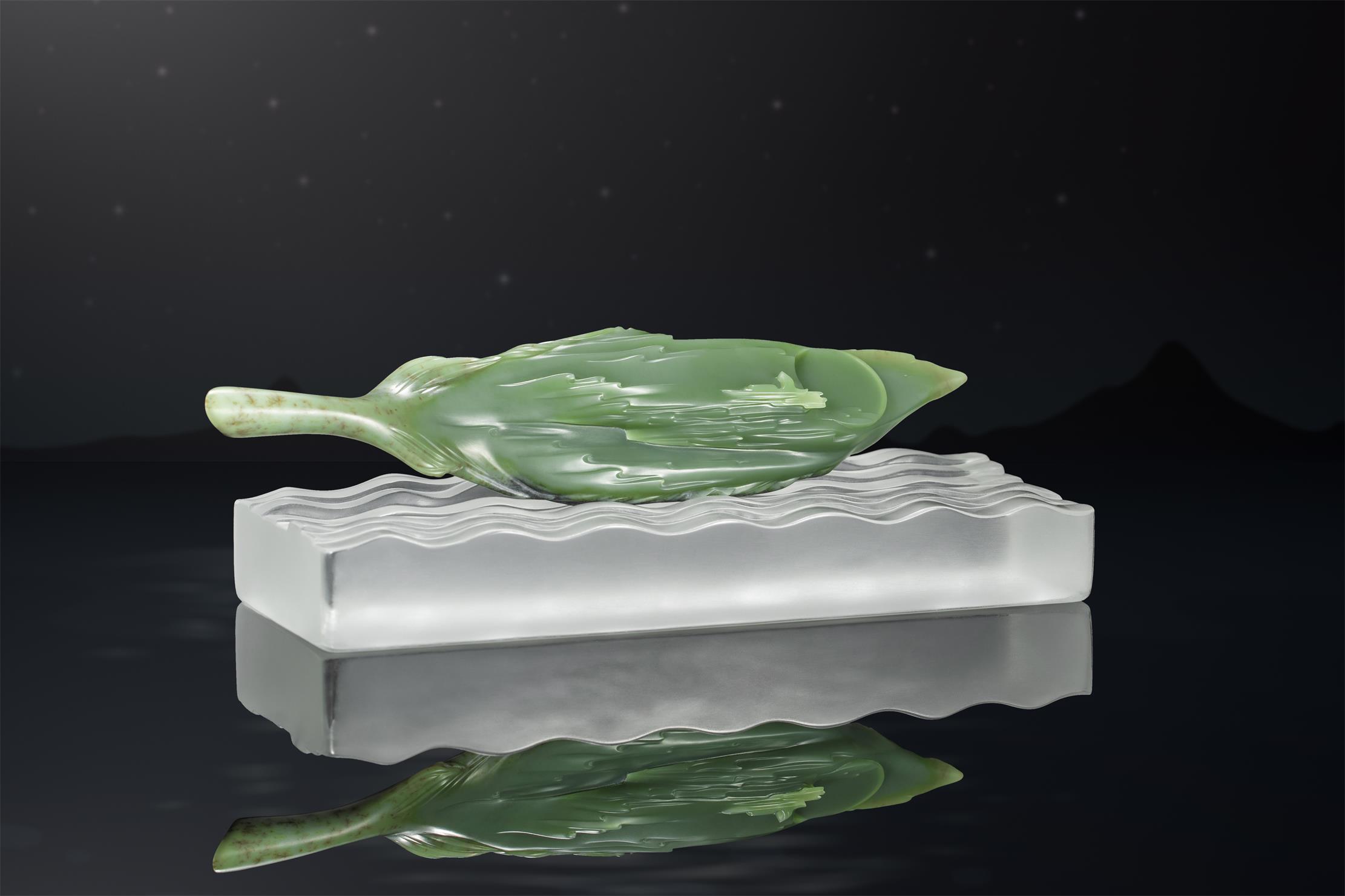 作品远观,造型奇特,是一个硬挺的羽毛形态,横摆于波纹潋滟的水晶底座上。