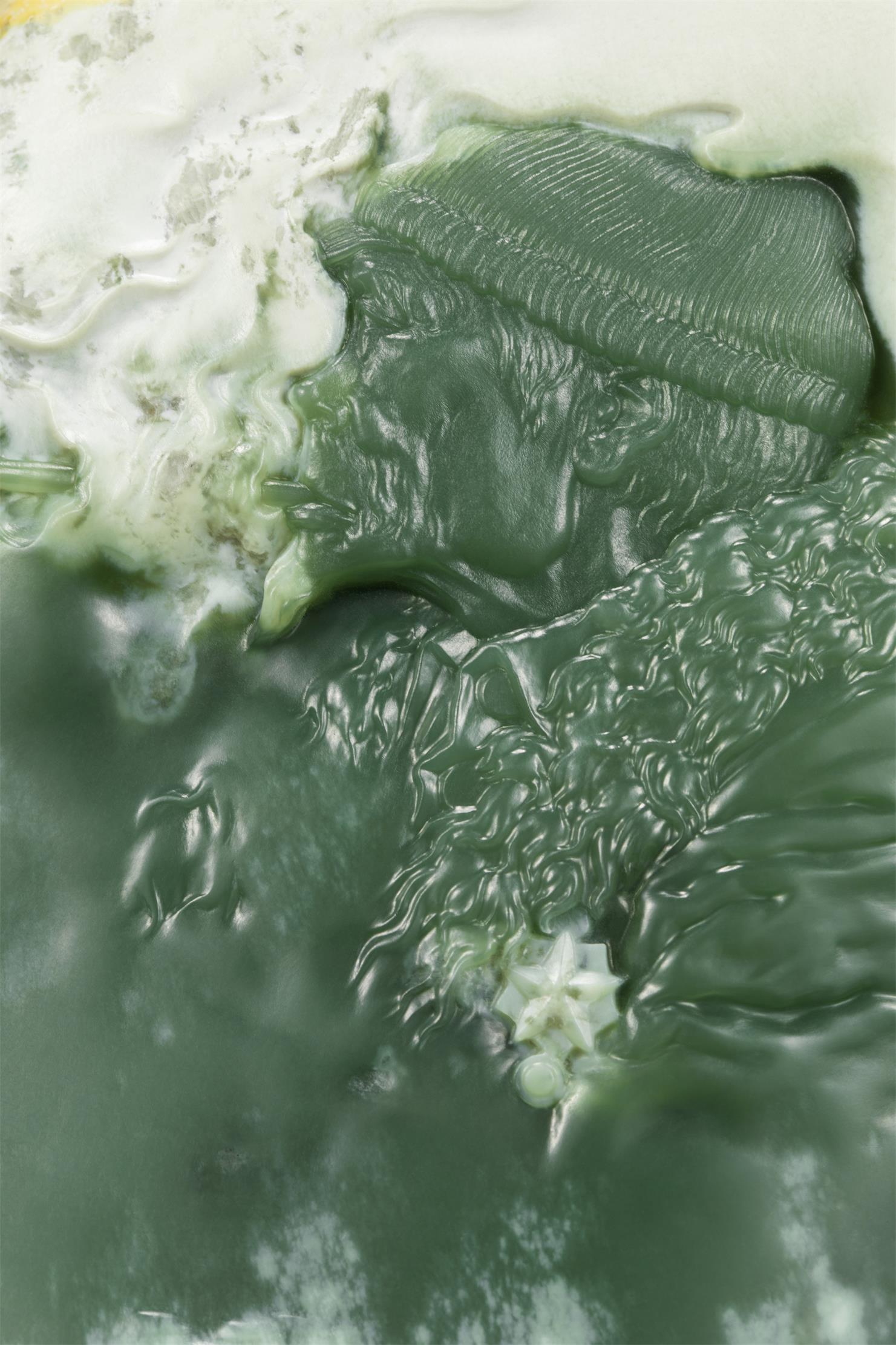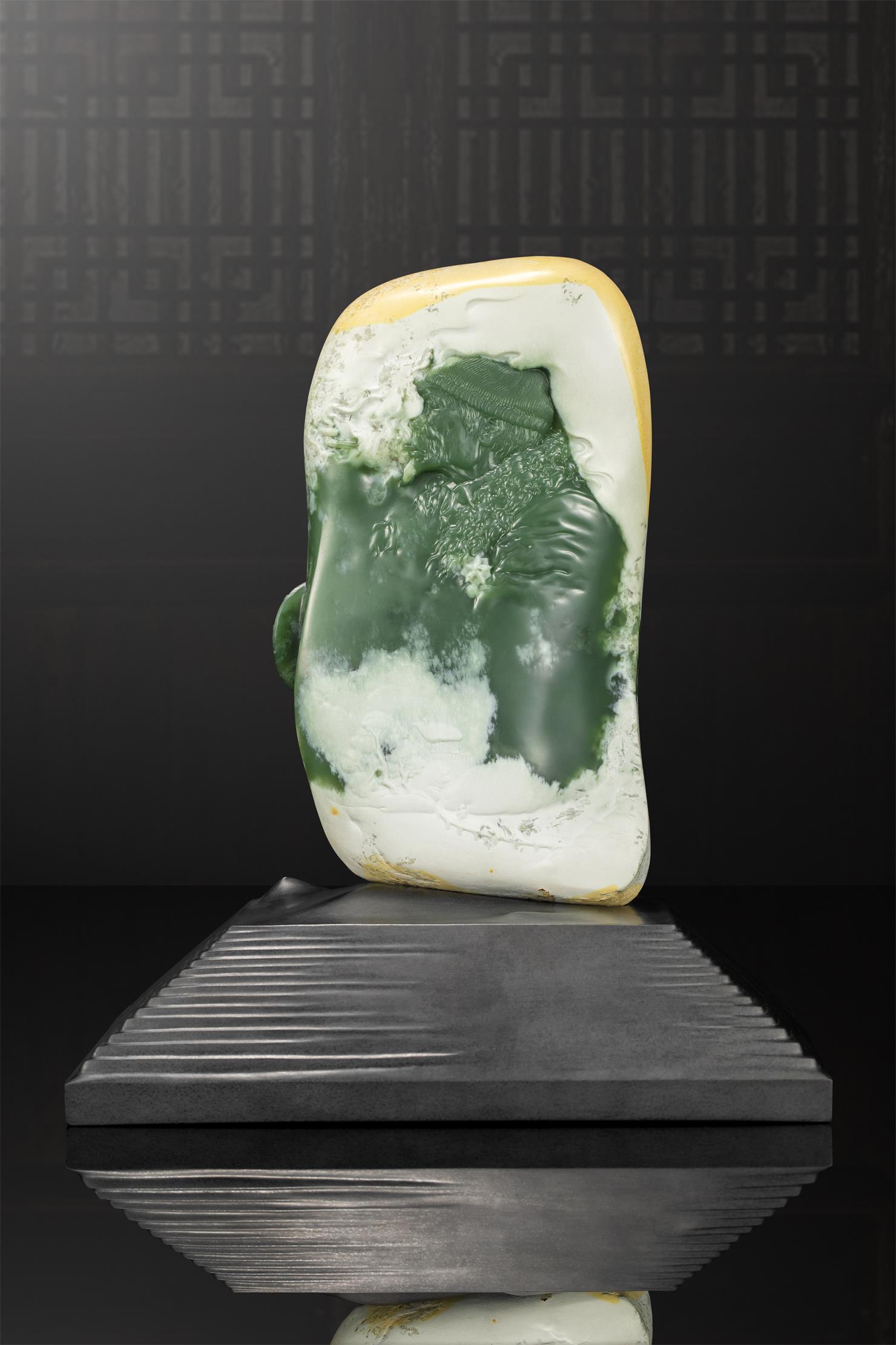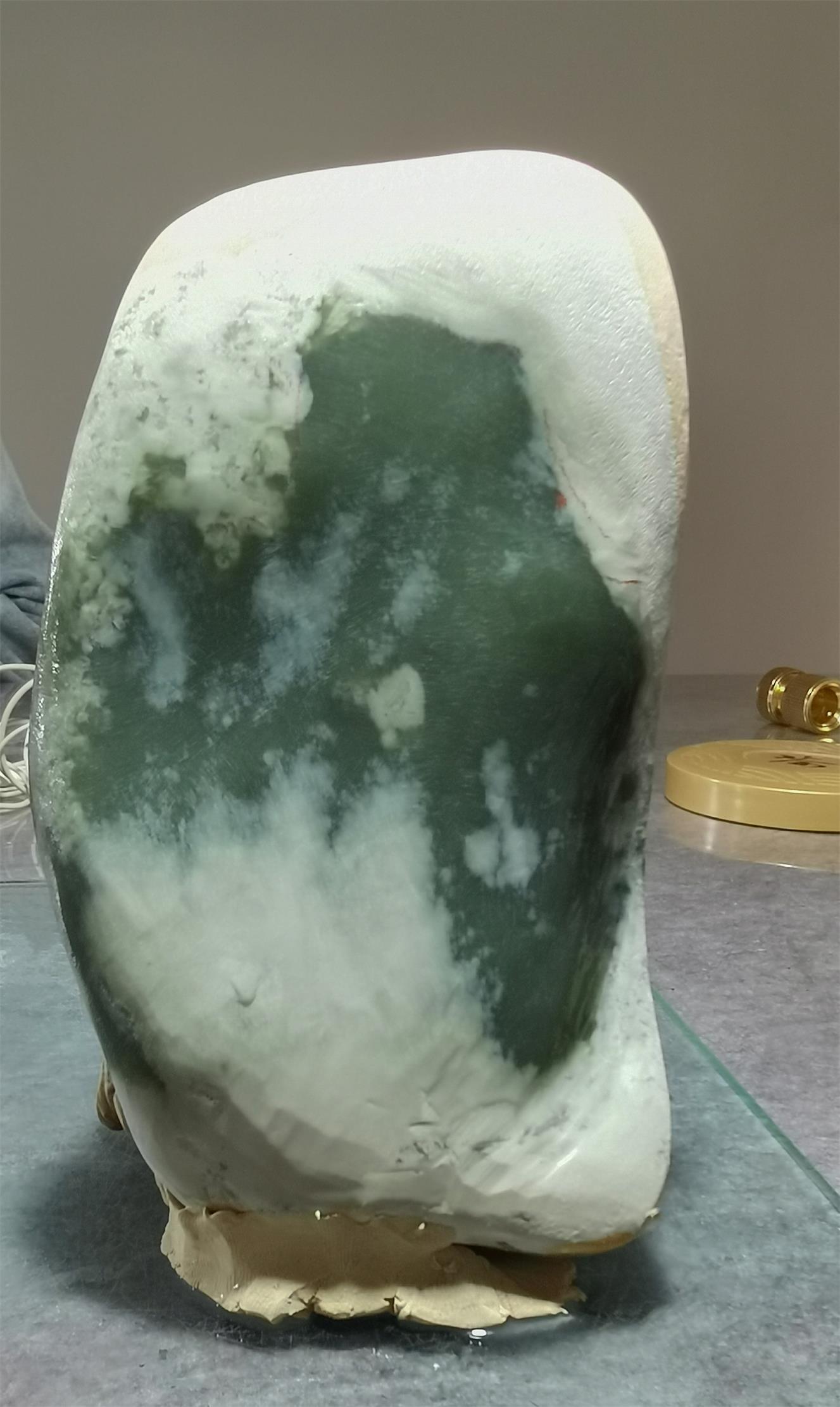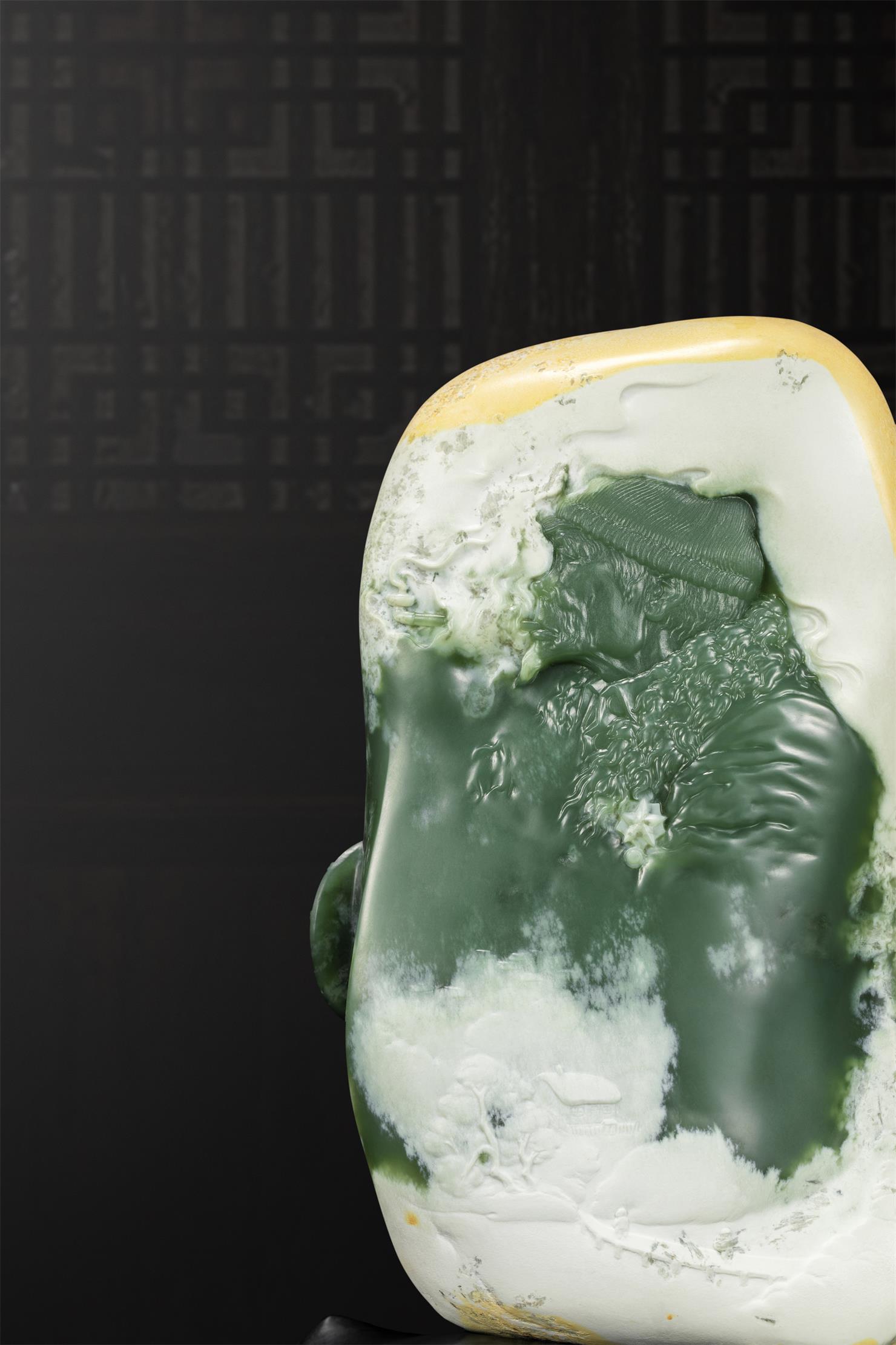 玉料剥皮后,金黄的细润皮子下,现出一周雪白的沁肉,恰似北方屋顶厚厚的积雪,其间包裹参差不一的绿肉,一眼如见一位老人的侧身肖像。