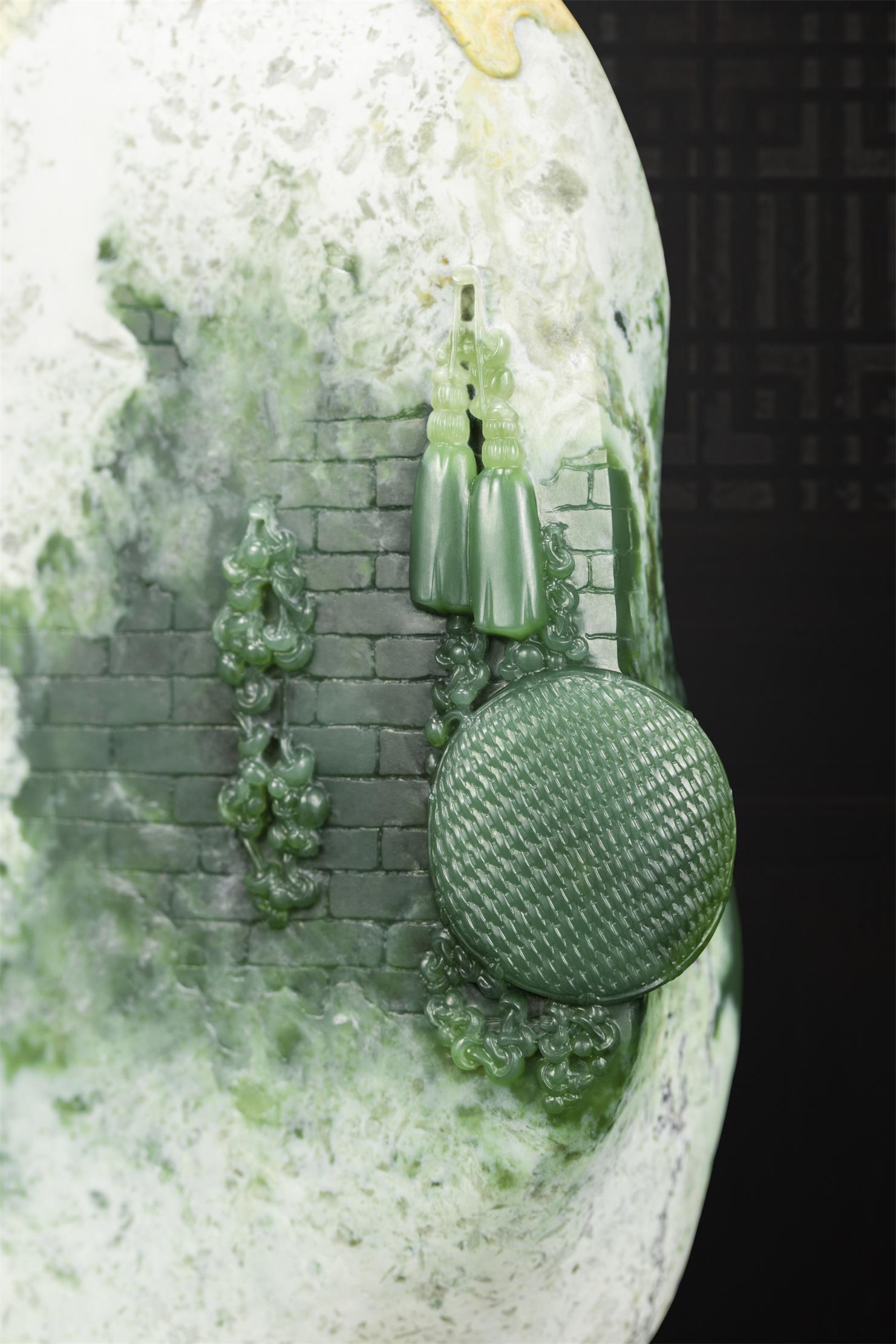 然后又在玉料下方的白沁上,刻饰乡村一角,渲染出主人公生存的大环境和那个时代的拼博精神。