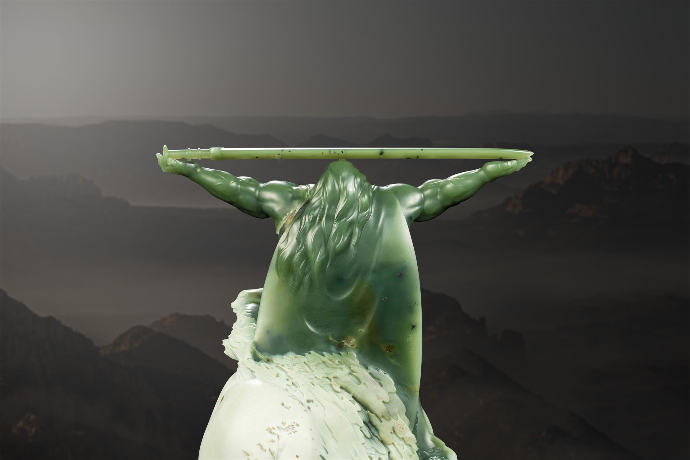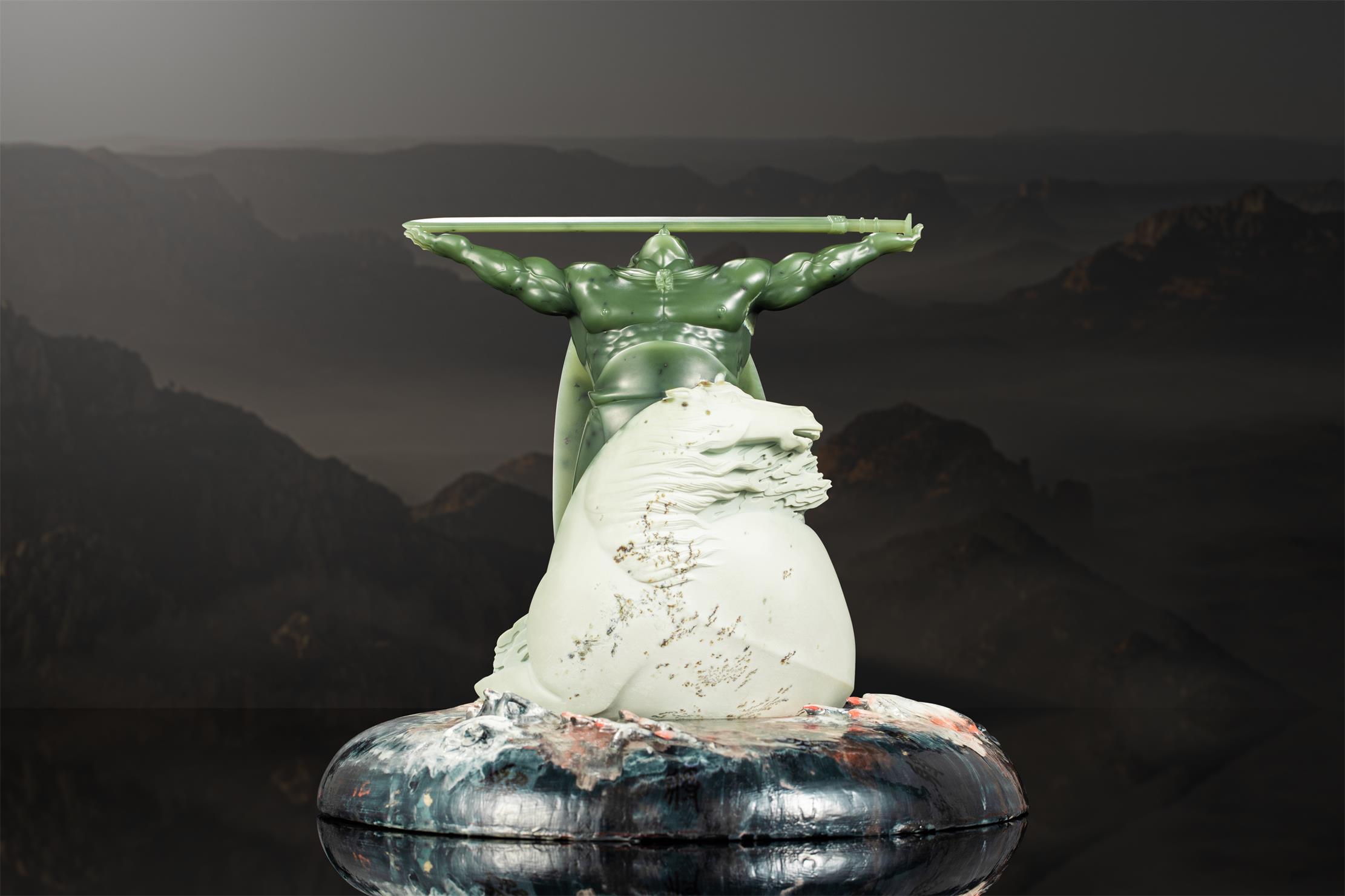 故此,中国玉石雕刻大师张庆东,以白皮绿肉的析木玉,打造出气势恢弘、具有震撼力的立体圆雕作品《王者》,谨以献新岁!