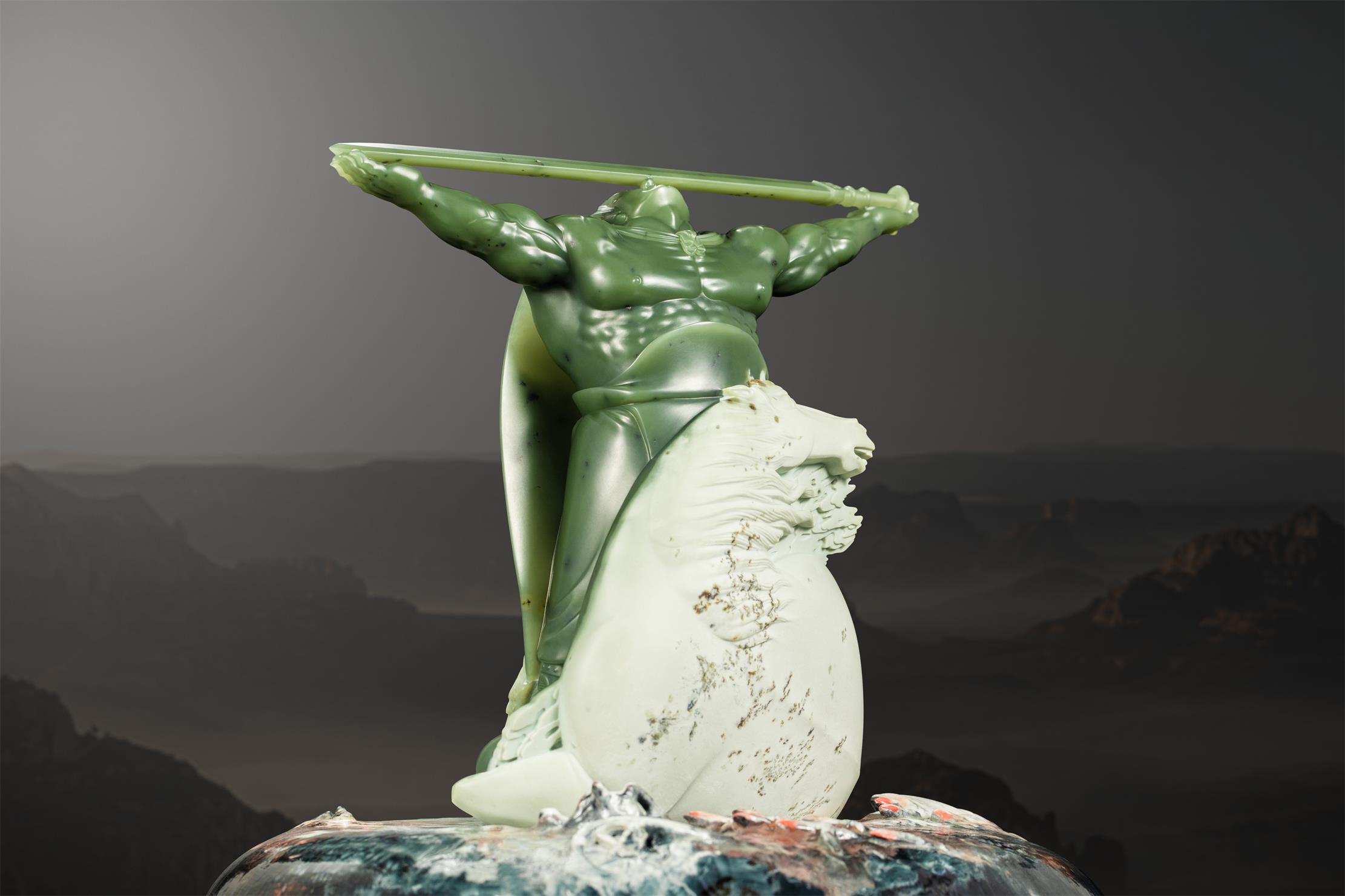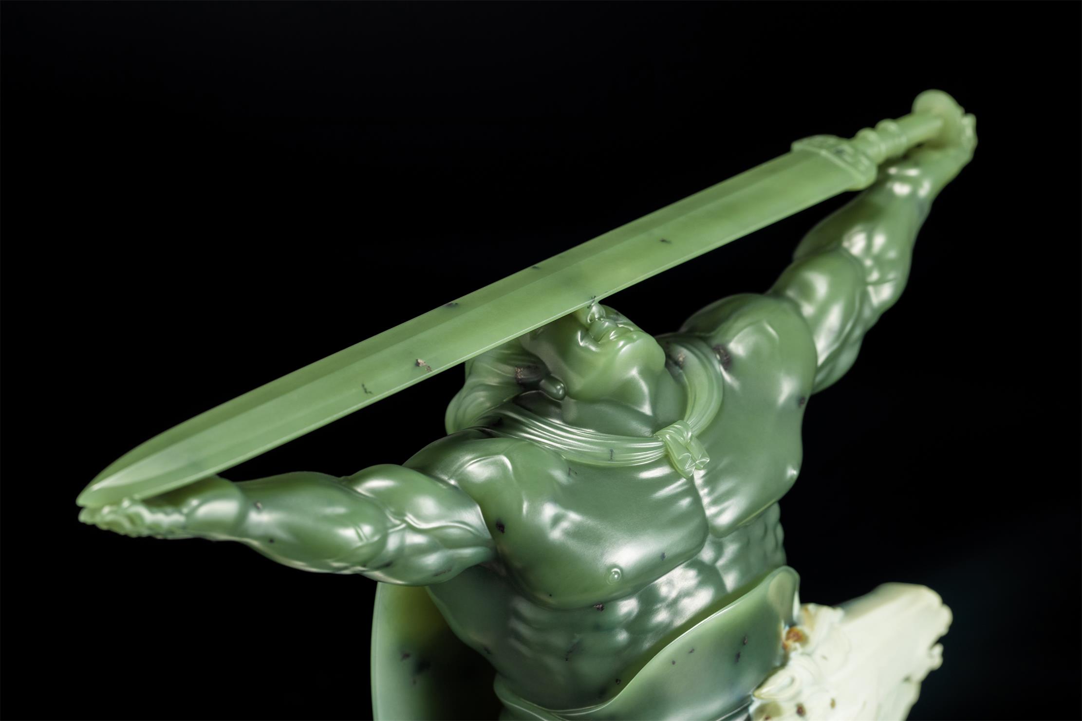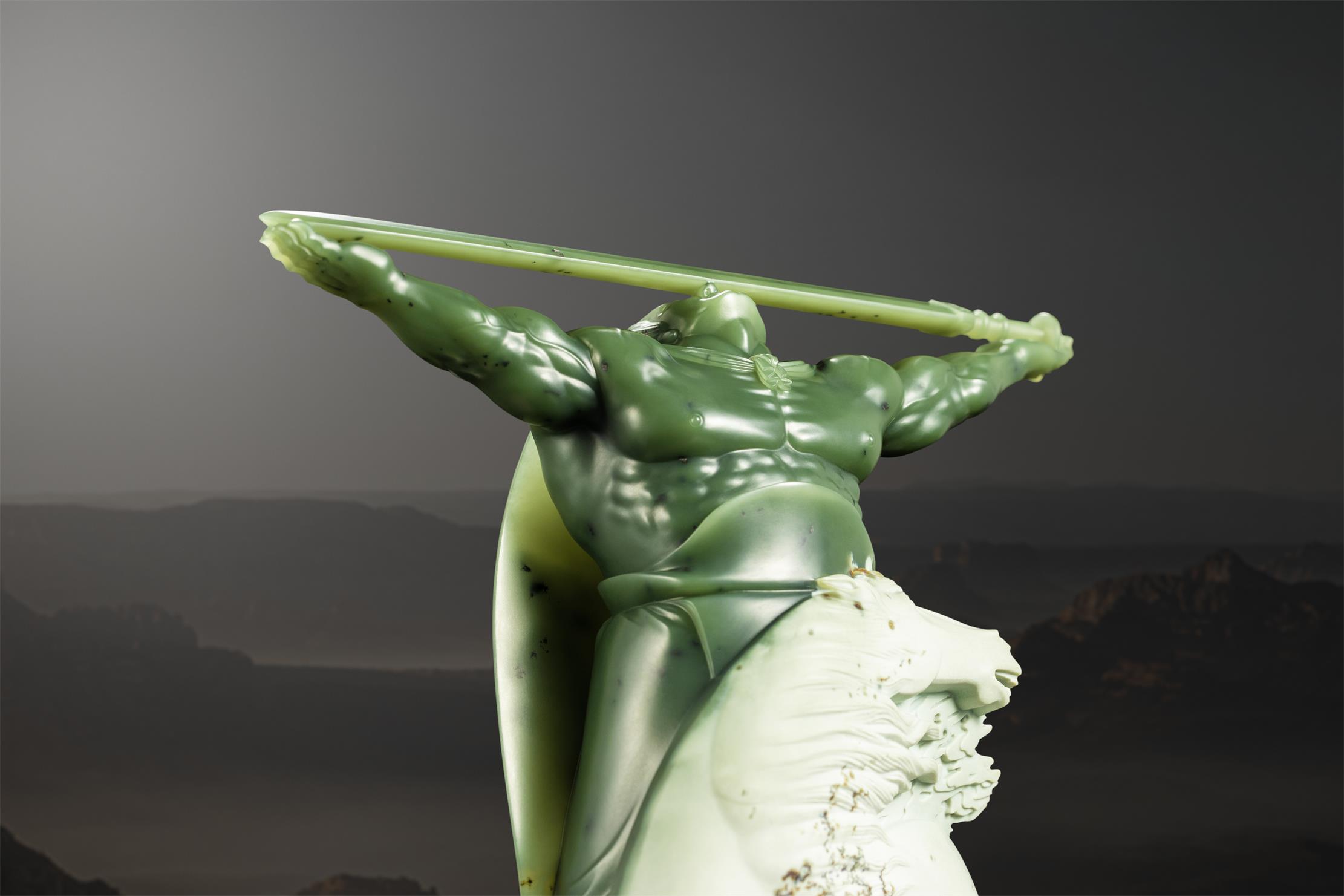作品《王者》,是作者随形巧雕、精心构思设计的,他将大面块的白皮,简雕成一匹马的上半身;以温润似羊脂的绿色玉肉,侧重刻画战无不胜的勇士。