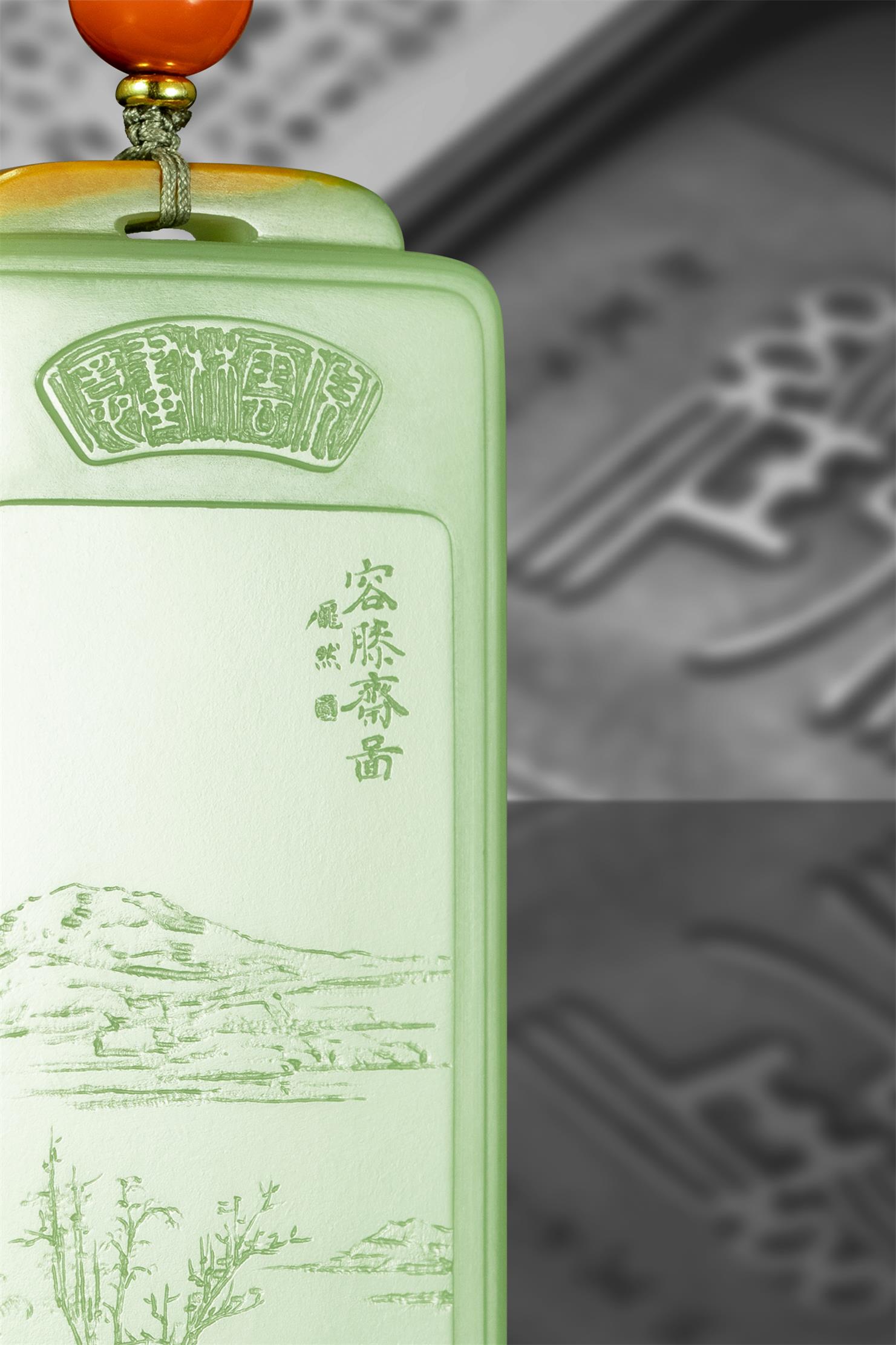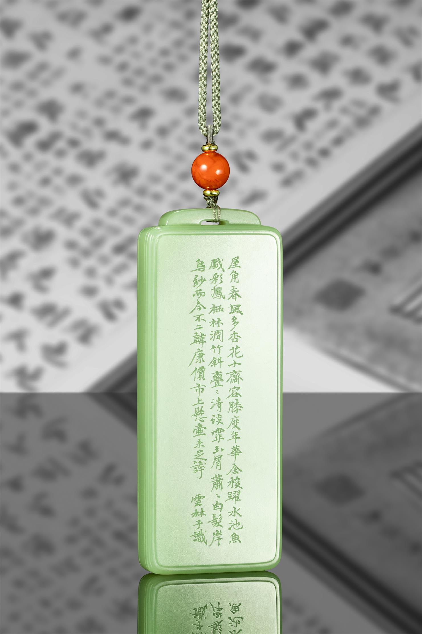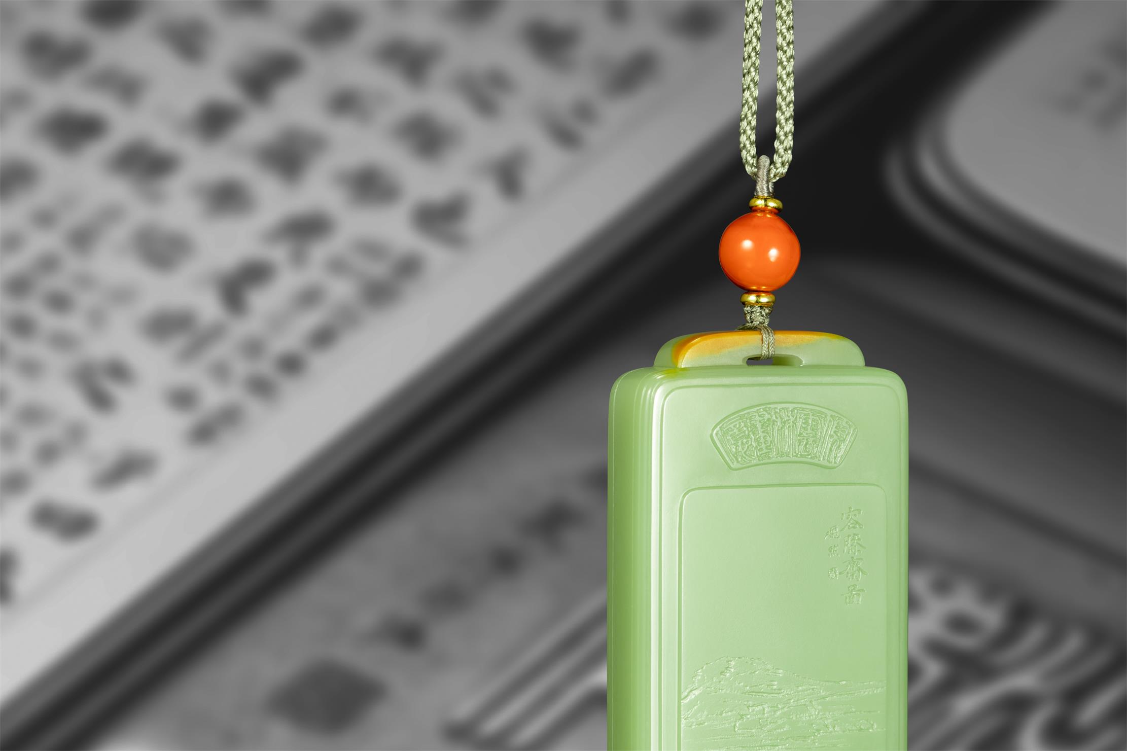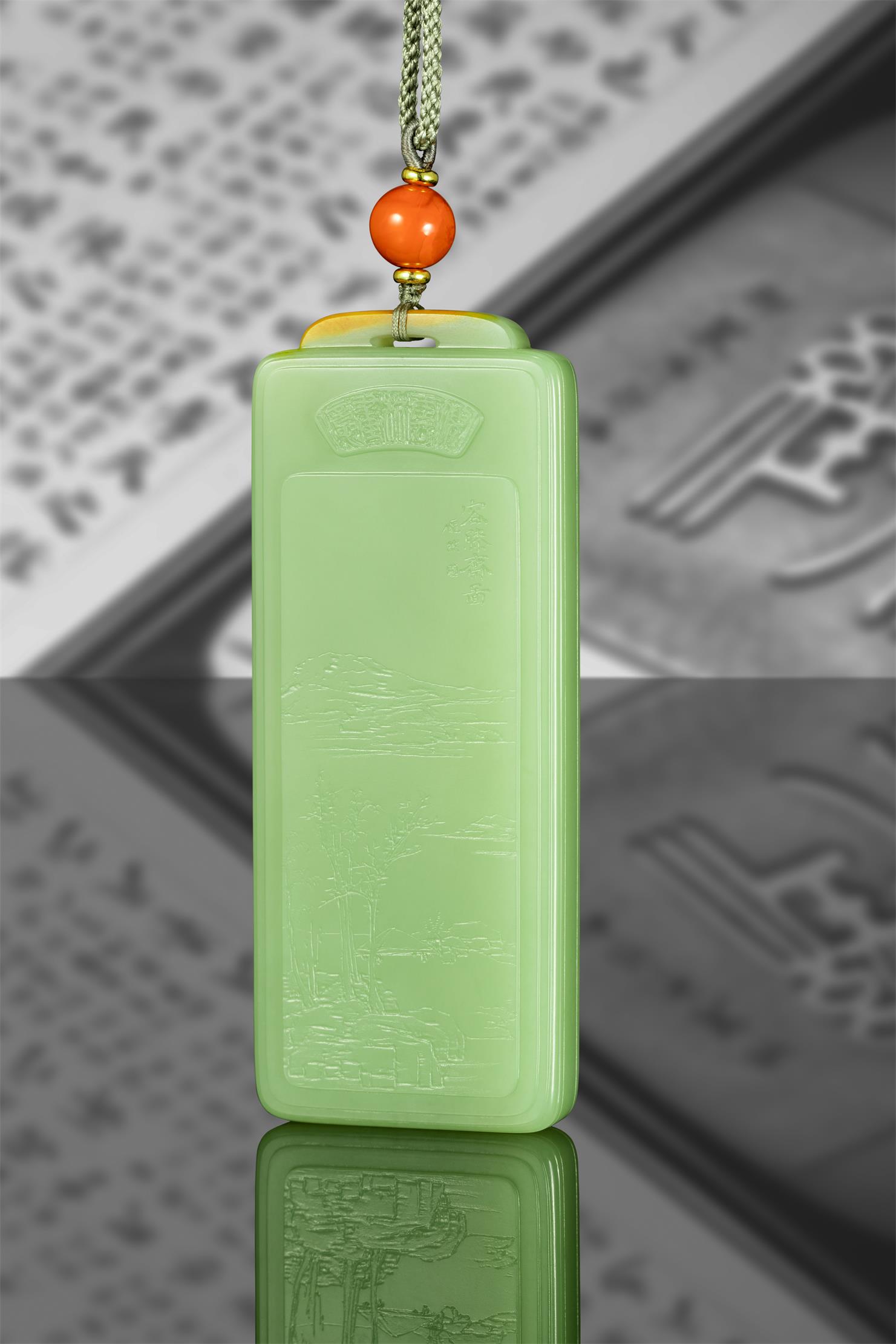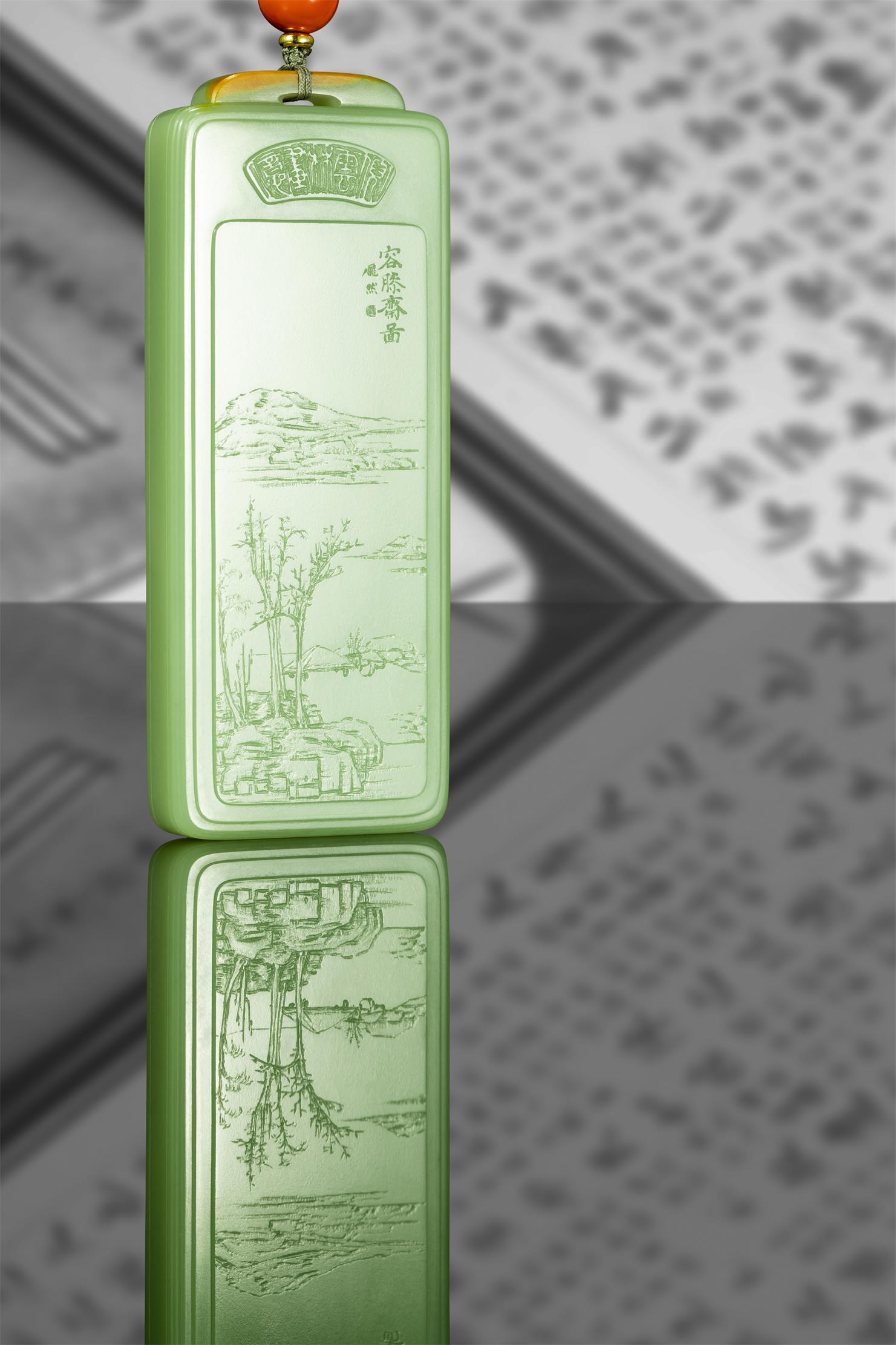 作者在洒金皮的长方形析木玉料上,还原倪瓒画作风貌,用爽朗的线条分割出牌头和玉面。