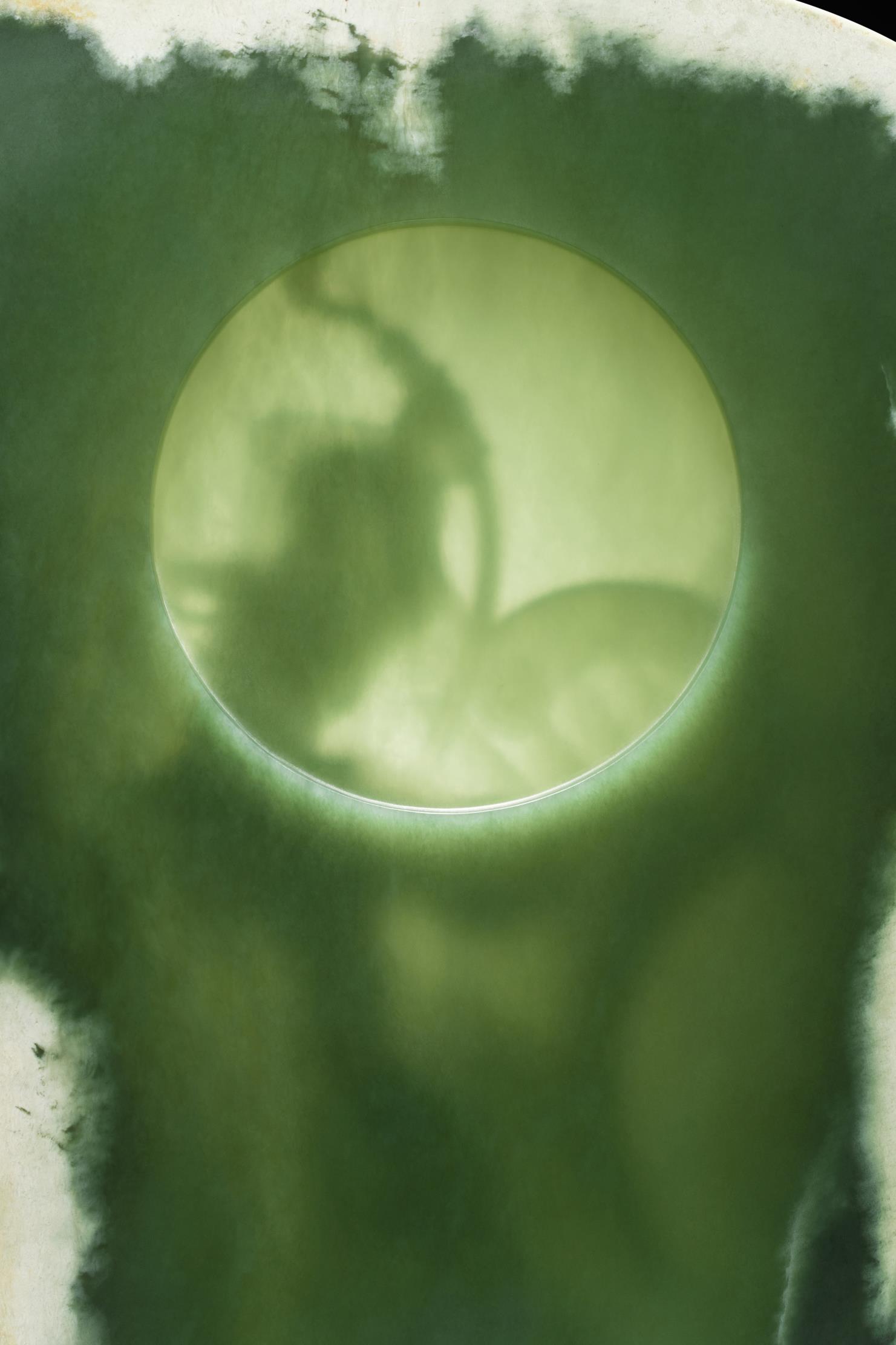 透雕作品的一面,被磨出平滑质感,并阴刻了一个大大的圆于留白的宽阔天宇上,营造烈日当空、戈壁无遮的氛围,同时彰显出料性的细腻油韧。