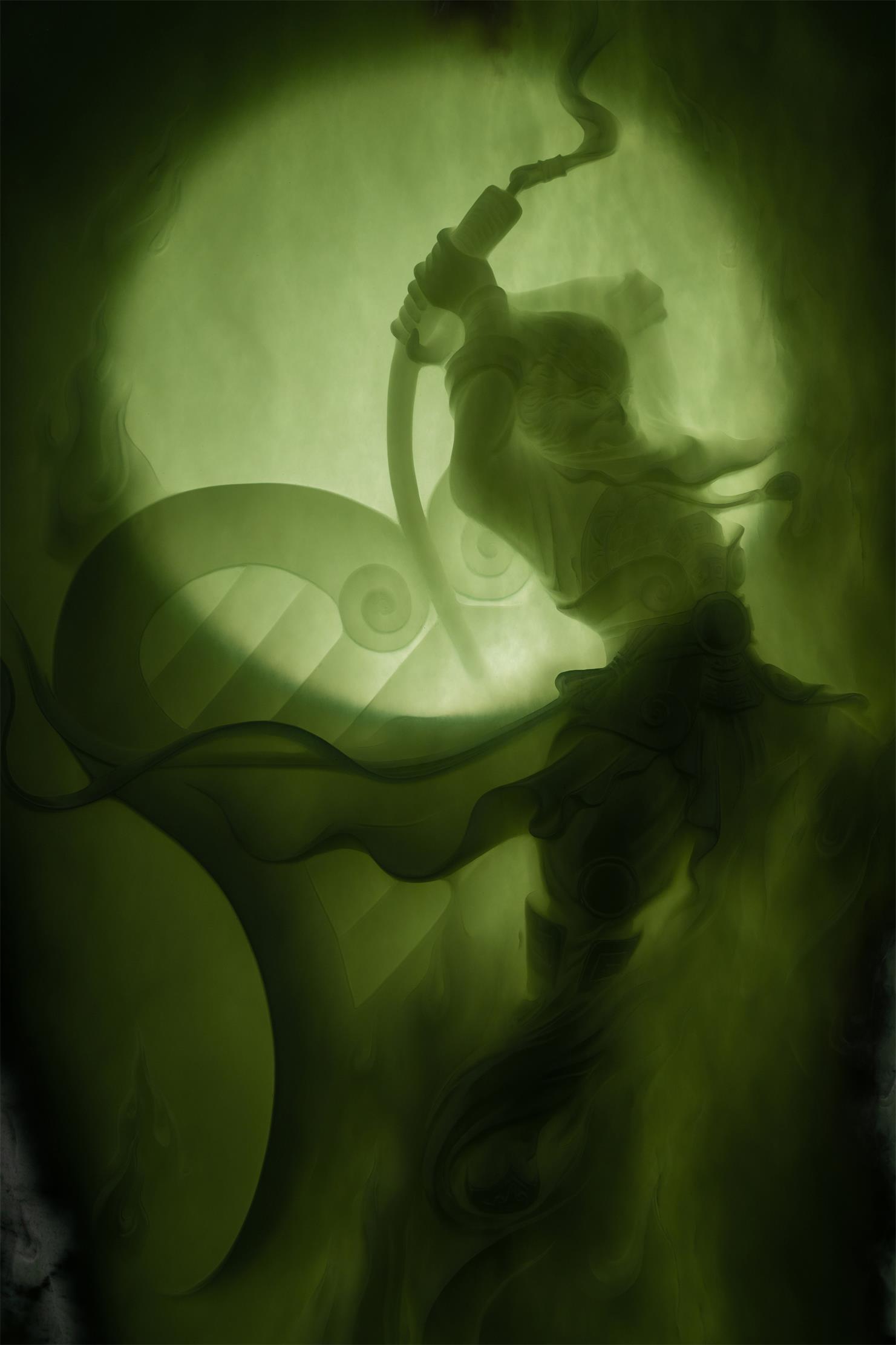 作品整体造型别致唯美,构图奇妙独到,刻画精细入微、虚实相应、动静互补,加之线条的丰富多变和极具神彩的人物刻画,使作品流露感人的艺术张力与神话意趣,展现出创作者极高的艺术造诣。