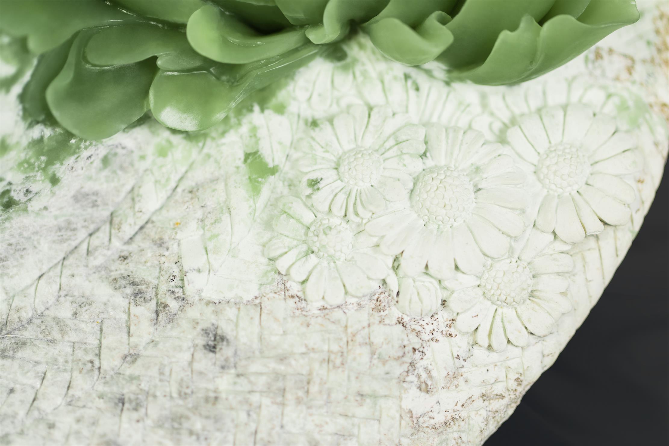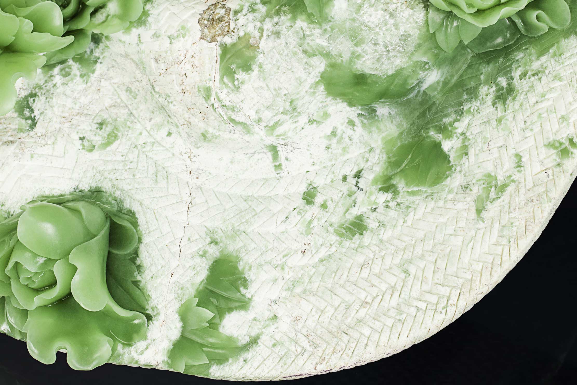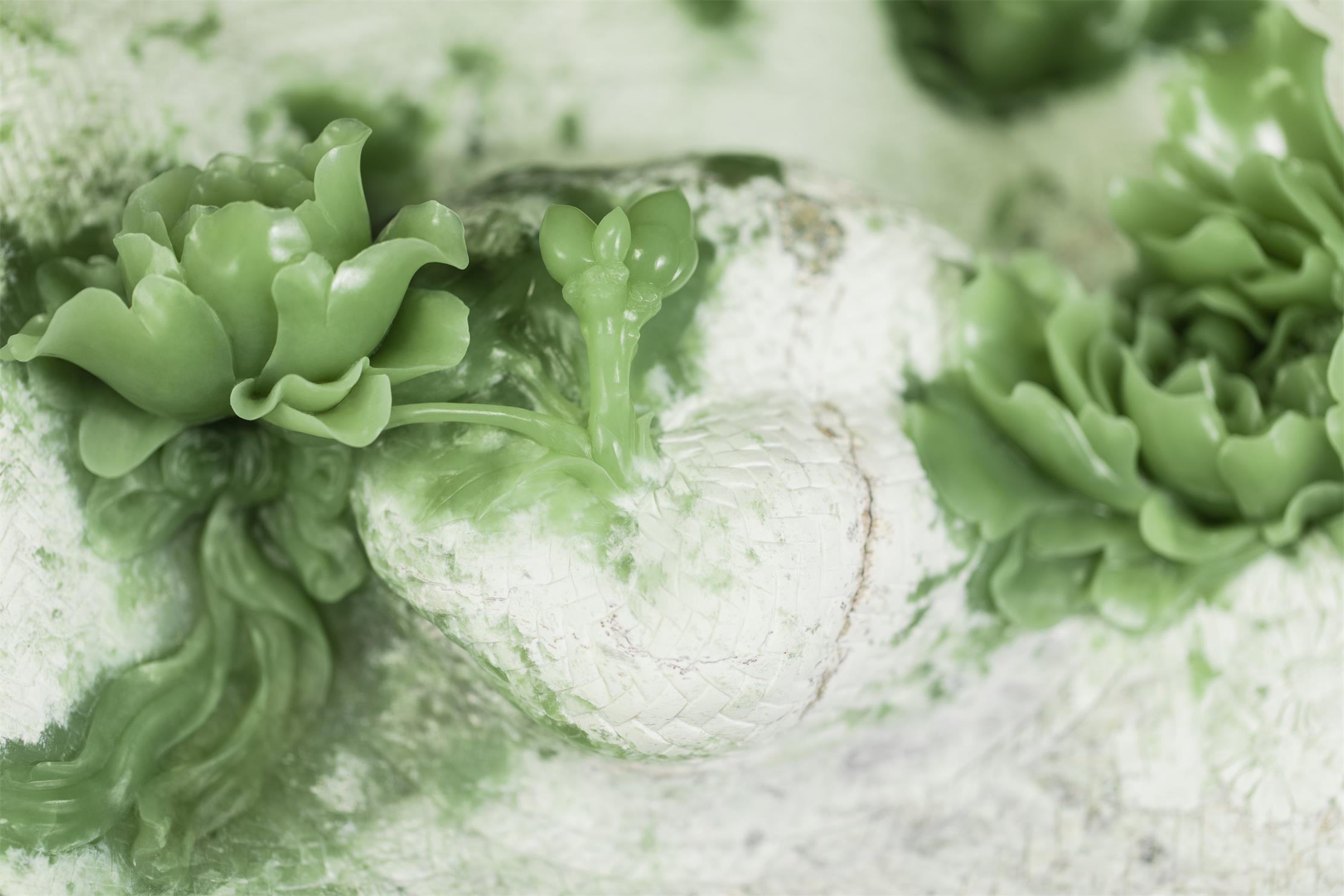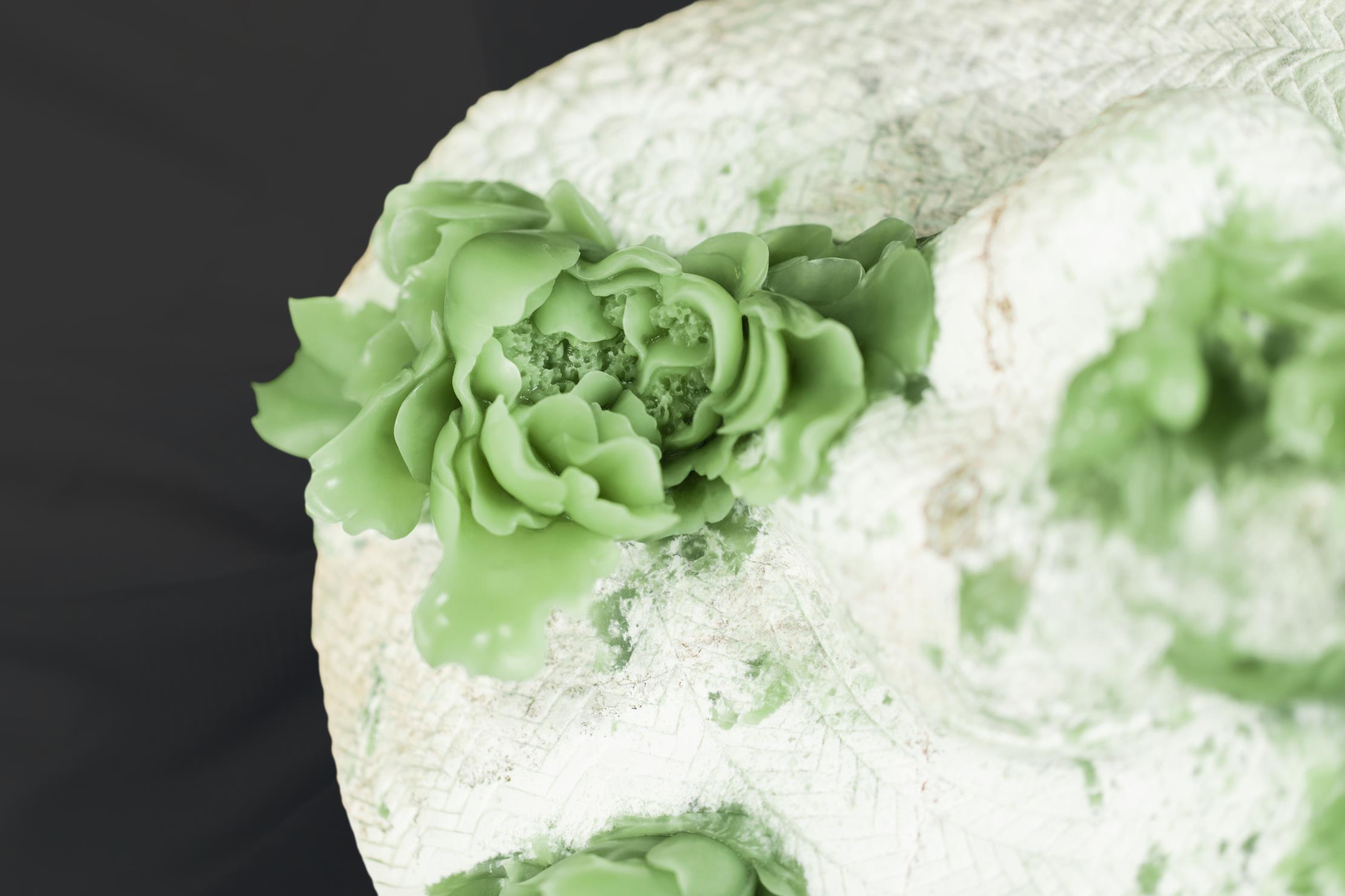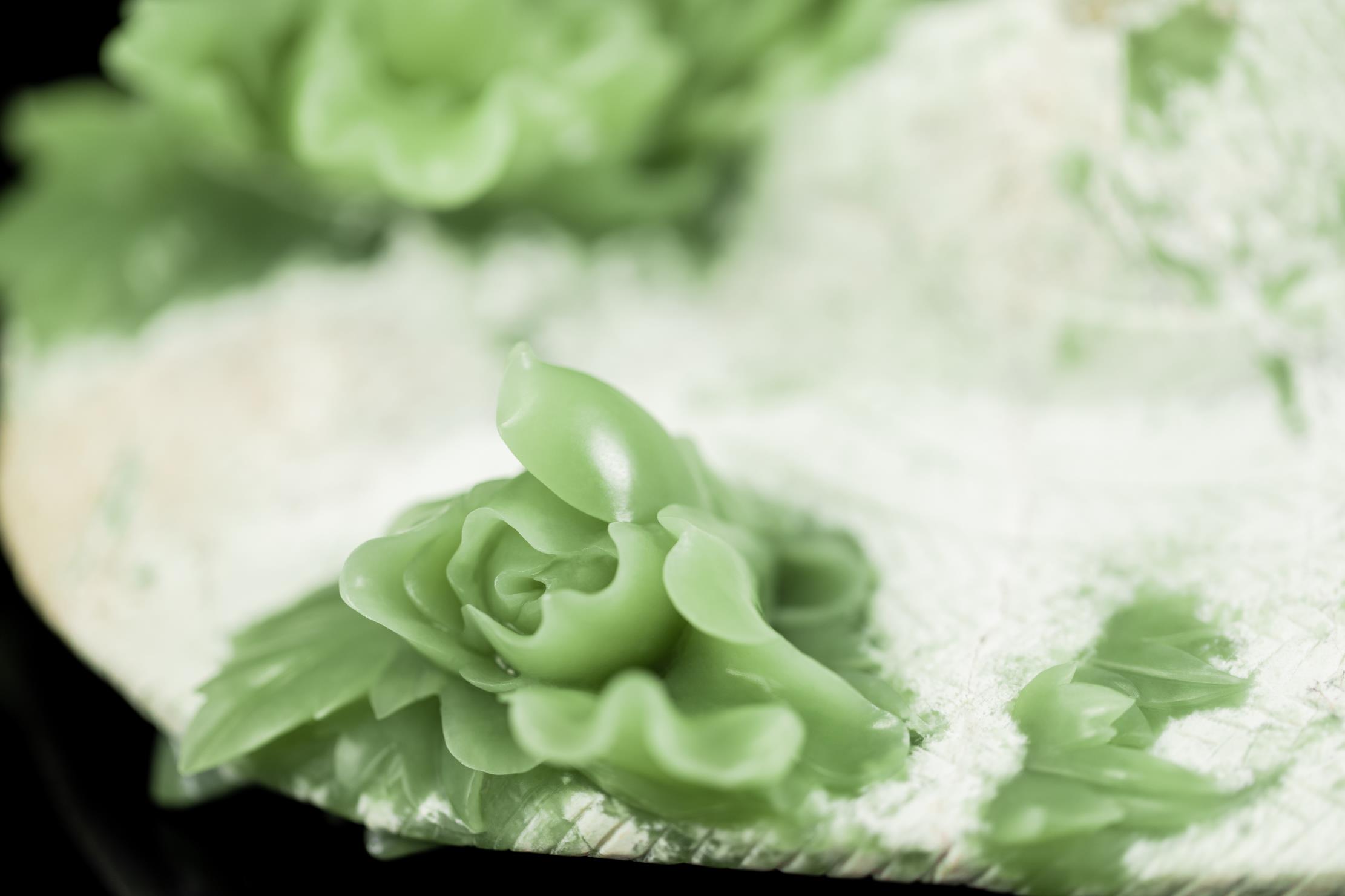 清丽、匀净、细腻的绿色玉肉,鲜活了牡丹的姿态。