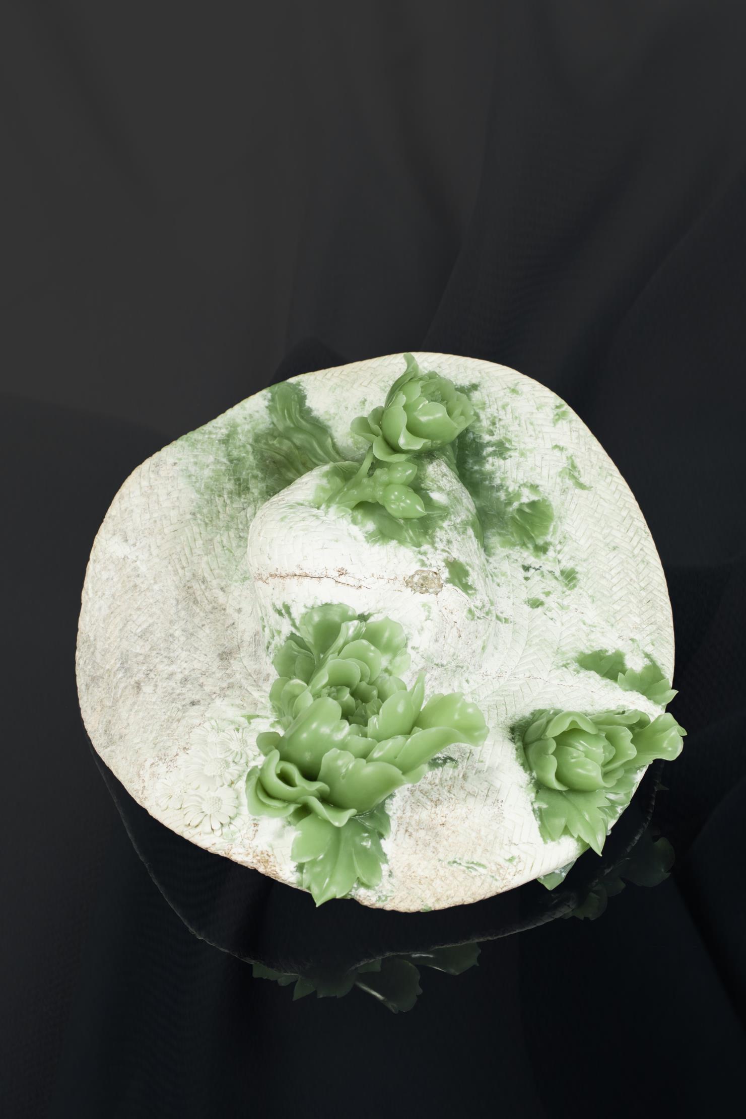 令人心花怒放的是,白中透绿的帽子上,竟然盛开几朵“国色天香”的大牡丹。