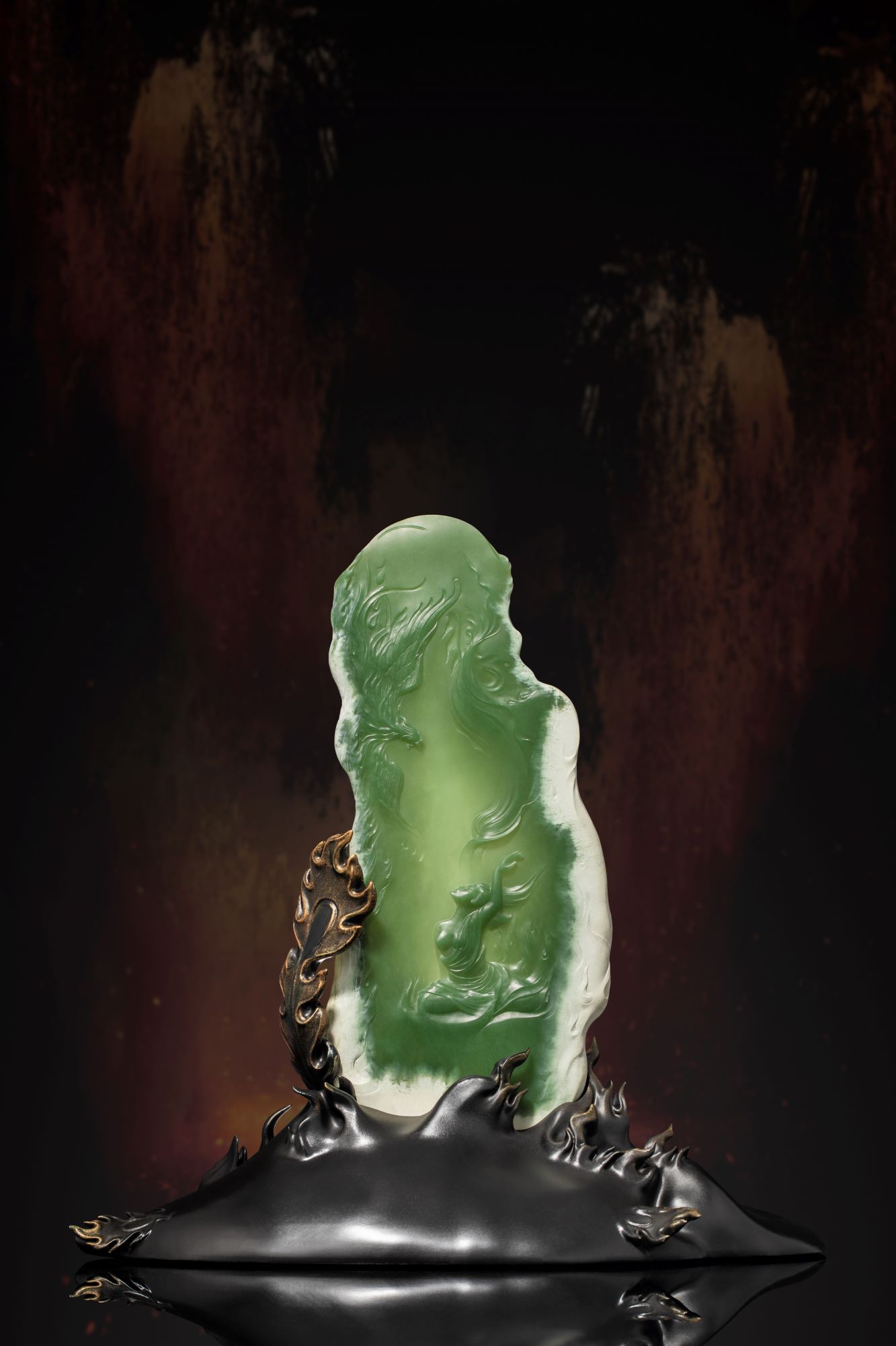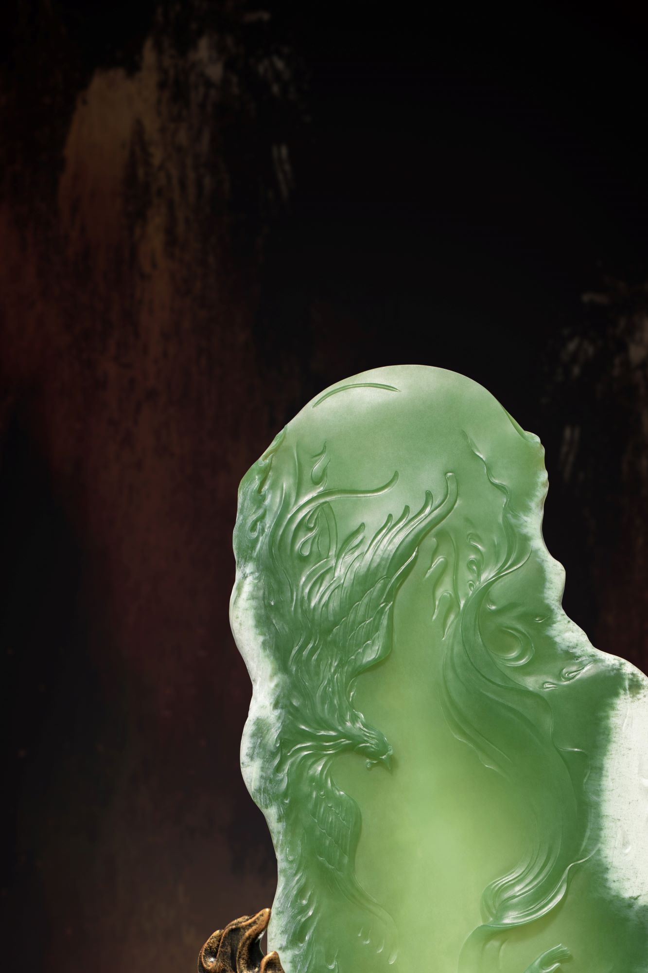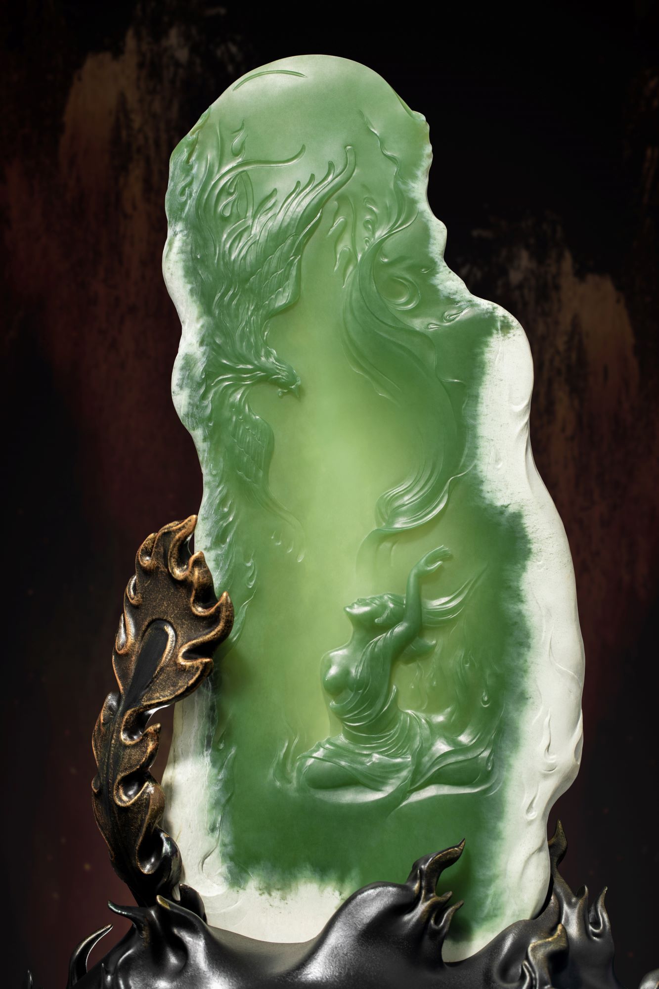 不规则的绿色析木玉石,化作了正在承受浴火之苦的凤凰女神和展翅重生的凤凰。其整体外形与底座相呼应,也如一只从浴火中振翅翱飞的凤凰。