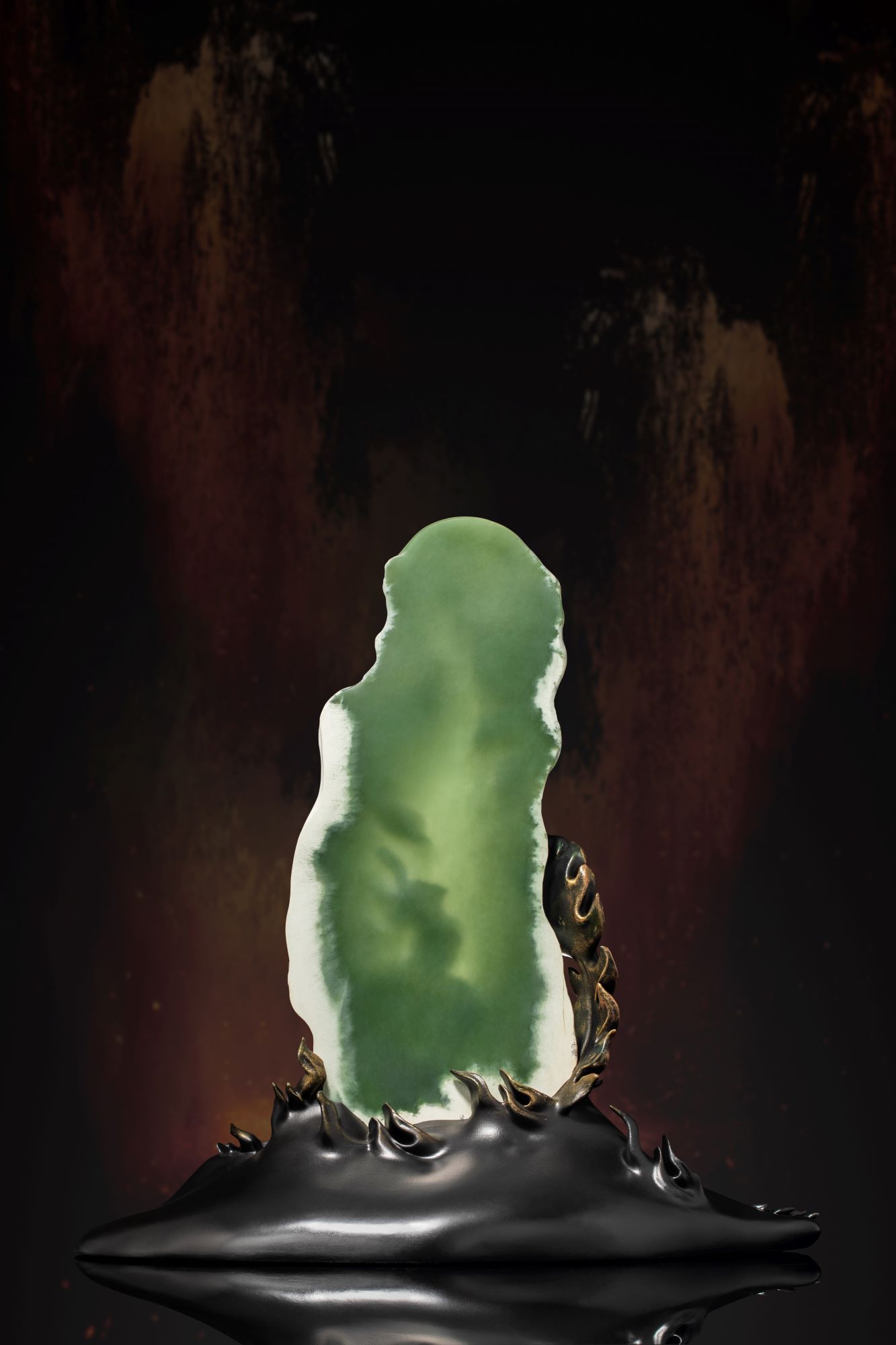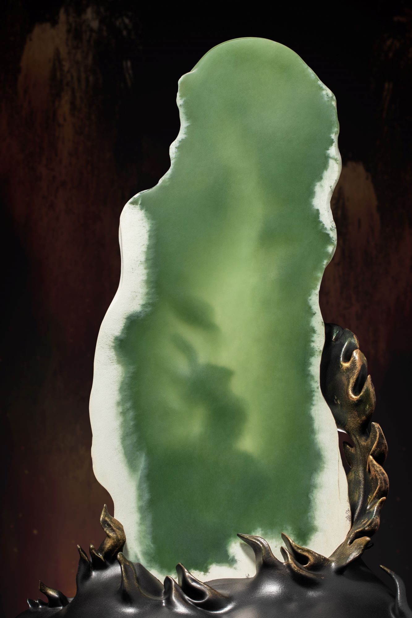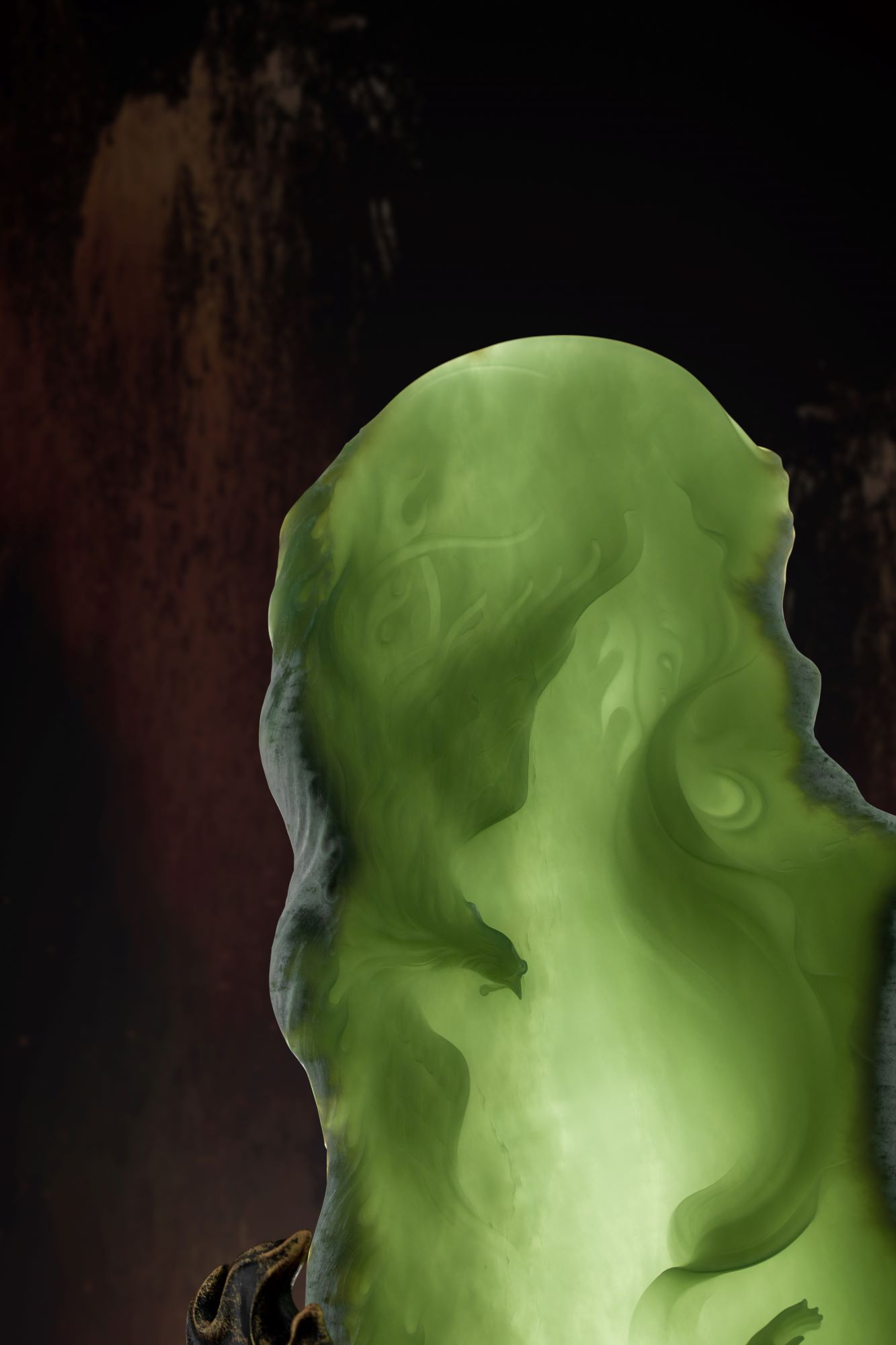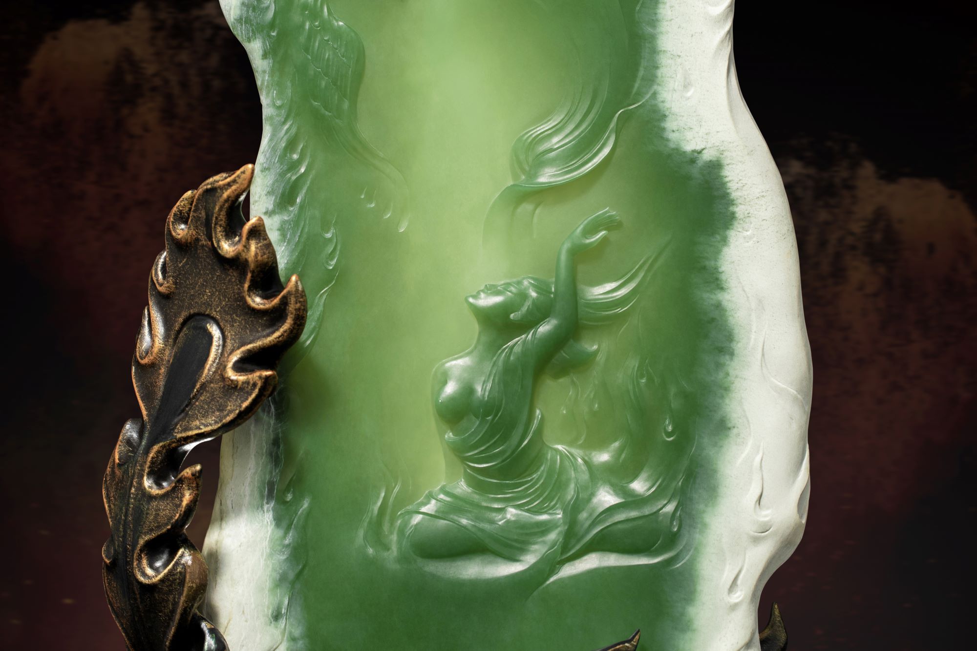 不规则的绿色析木玉石,化作了正在承受浴火之苦的凤凰女神和展翅重生的凤凰。其整体外形与底座相呼应,也如一只从浴火中振翅翱飞的凤凰。