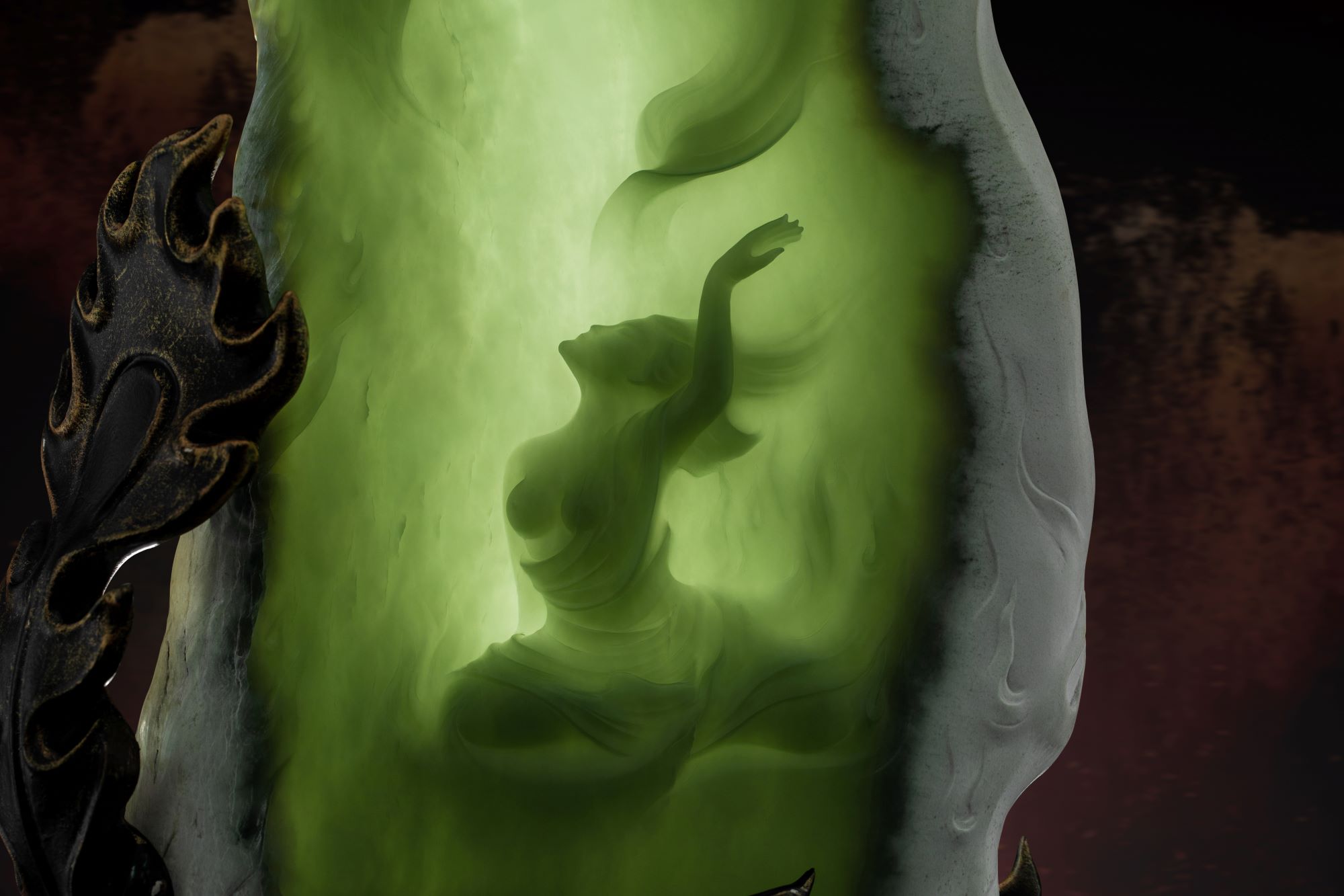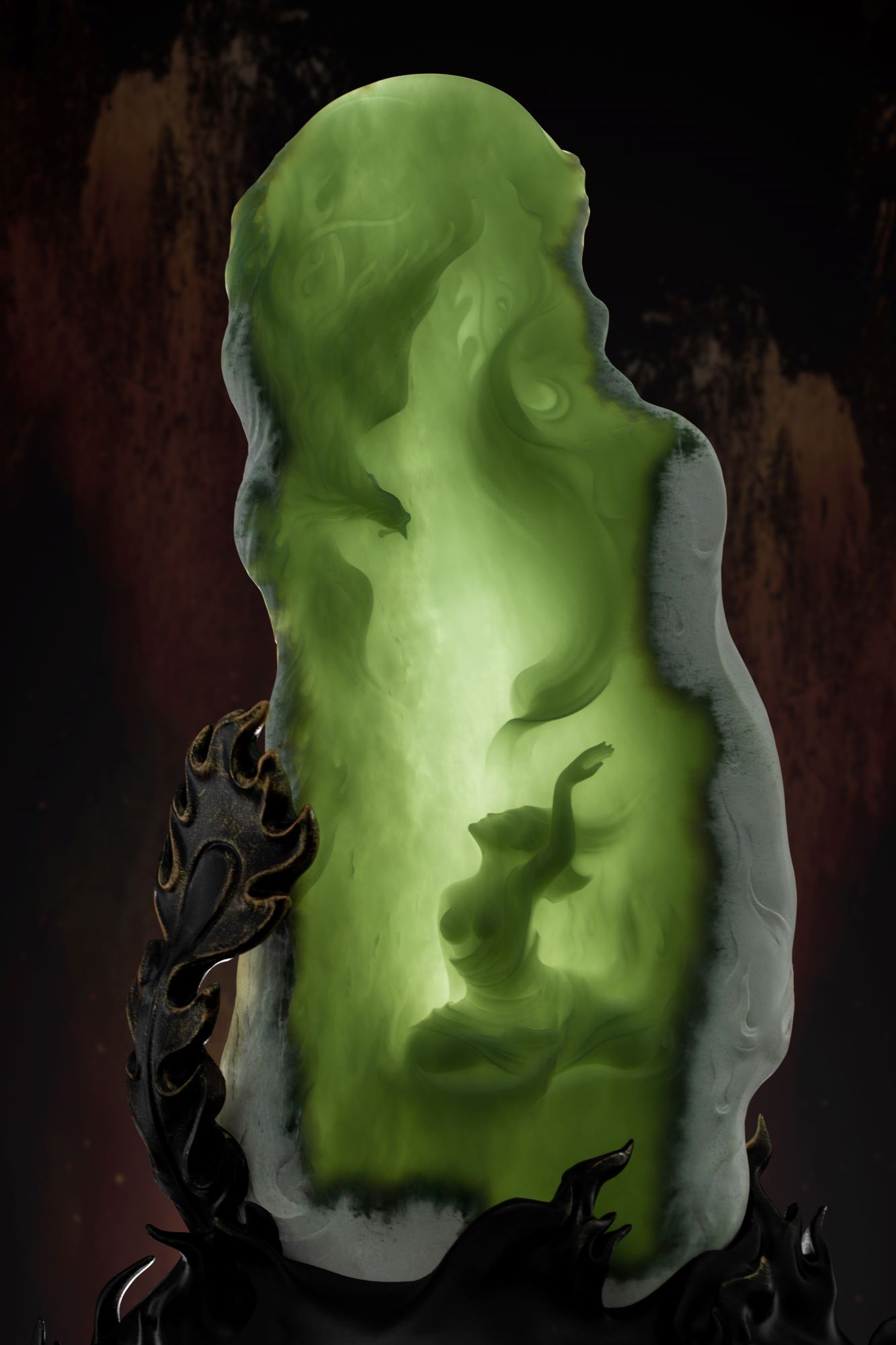 火焰中隐约可见一只凤凰展开双翼,紧紧拥擎起一颗蓊郁如新生的析木玉。