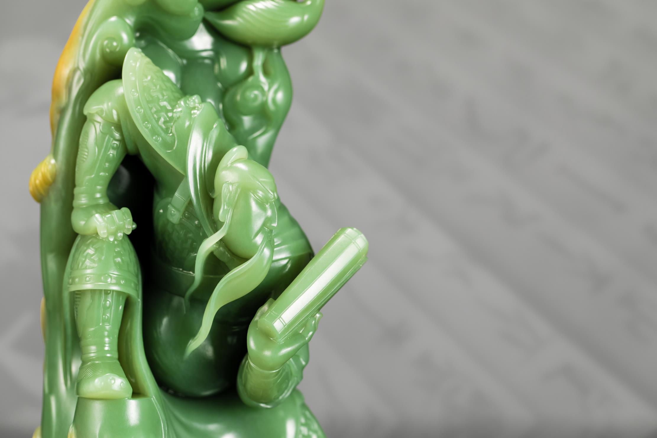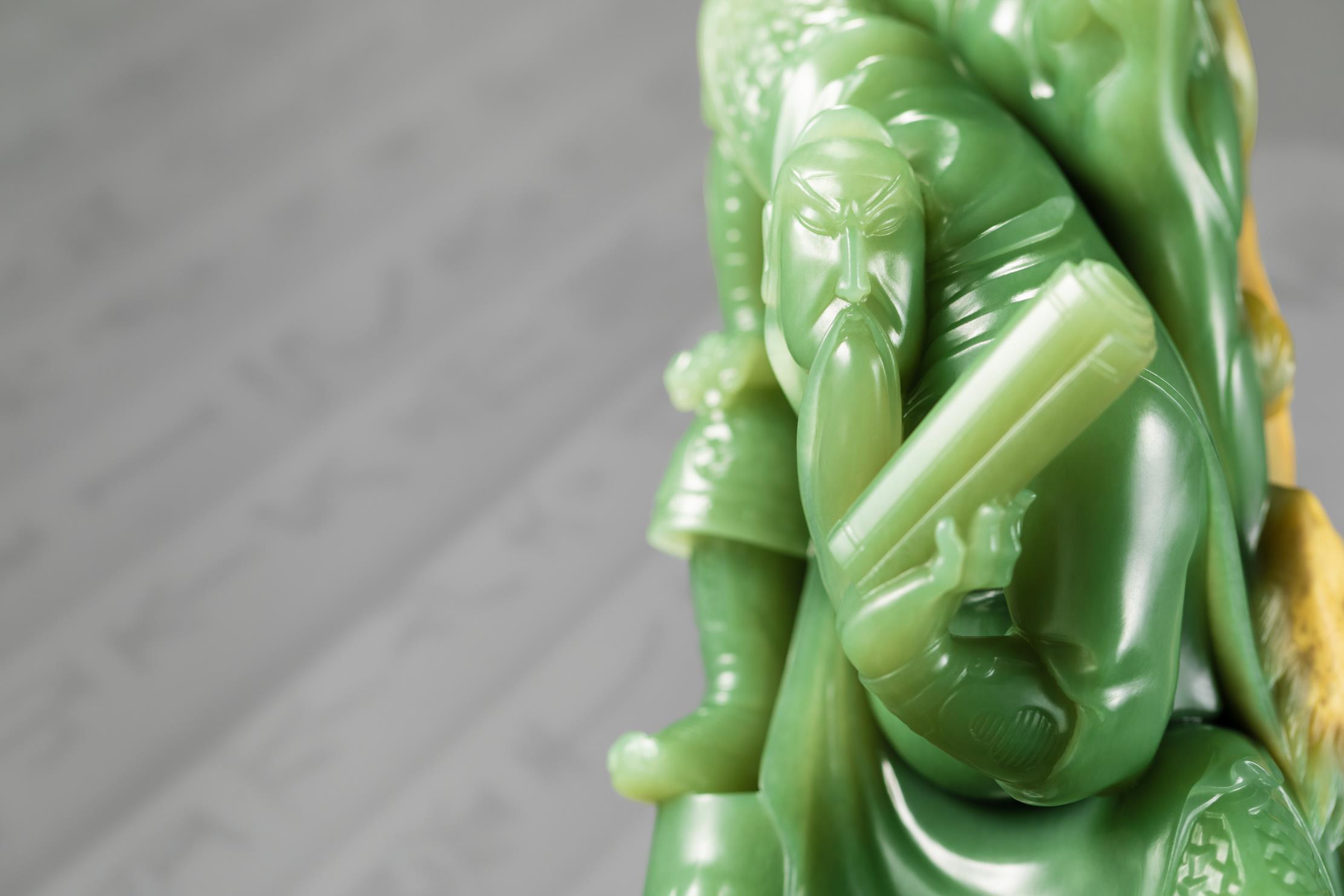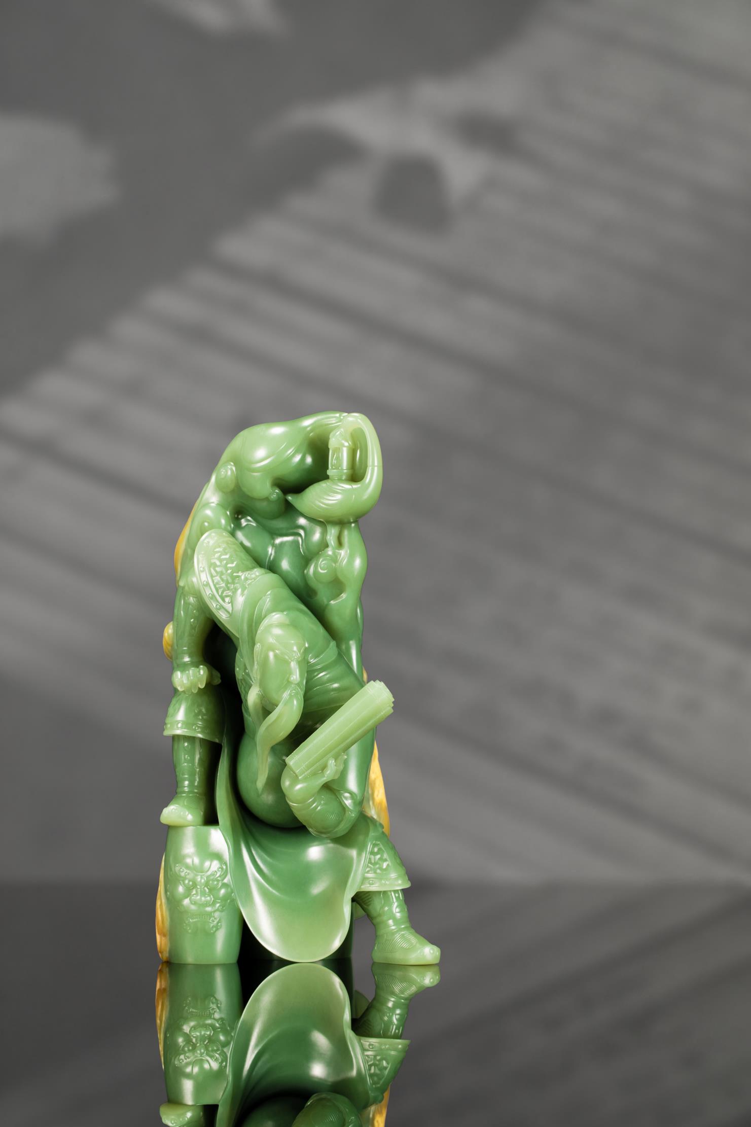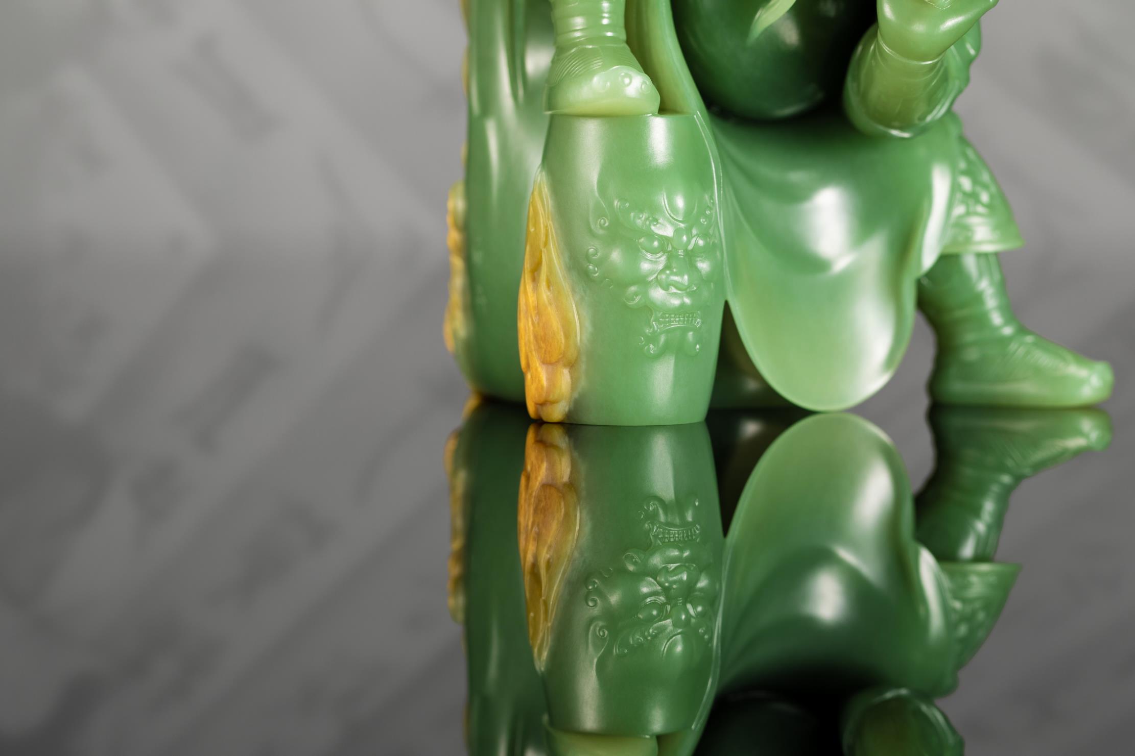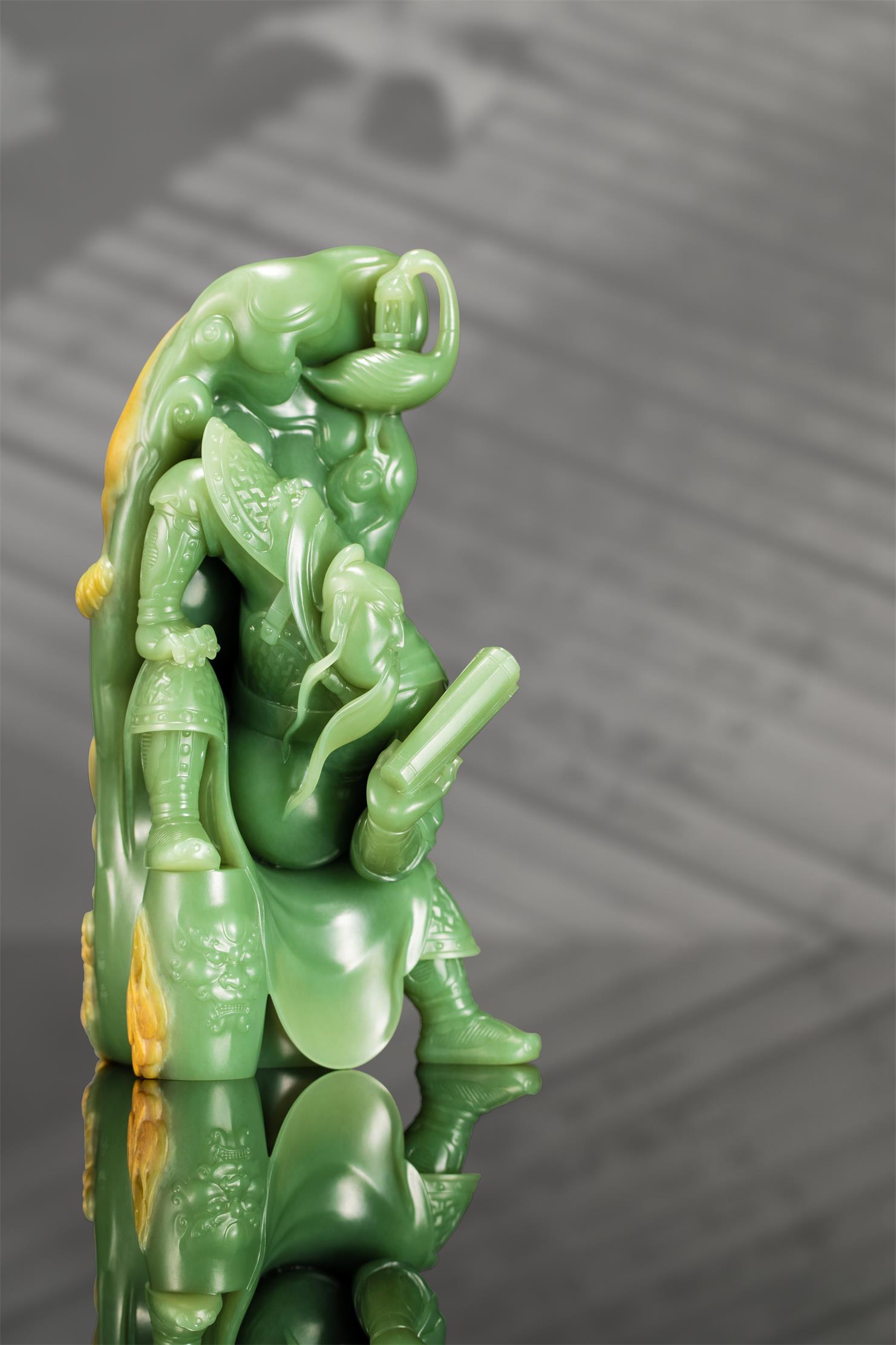 玉料的“肉”净润清新,作者以斜线作三七分,三分刻画关公身后立于祥云之上的汉代大雁灯;七分刻画武财神关公夸张的造型,呈现画面的丰富、独特、有趣与气势感,衔接了前后。