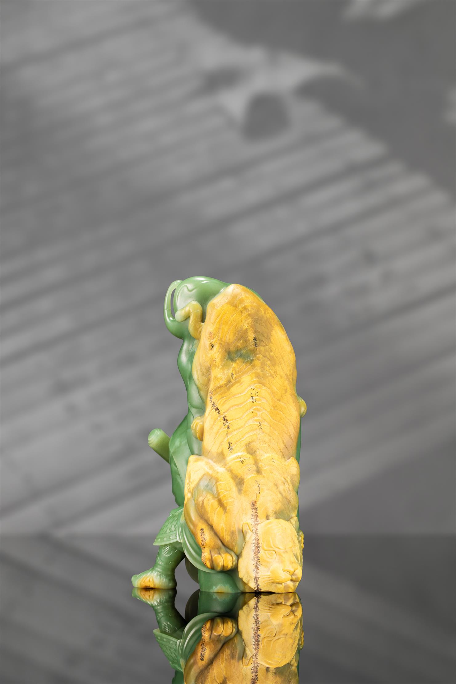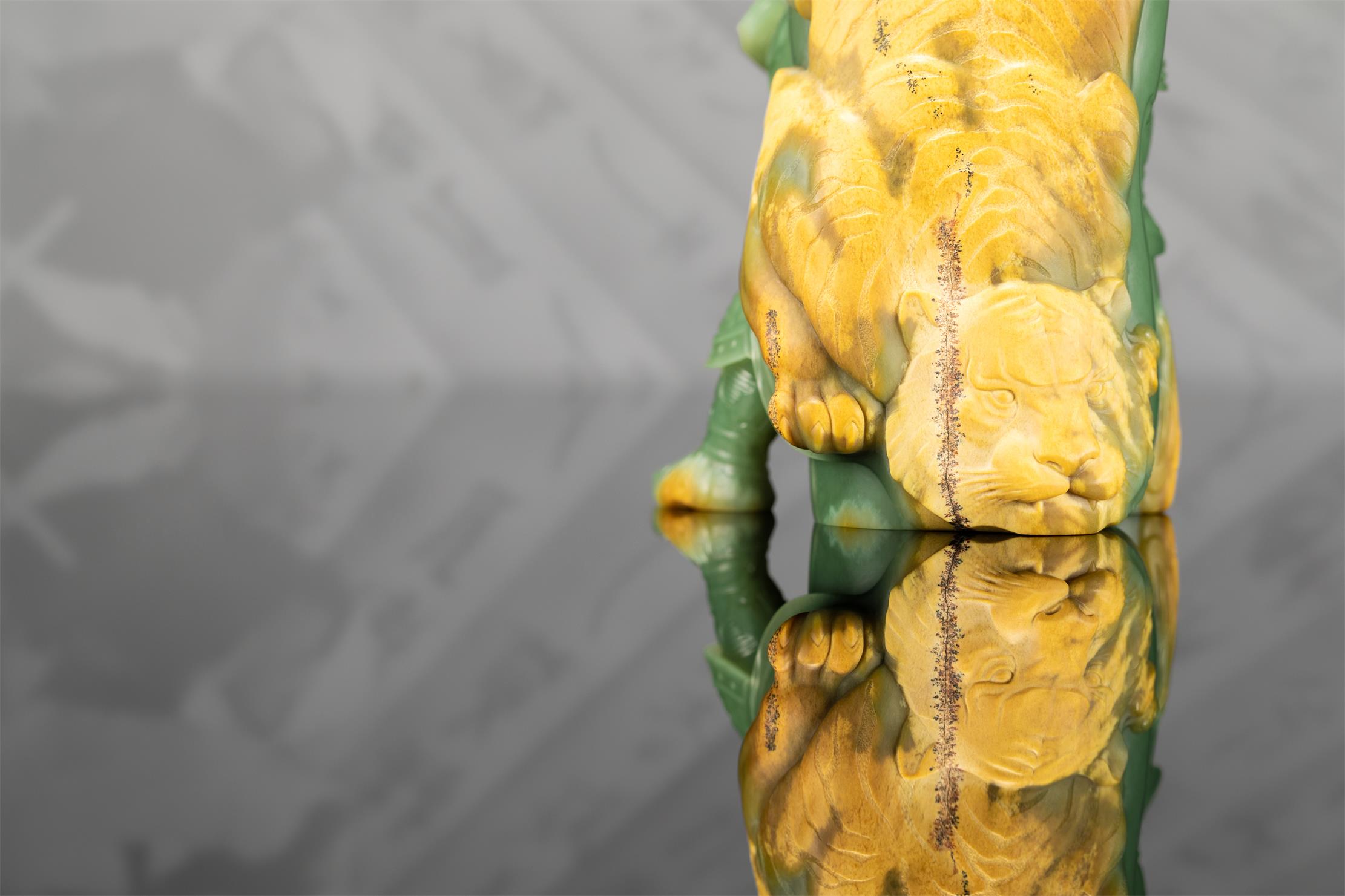 析木玉的皮料、糖与浆,大多细腻油润,可精雕细琢,所以绝不能浪费了,就将这微透玉色、零布水草沁的大块黄浆,“因材施艺”雕刻为一张伏于身后的虎皮吧,营造威武、霸气的超级视觉效果,呼应战神关公的形象。