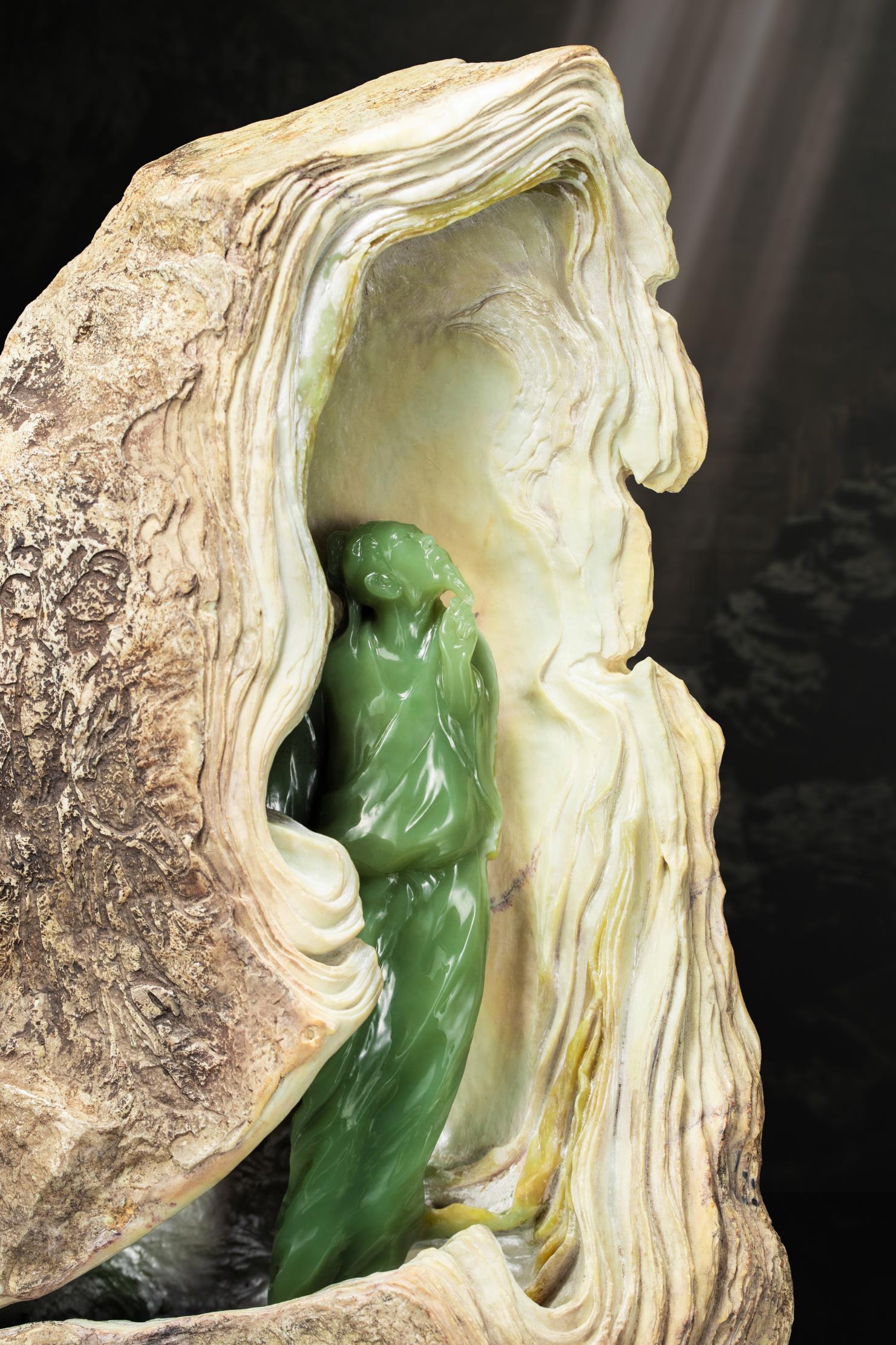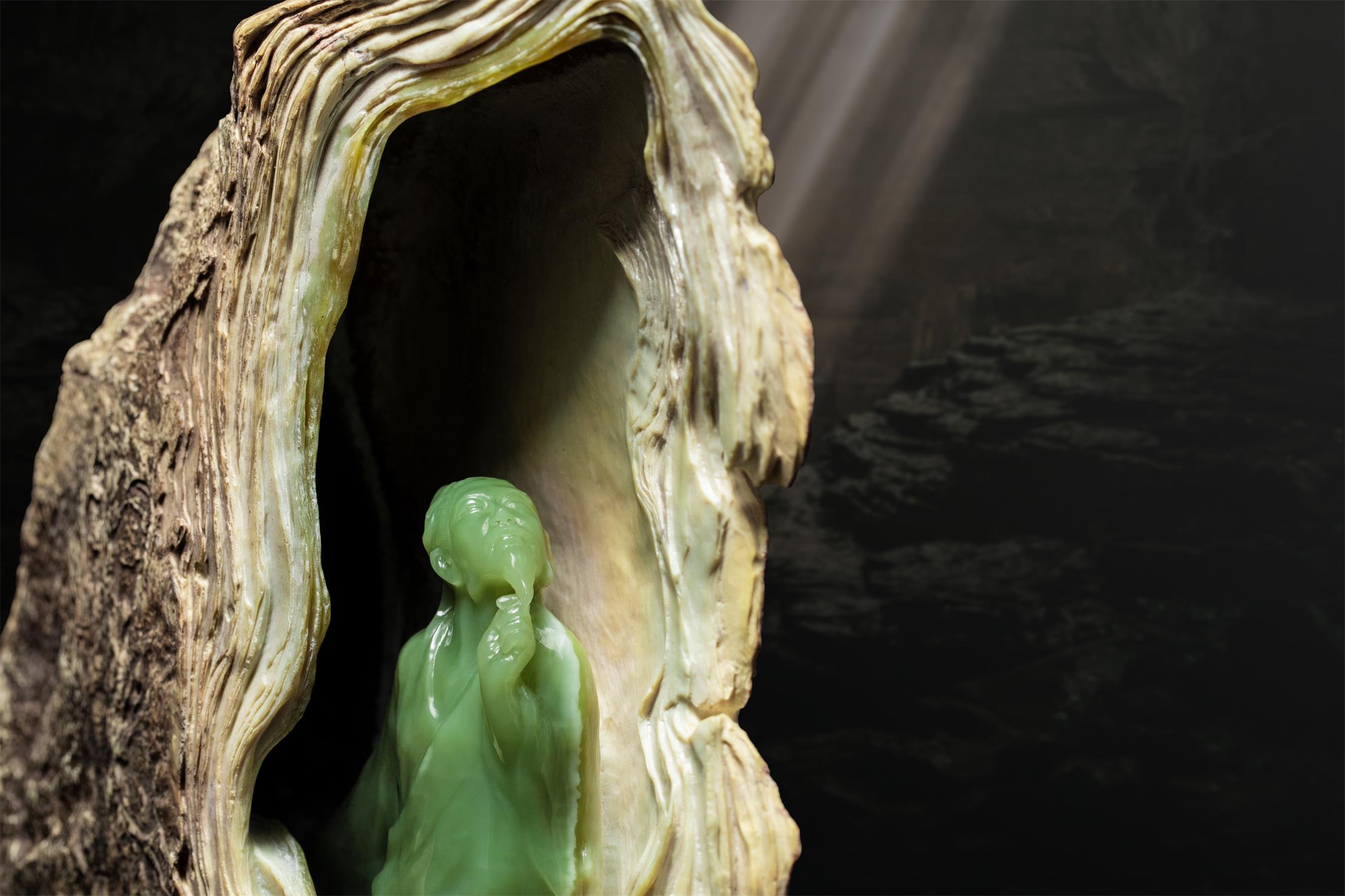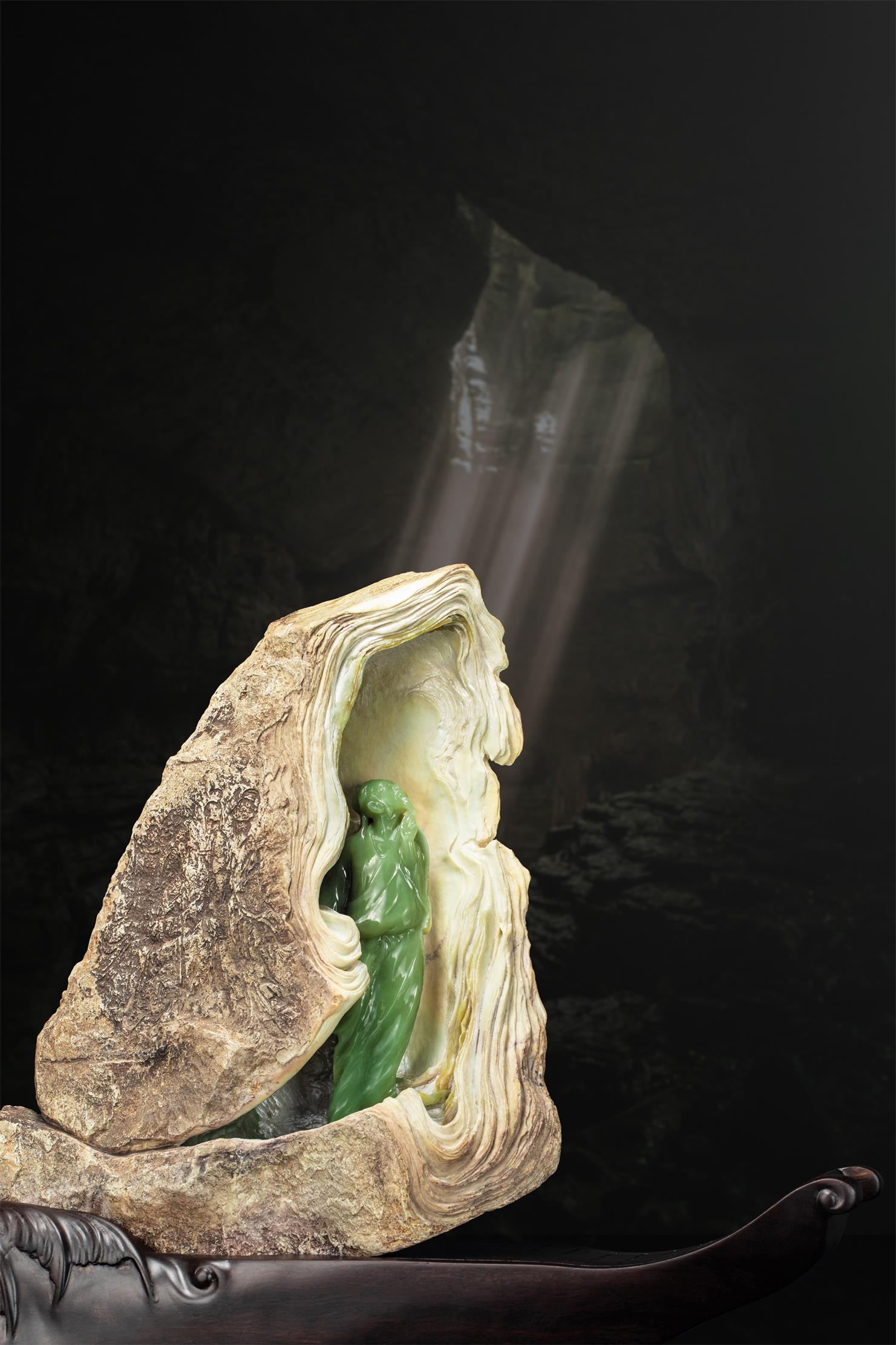 中国玉石雕刻大师刘东,受庄子浪漫主义风格影响,取天然之析木玉,顺应瞬间的灵感迸发,设计了庄子“回归自然”的《逍遥》。