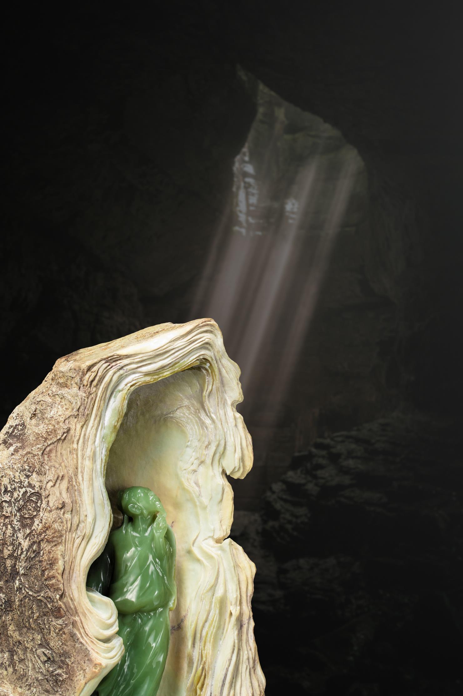 作品玉料品相独特,有质地斑驳的黄褐皮和厚实光匀的黄白浆。作者尽可能保留这些天然特征,从一侧开窗挖肉,呈现周边挠曲、流变的岩石洞风貌。