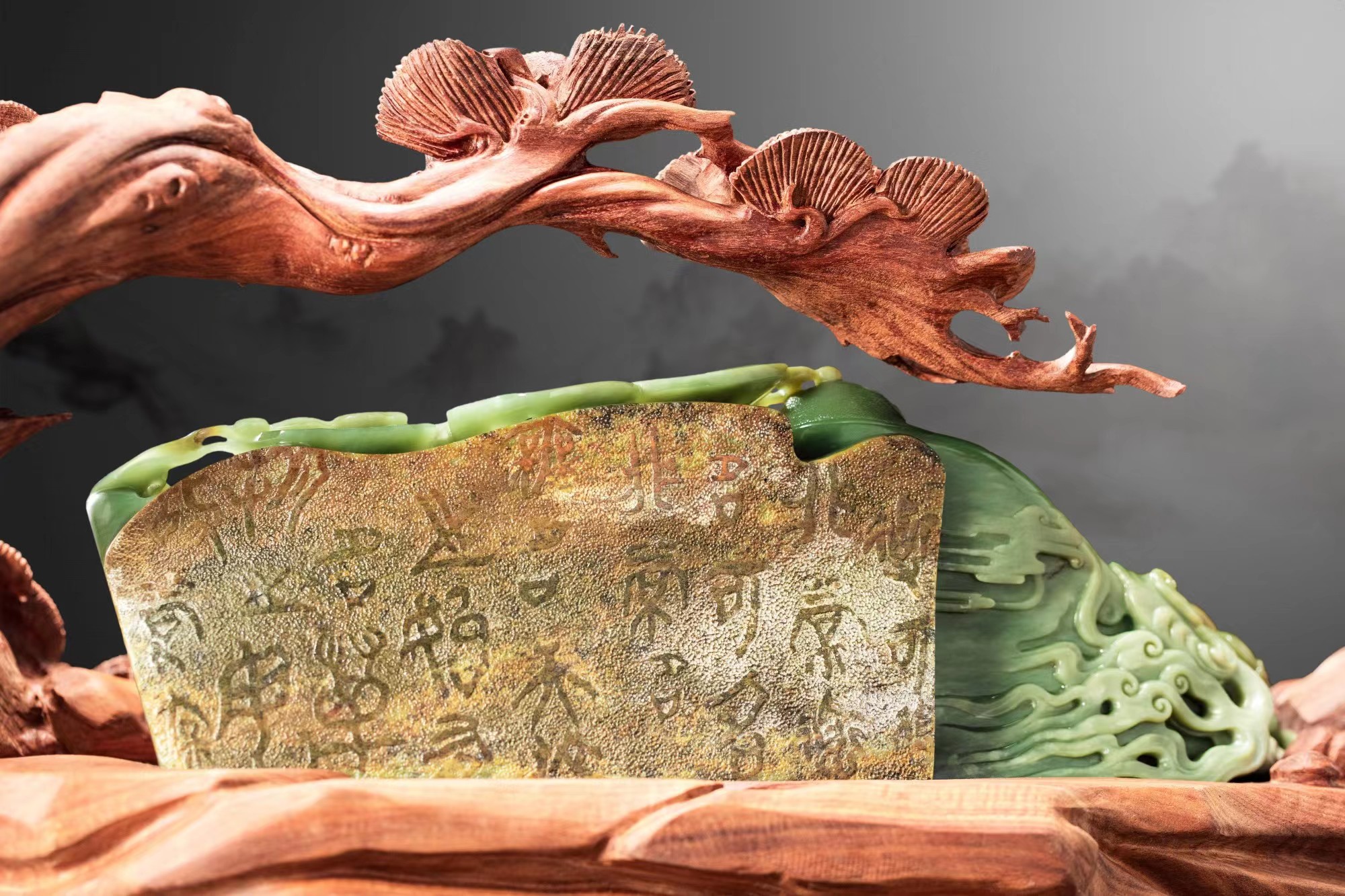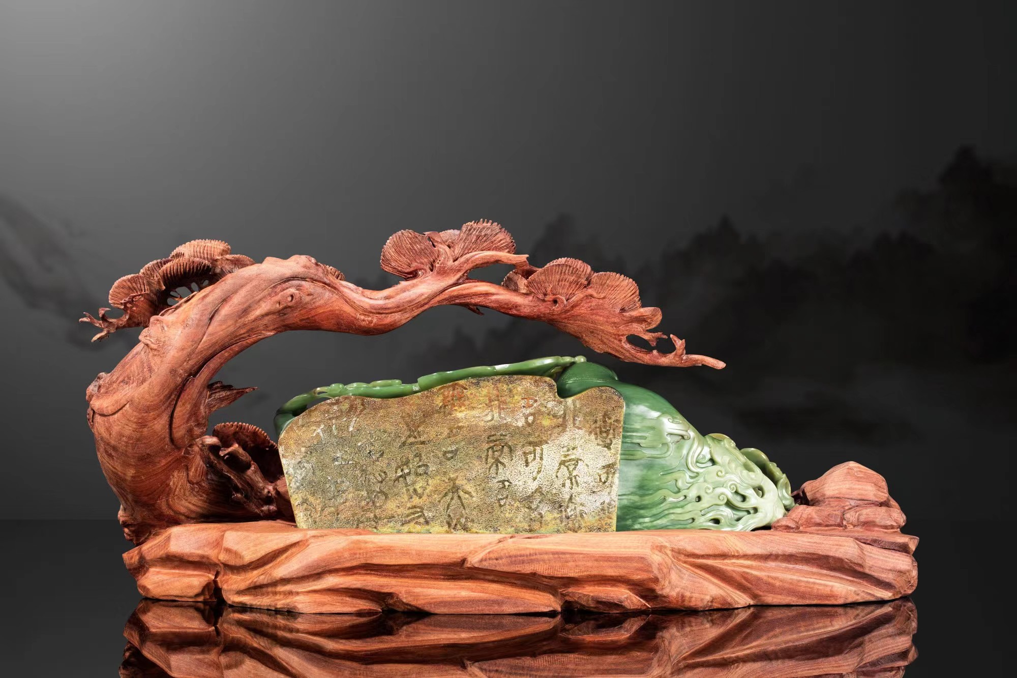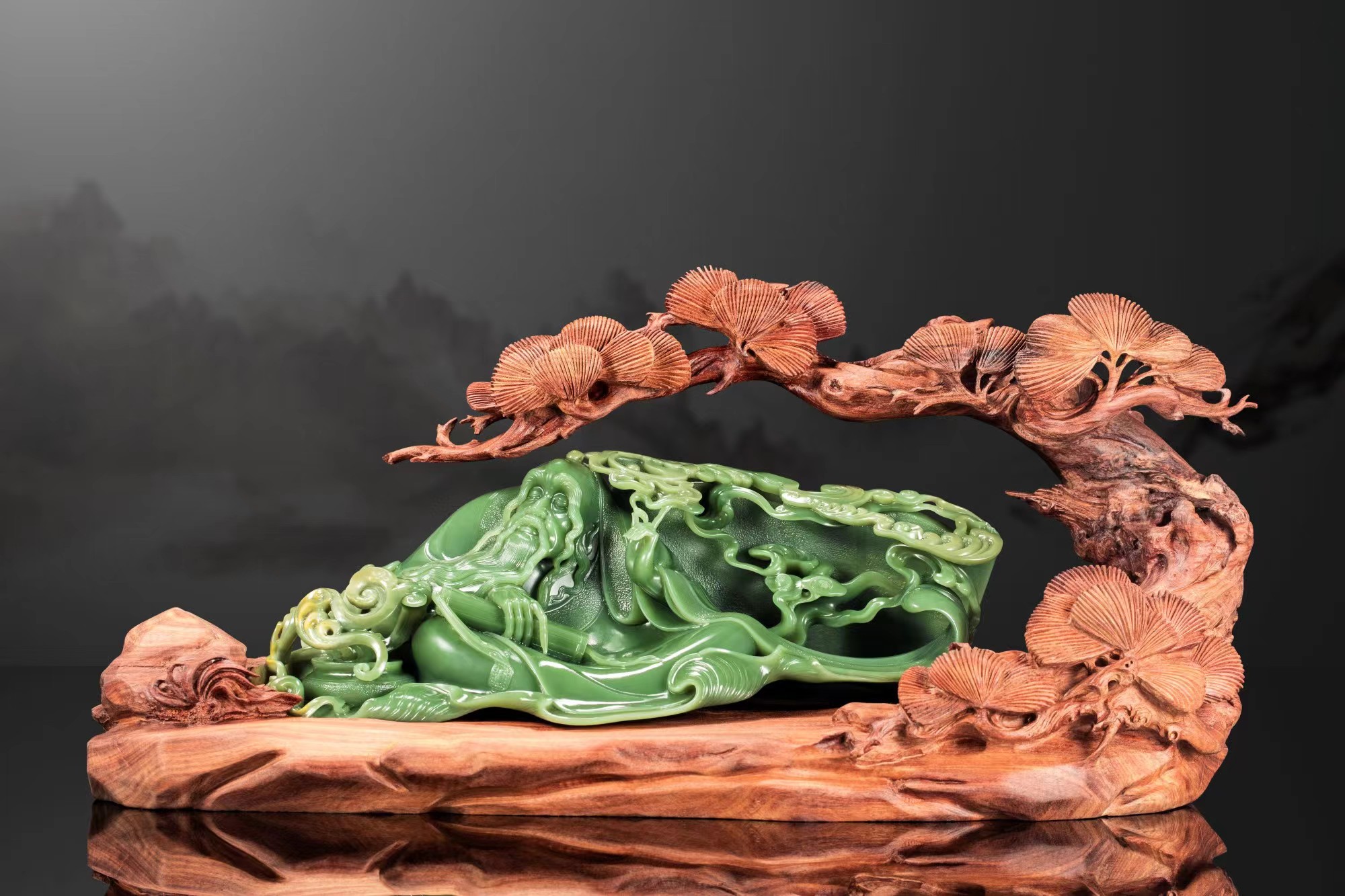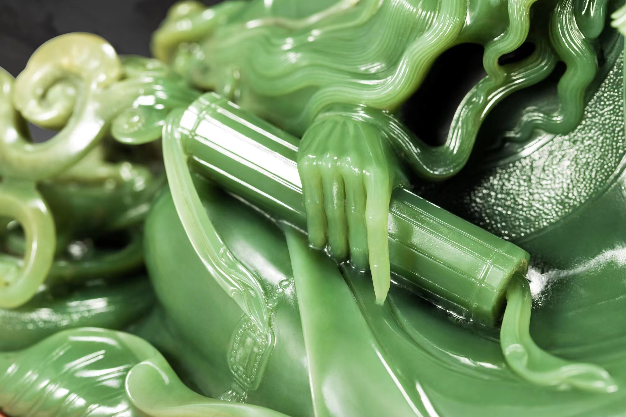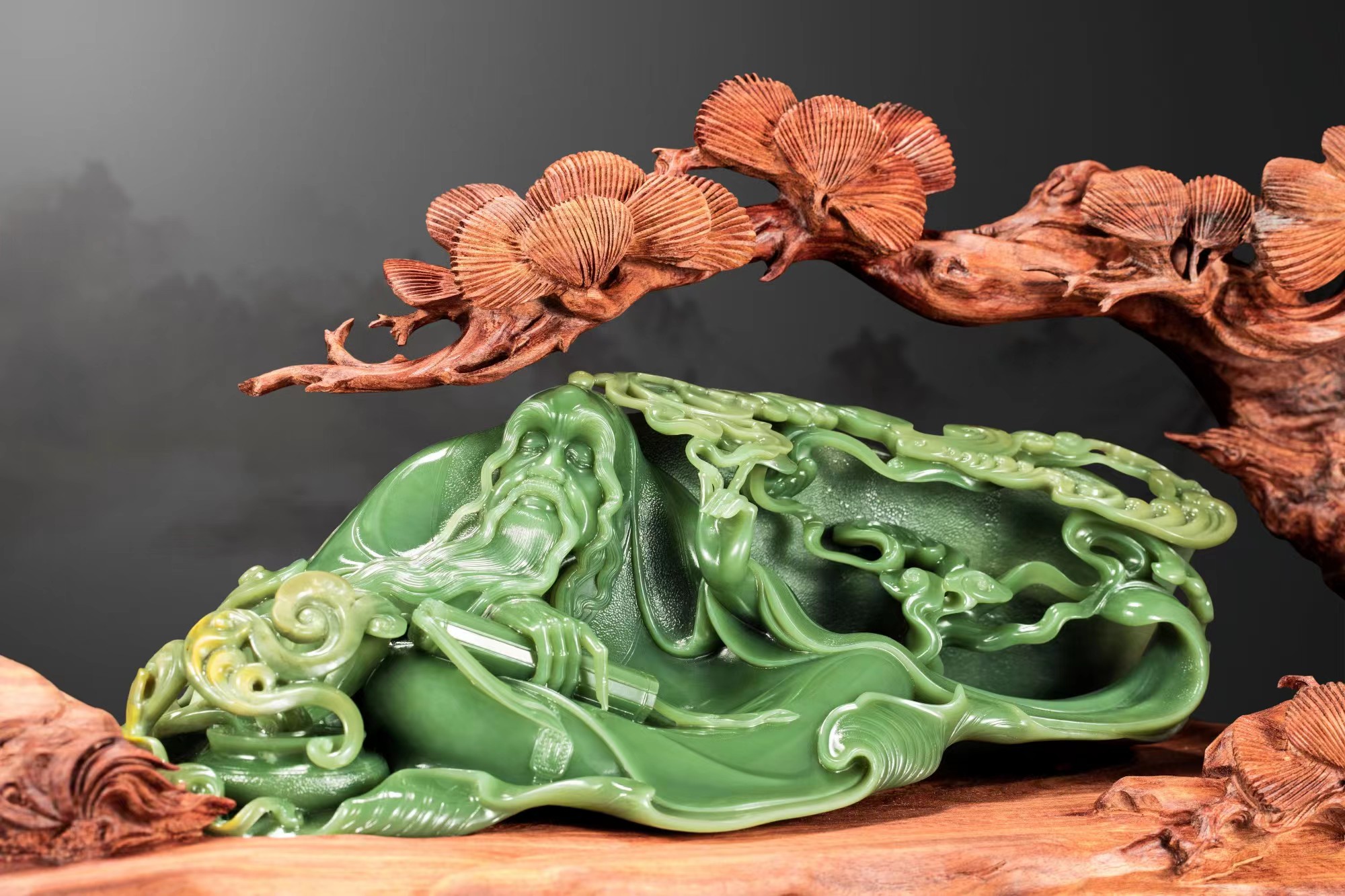 工于宗教人物的中国玉石雕刻大师张雪松,就青睐一种玉,名为“析木玉”,其绿中透黄、细腻温雅、沉静清丽的不凡气度,总能与他心中要表达的人物形象不谋而合。比方说,他的析木玉新作《道法自然》所塑造的人物形象,温和儒雅、静寂超然,透着无尚的智慧和气韵生动的禅意。