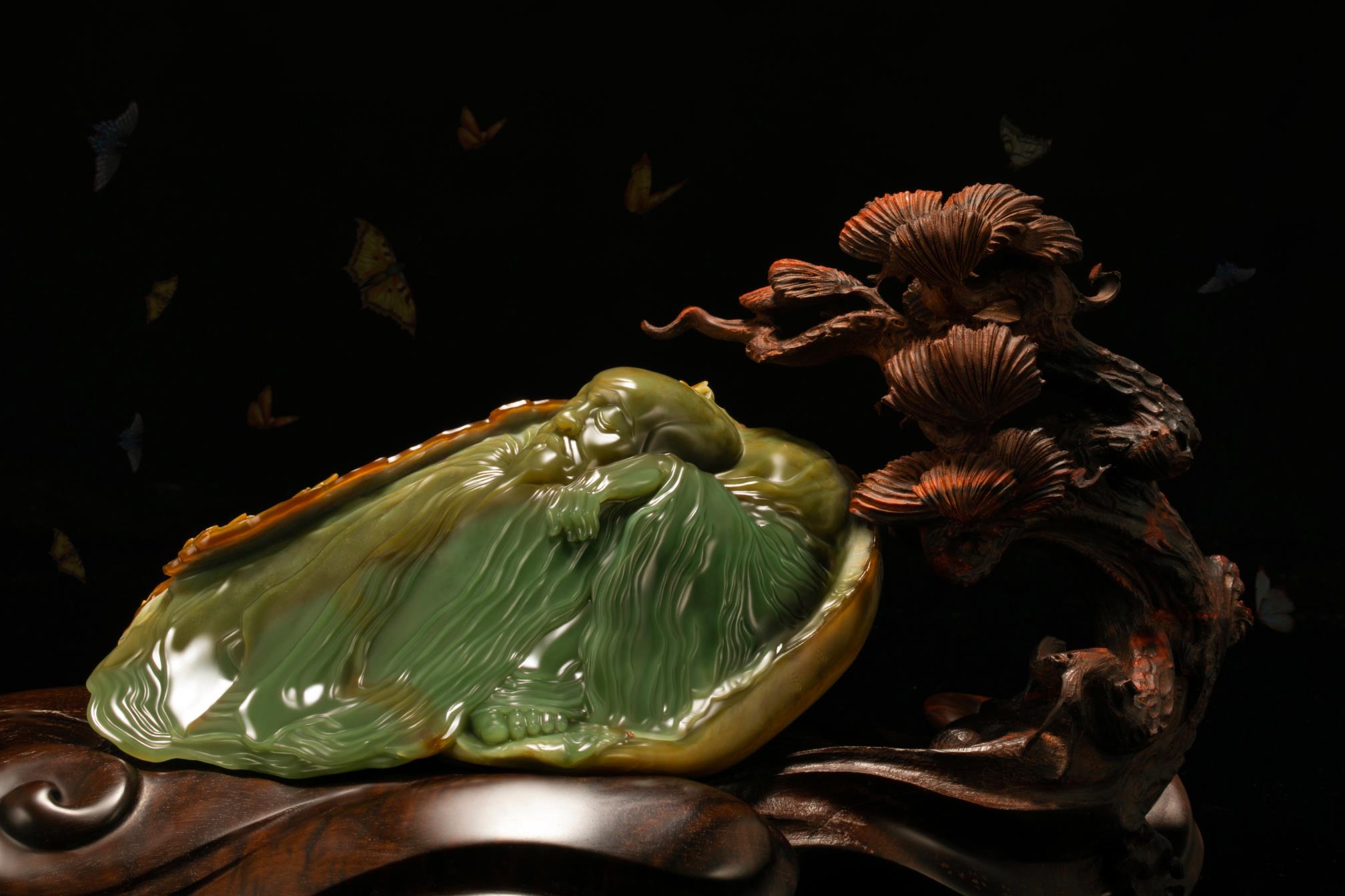 嗯,美好是我们活着的意义。正如此刻张庆东大师所凝视的新作《庄周梦蝶》,他巧借析木玉皮色变化,生动再现了酣睡中的庄子梦化为蝶、渴望从喧嚣走向逍遥之境的浪漫与美好。