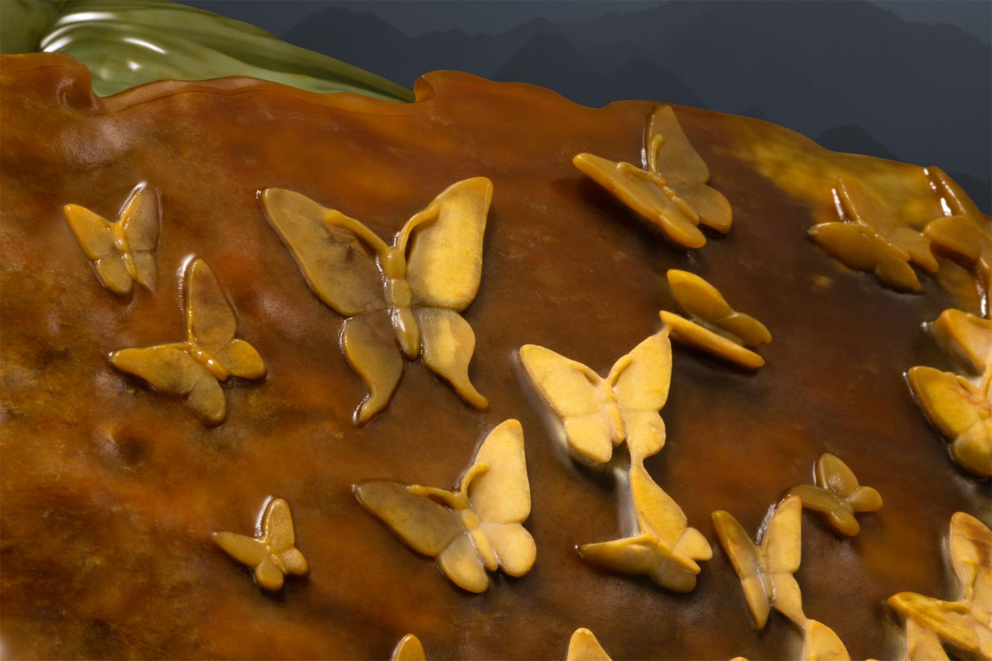 作者以玉石主体之绿刻画庄子,以黄色部分概括表现从无到有、从小到大翩翩起舞的蝴蝶,以红褐色部分渲染出烟雾的氤氲与紫气兆祥之感。
