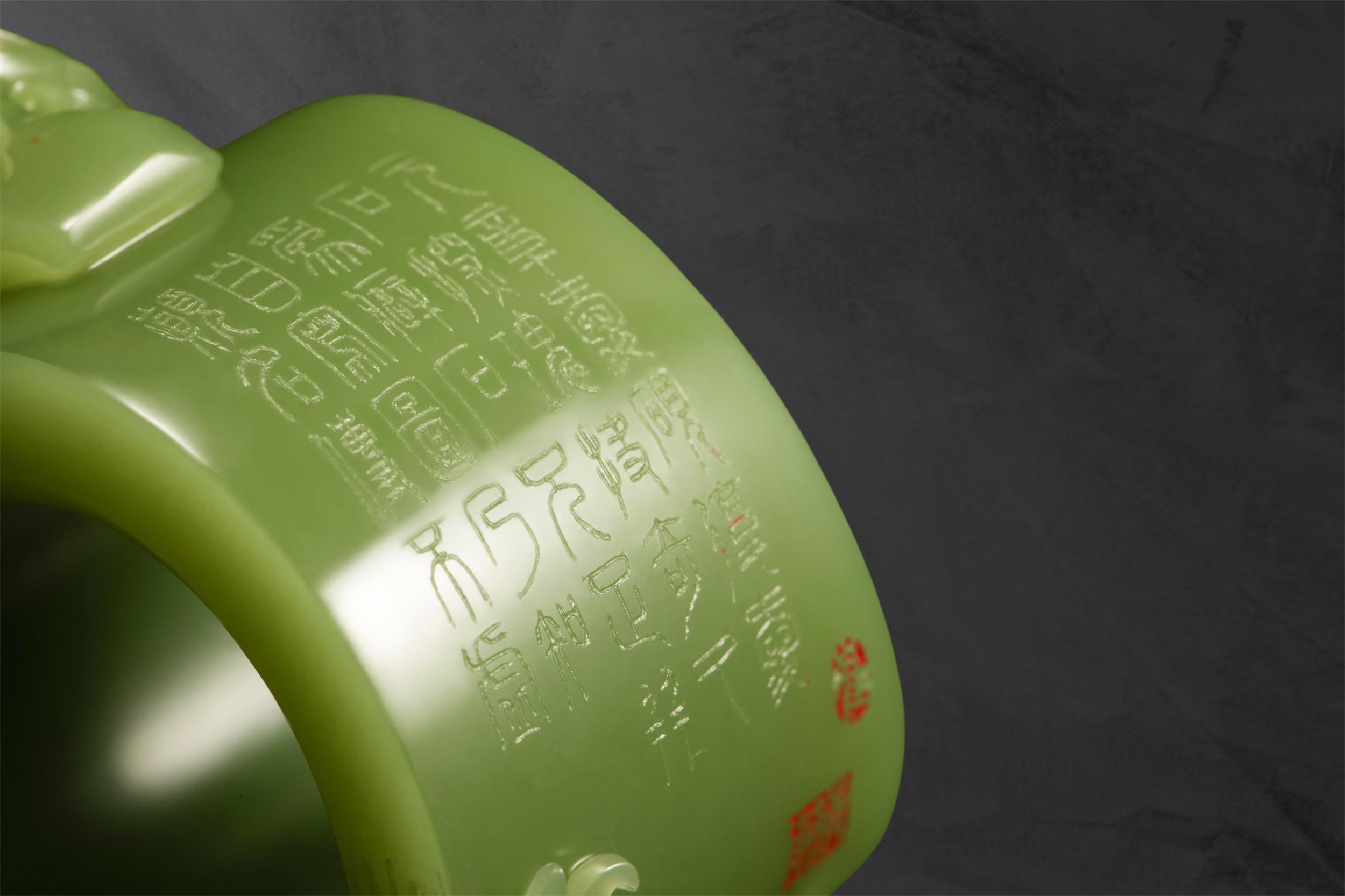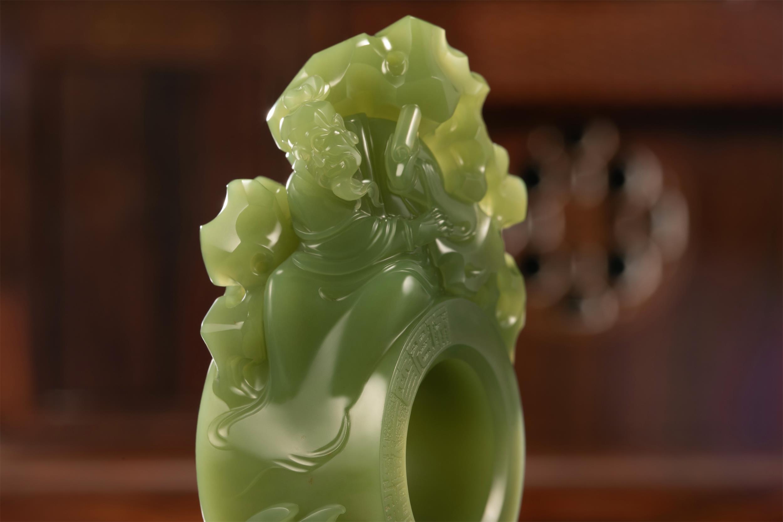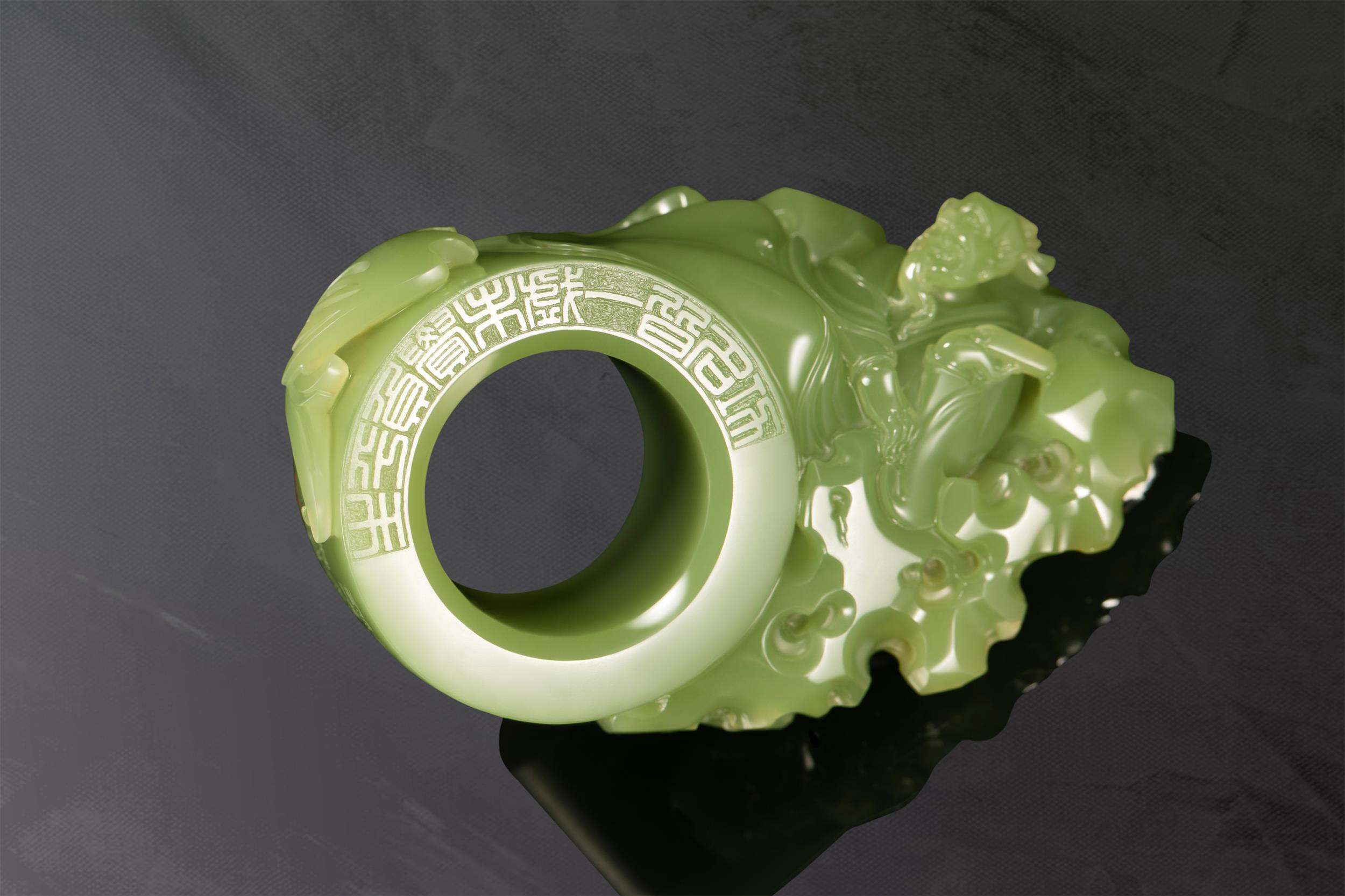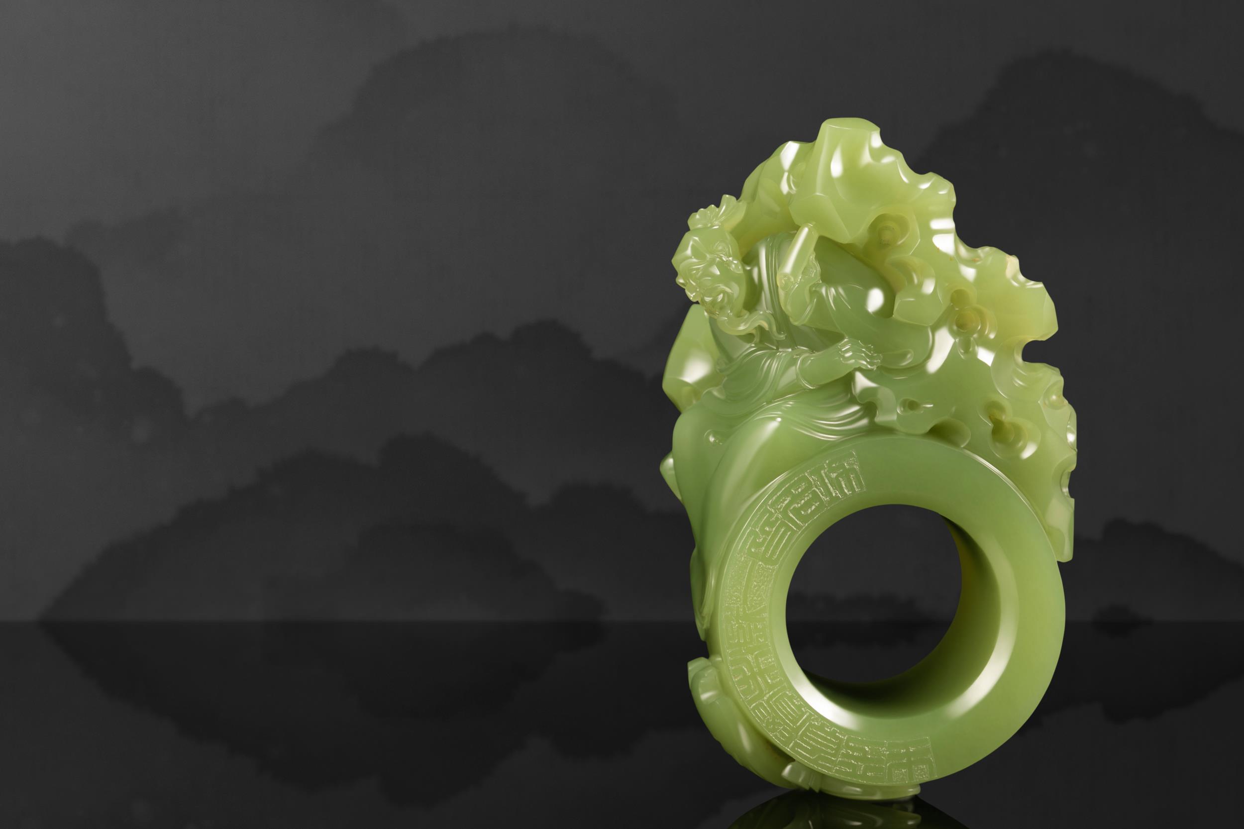 当扳指结束它素简、硬朗的“戎马一生”时,岁月又赋予它一份柔情与绝代风华——或于外壁精铸诗句、花纹,或雕琢立体瑞兽、人文景观……