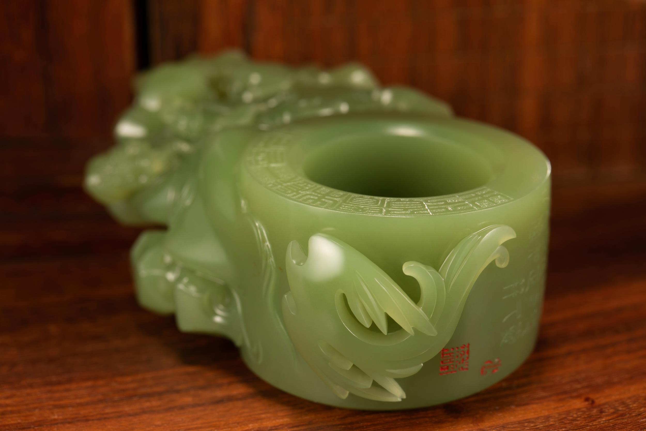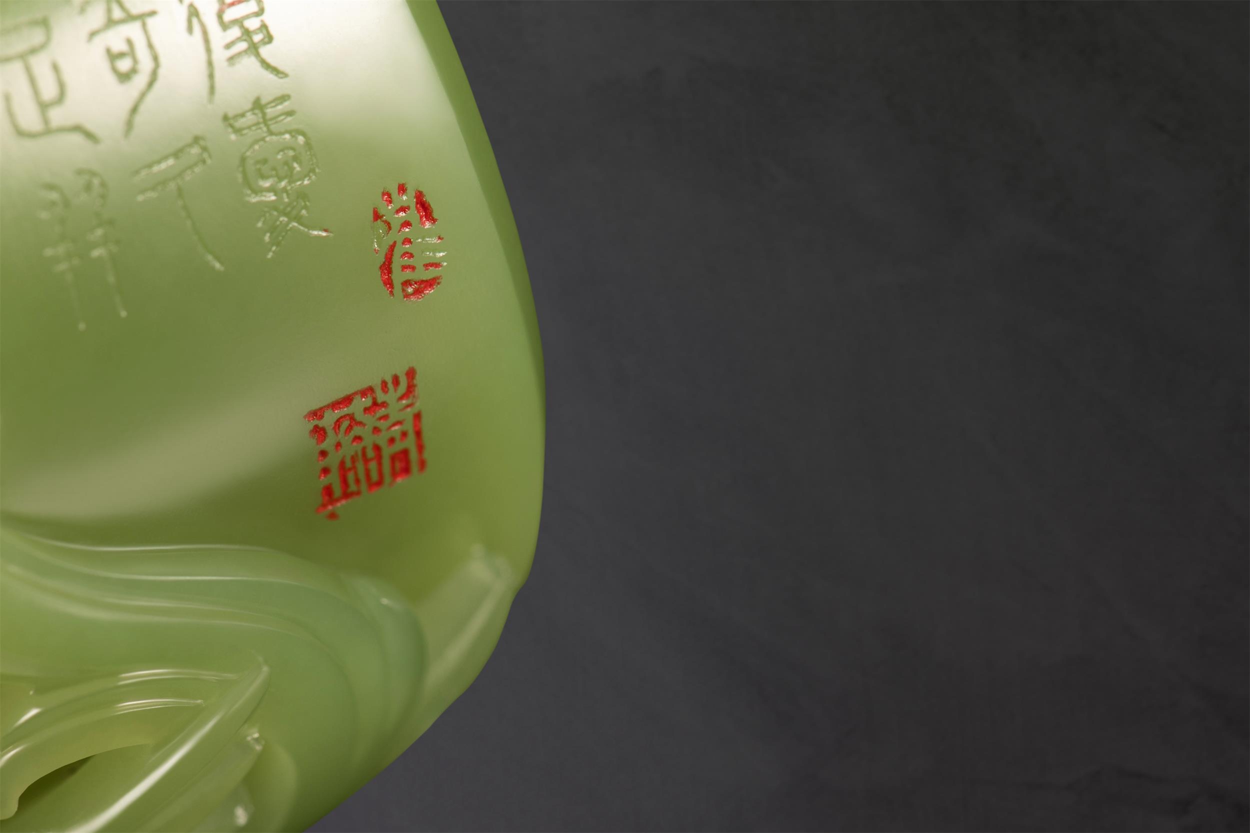 作品用料为色泽明亮、绿中透黄的优等析木玉。料子一部分素净无杂、细腻清雅,一部分则飘散有零星金沁,仿佛碧波上闪动的太阳光斑,颇为奇妙。