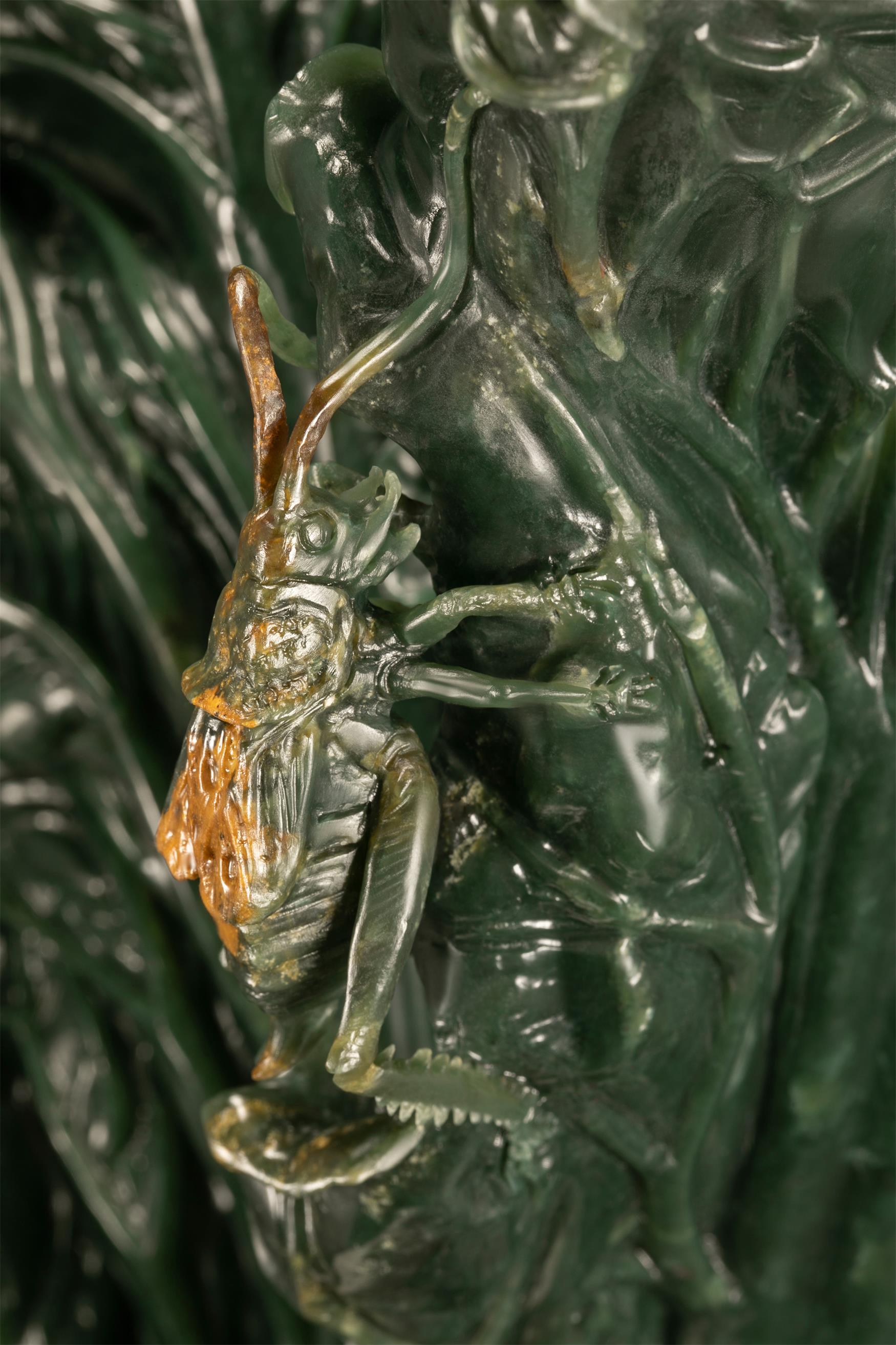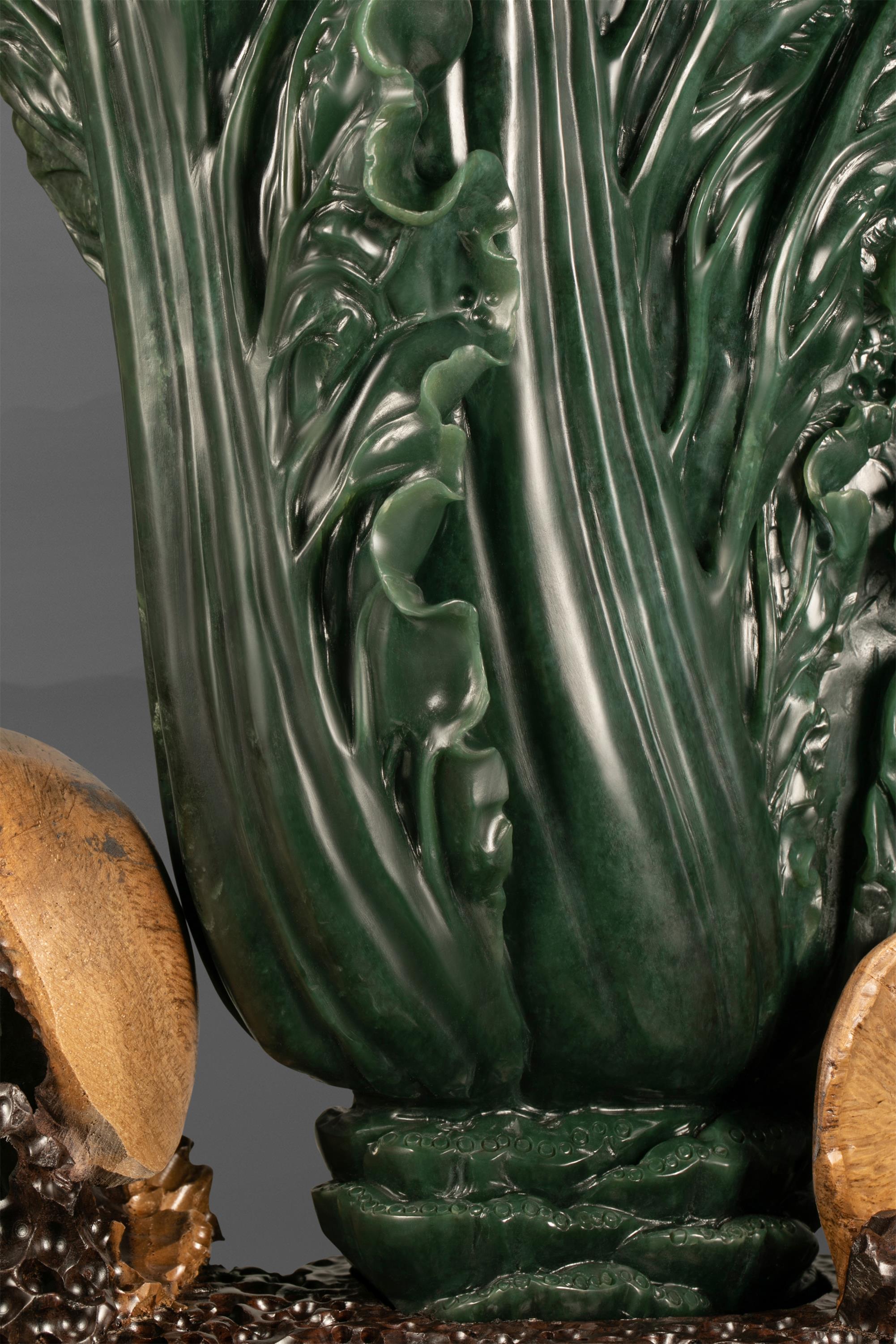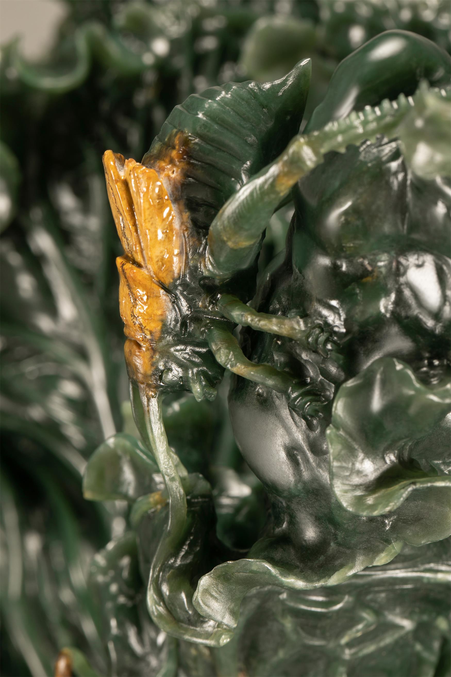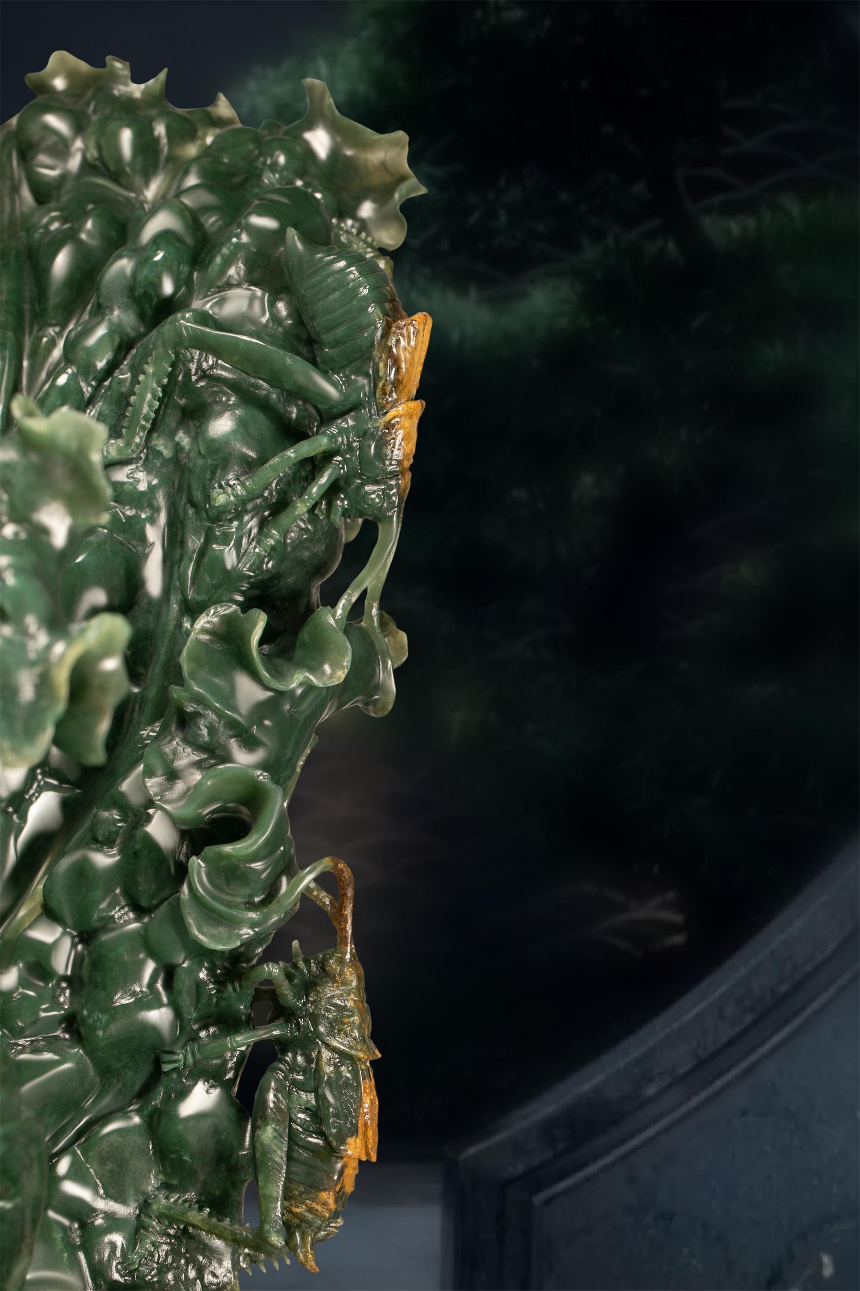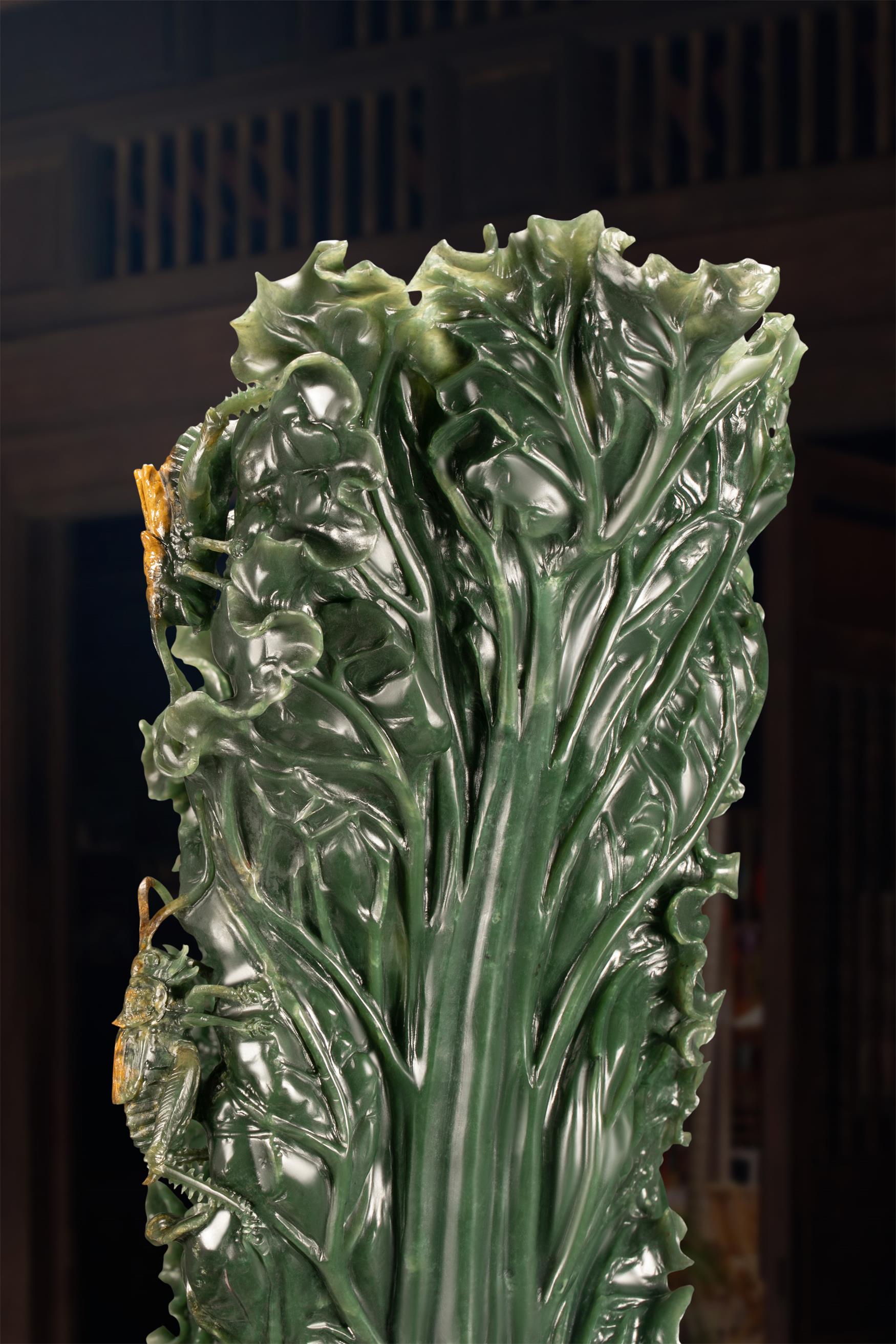 作者巧用俏色而不着痕迹,将生活中再寻常不过的大白菜雕得沉稳雅致、活色生香,也把包容、积极的人生感悟和拼搏向上的气节表现得淋漓尽致。