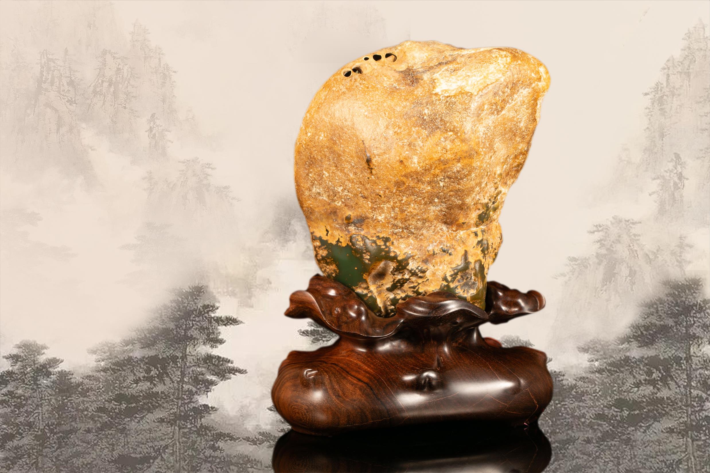 木雕的福袋底座托起一块巨石,这石头不同凡响,上宽下窄,圆融而无菱角,高拔而立,巍峨沉稳,加之满布明艳润美的金褐色皮,如日照仙山,神圣唯美。