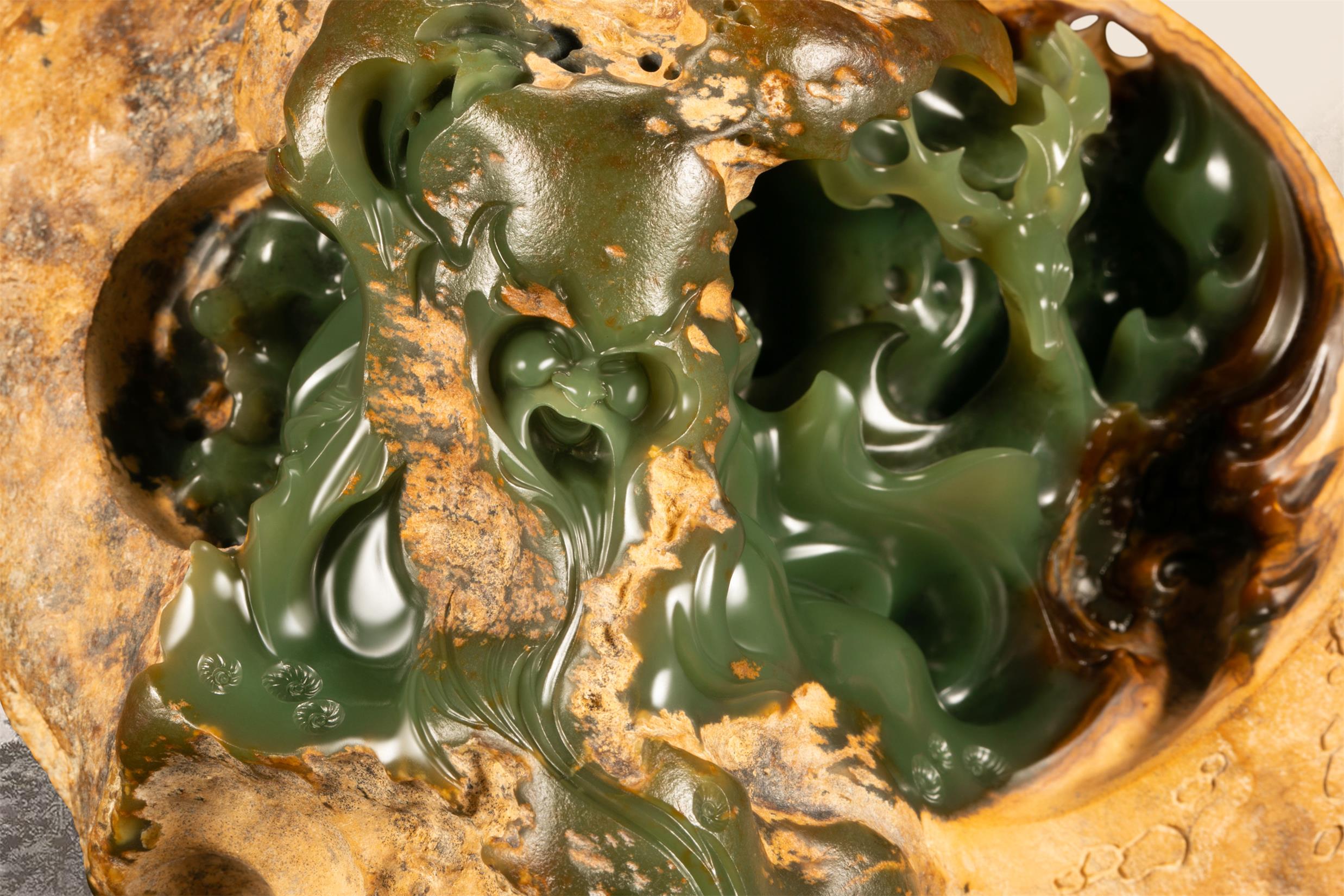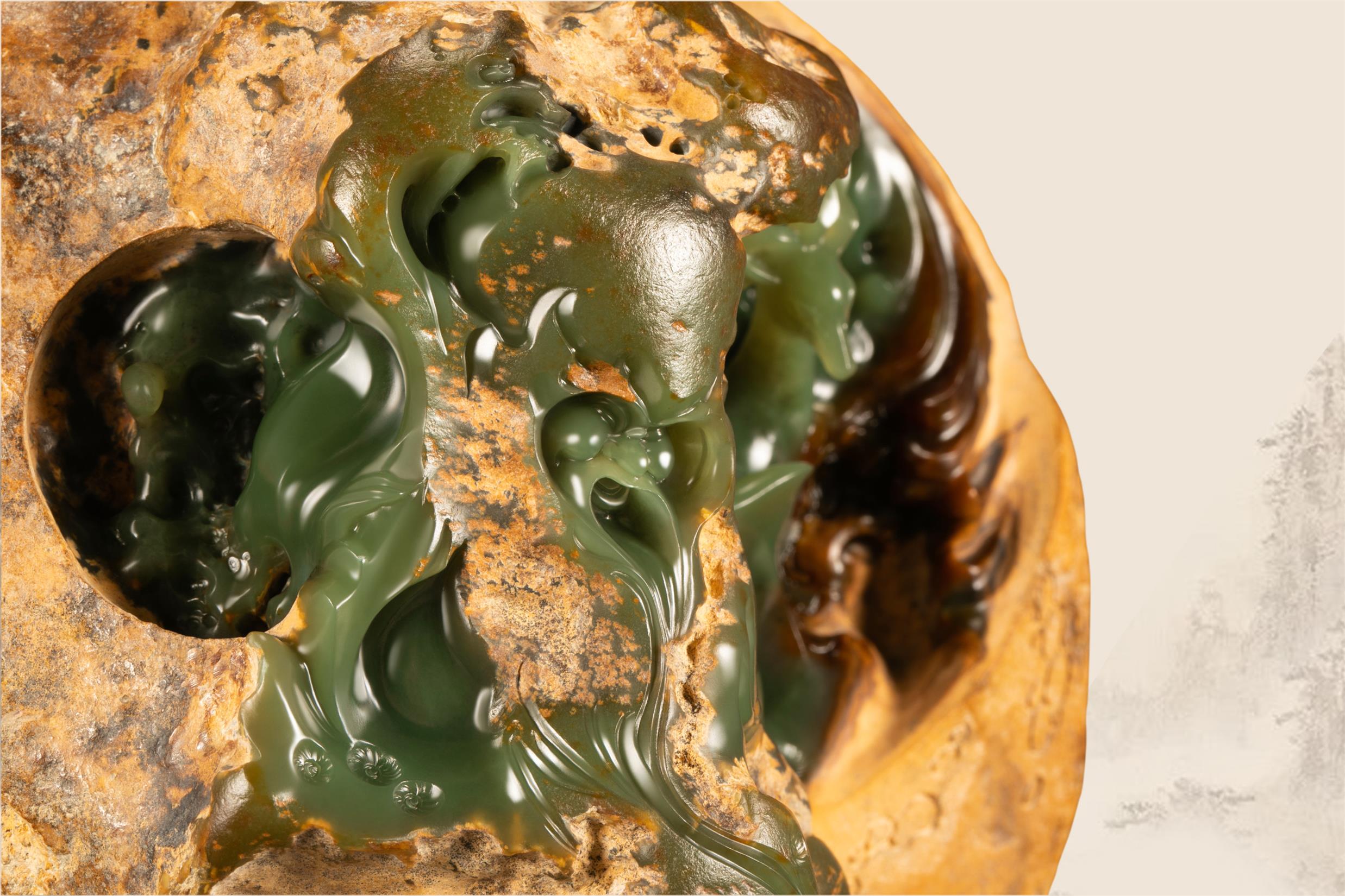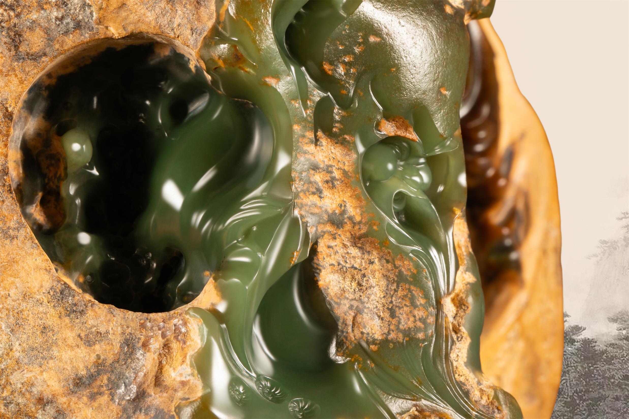 此时再看那福袋,袋口的褶皱似化作滚滚海浪,对映着玉料背面底部的青绿玉肉。那裸露的玉肉,大小不一、疏密错落,如海浪拍岸飞溅而起的水珠,晶莹剔透,整体暗合“寿山福海”之吉意。