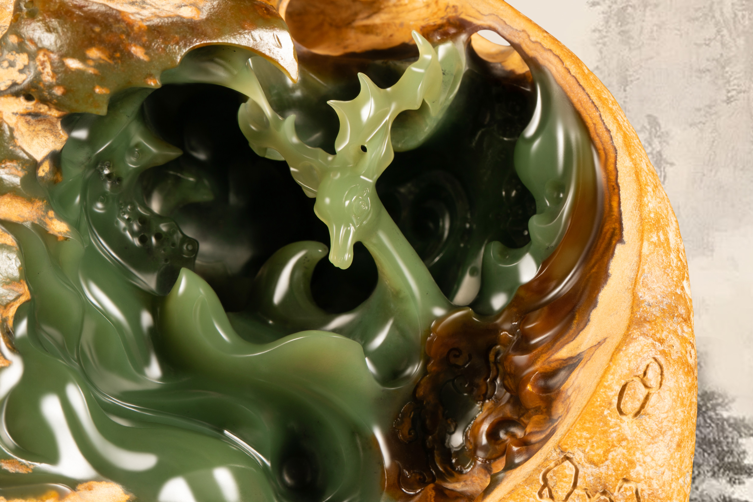在老寿星旁,作者于深凿的青碧色圆洞里,精细琢刻了踏着月色和风、祥瑞而来的鹿。