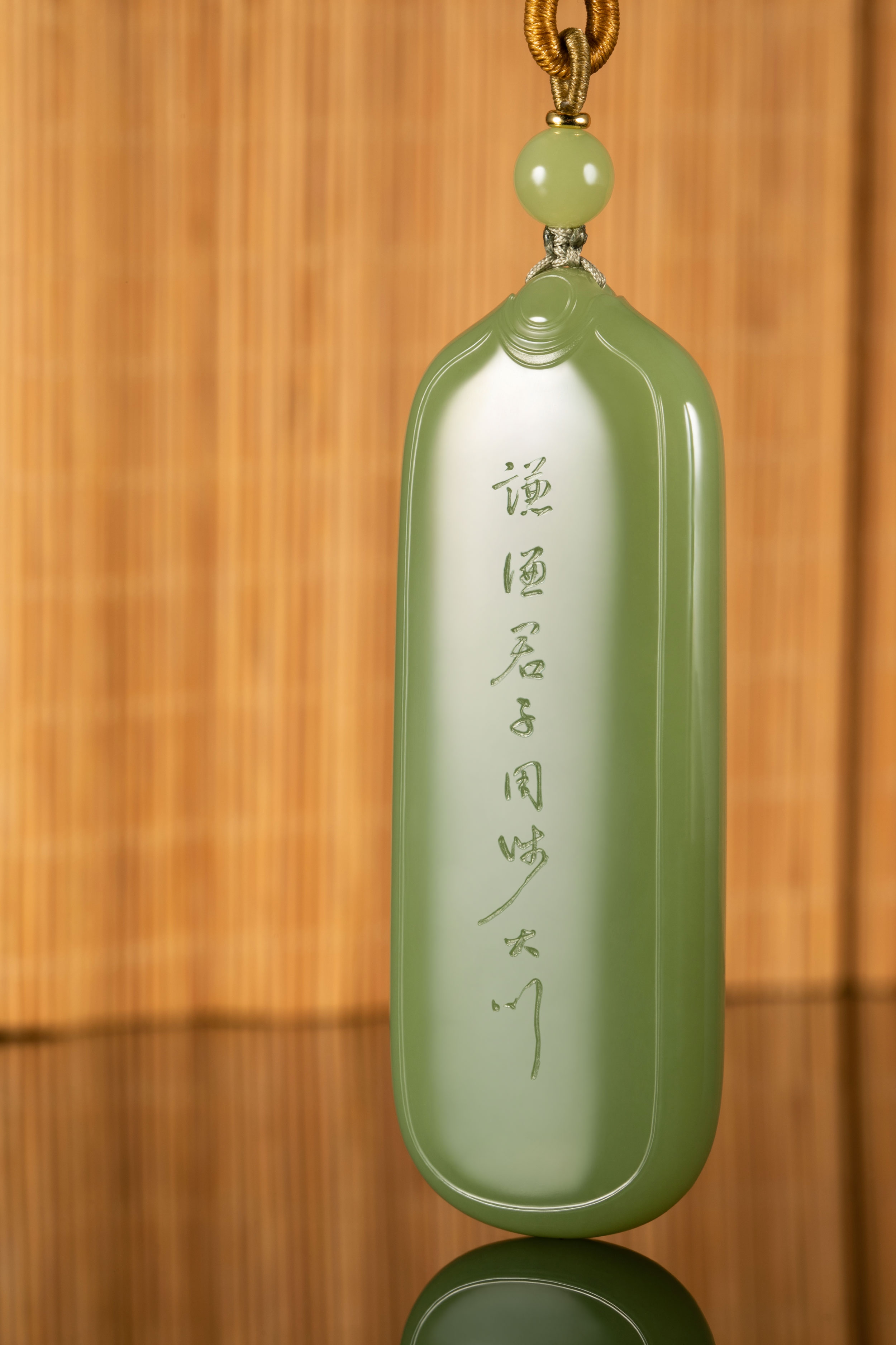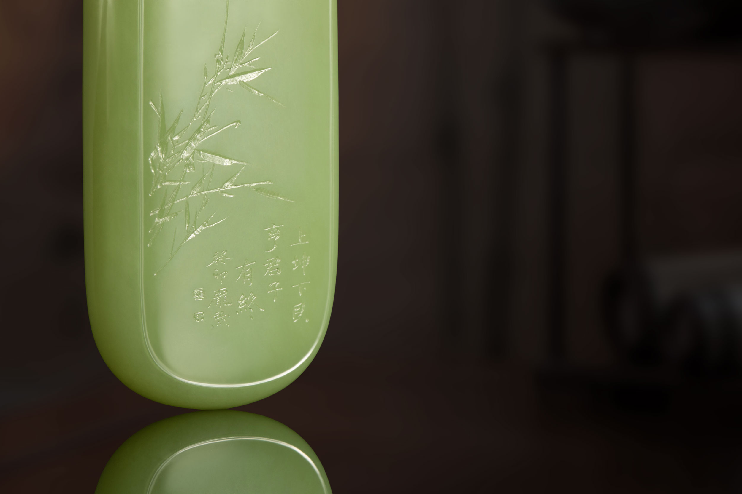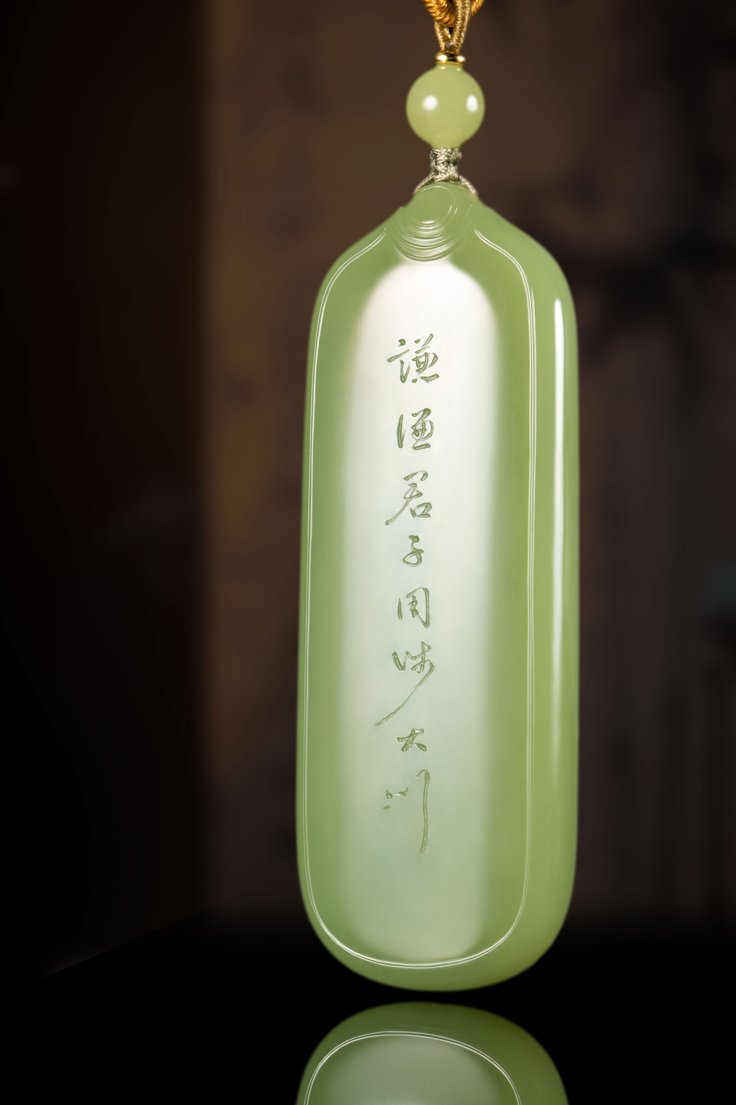 作者在细腻匀实、润彻纯净、青翠喜人的玉牌背面,以行草阴刻了“谦卦”的爻辞解读“谦谦:君子用涉大川”,笔意连贯,疏落明朗。