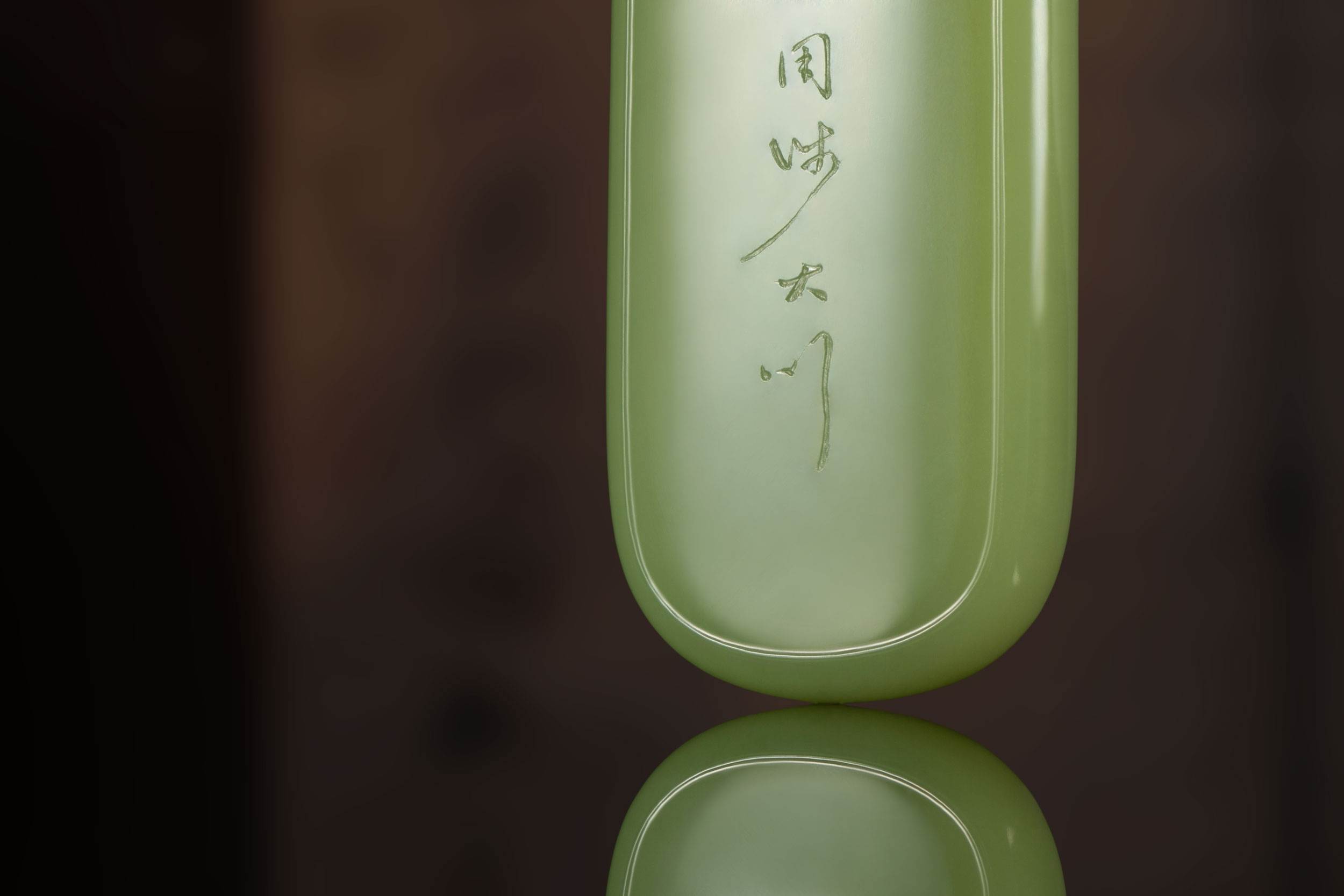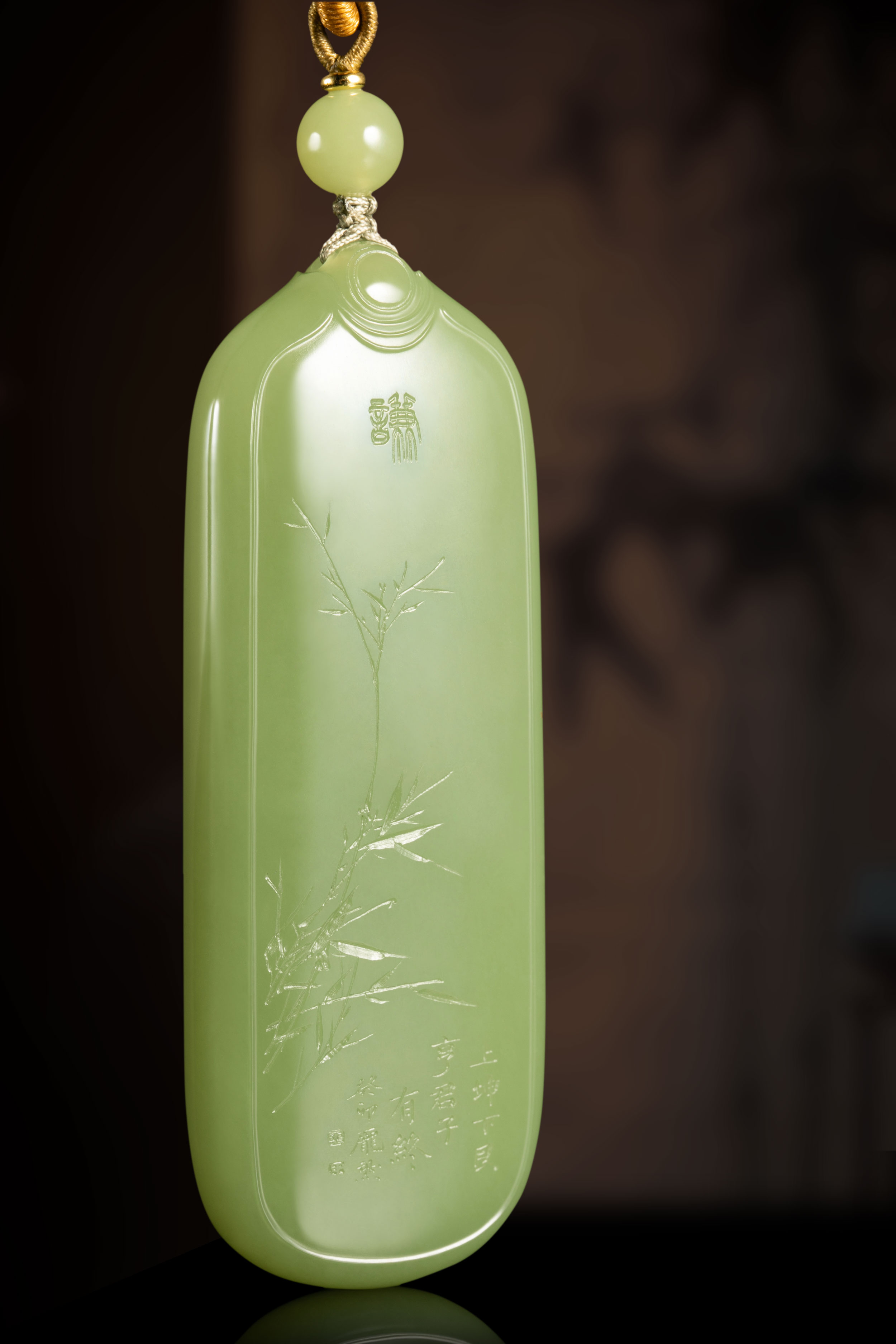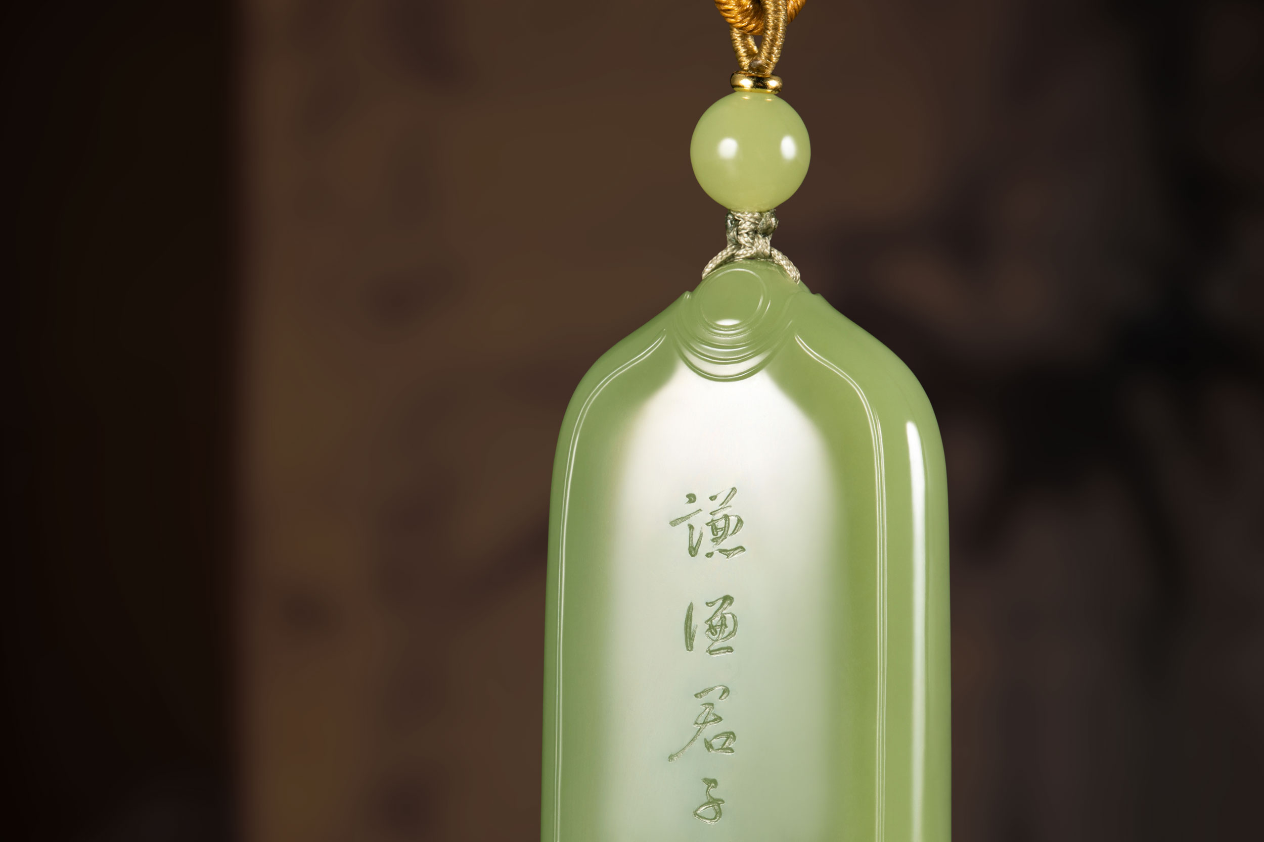 作者在细腻匀实、润彻纯净、青翠喜人的玉牌背面,以行草阴刻了“谦卦”的爻辞解读“谦谦:君子用涉大川”,笔意连贯,疏落明朗。