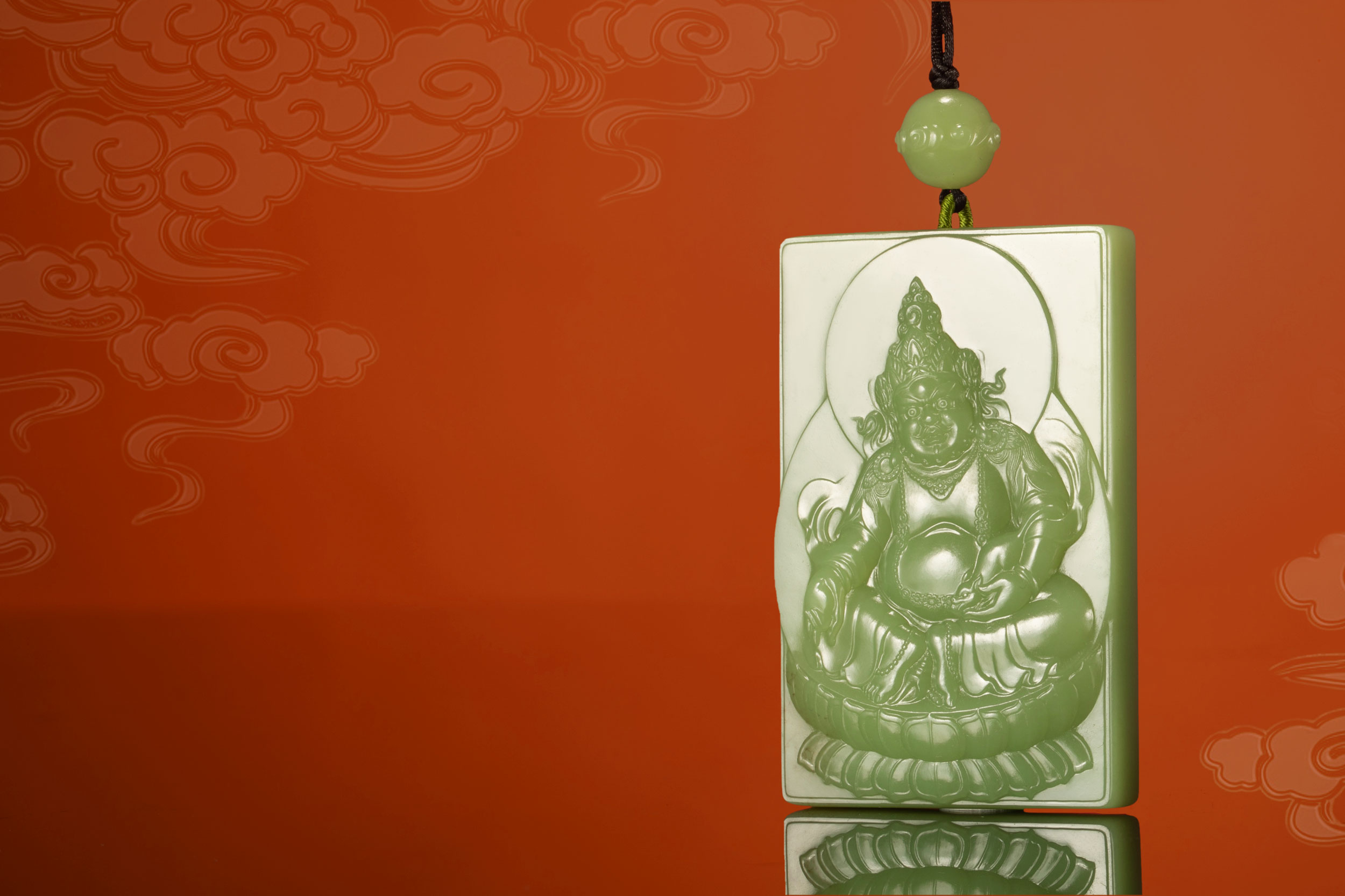 作者在黄财神身后,高浮雕了硕大的光环和有意象感的远山,营造出层次感和宝光普照十方而海纳百川、福报众生的宏伟气势。