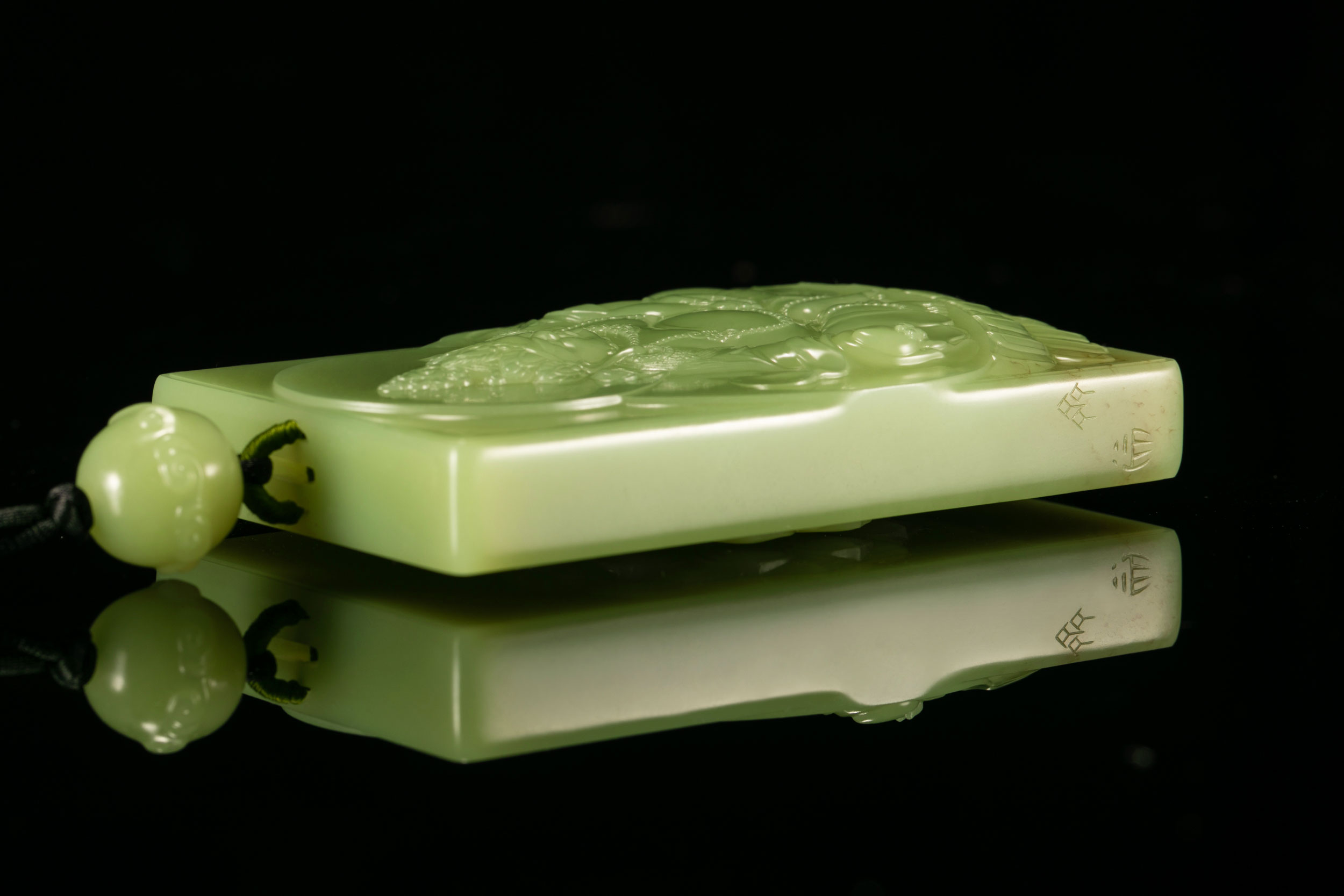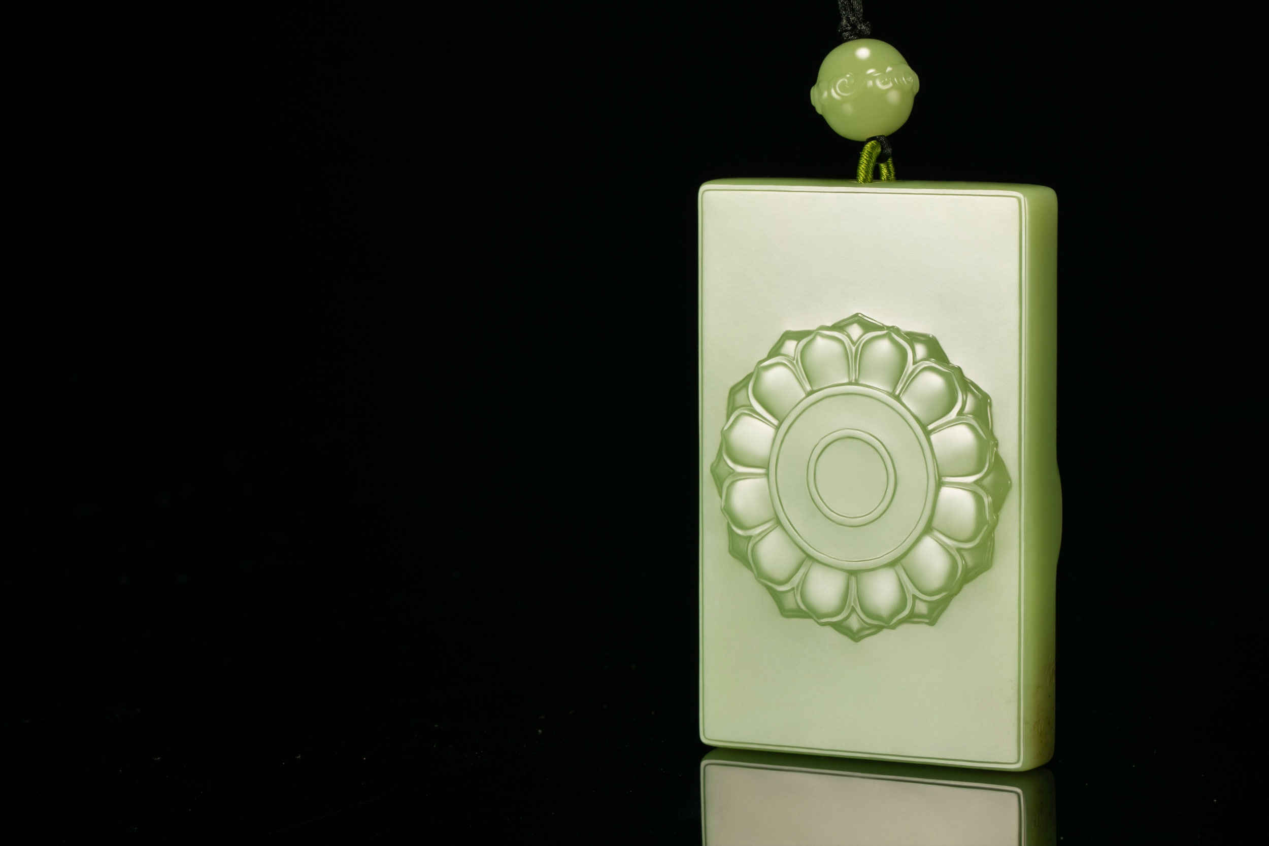 作品画面虚实相宜,玉色清鲜温润,共蕴生命、自然、和谐与向上的力量,令人不忍移视。加之玉牌背面又盛开一朵青莲,更如一方清洁无染的碧潭,潋滟出空灵禅意……