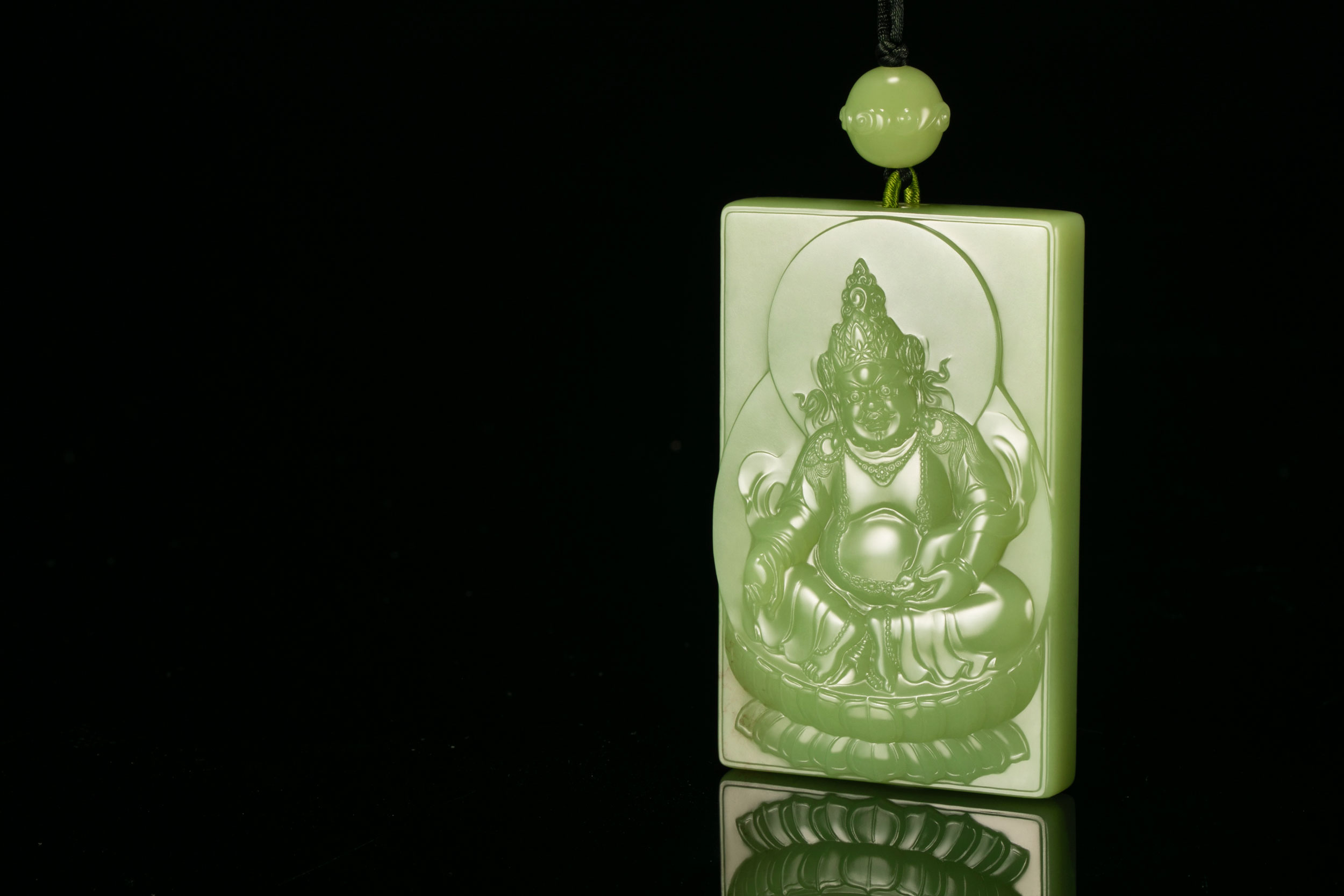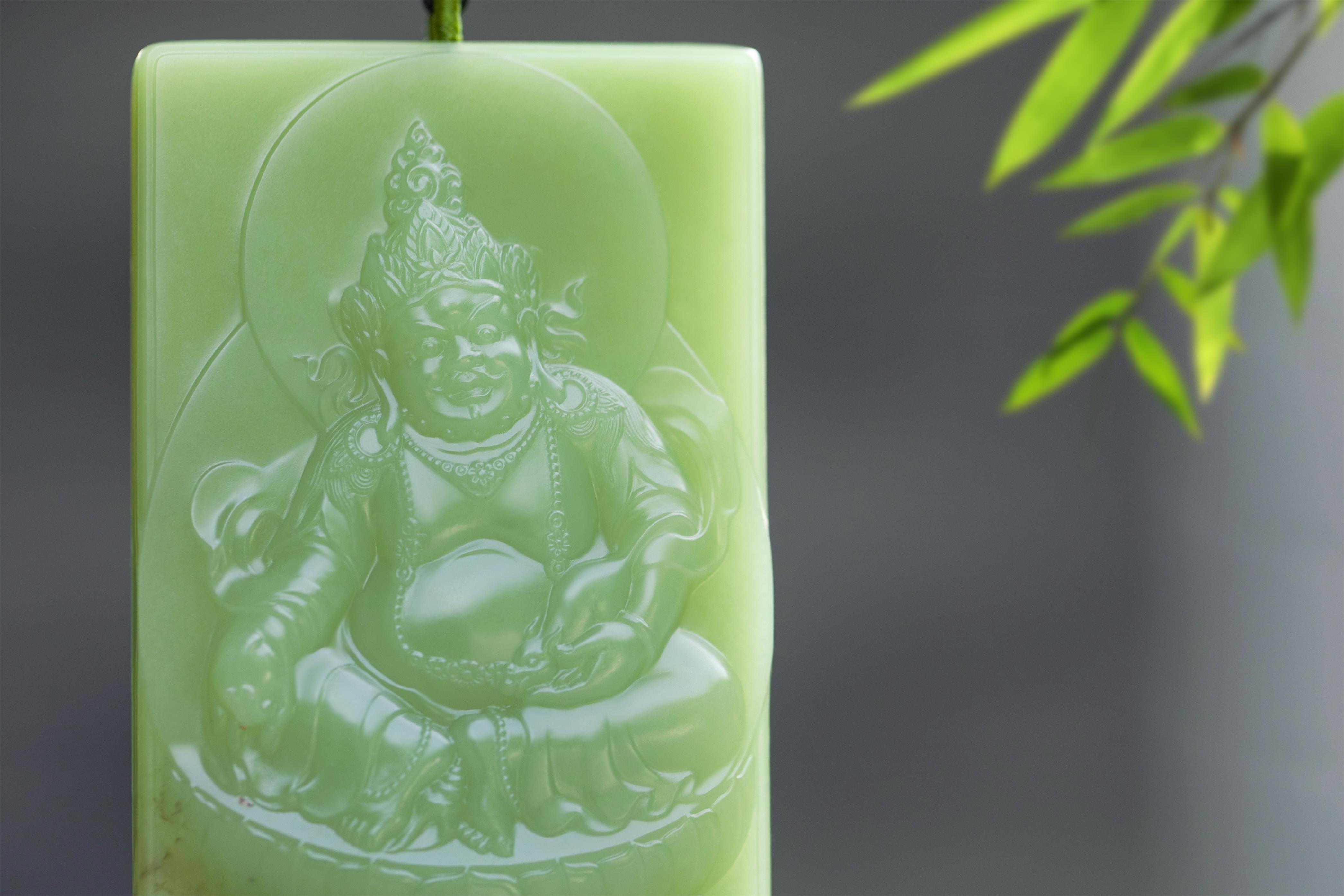 此黄财神因取料青绿色优质析木玉,故而通身细节毕现。
