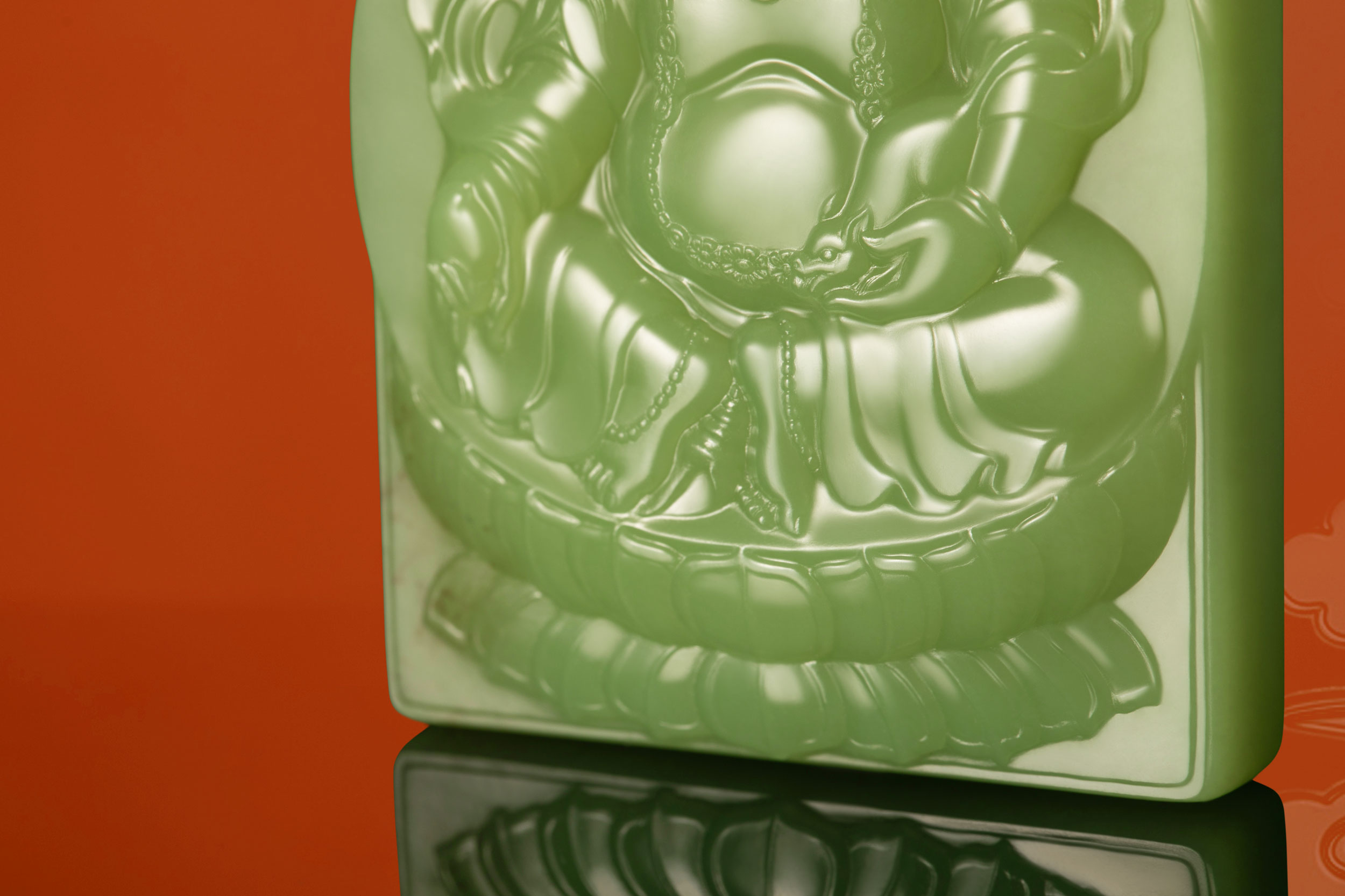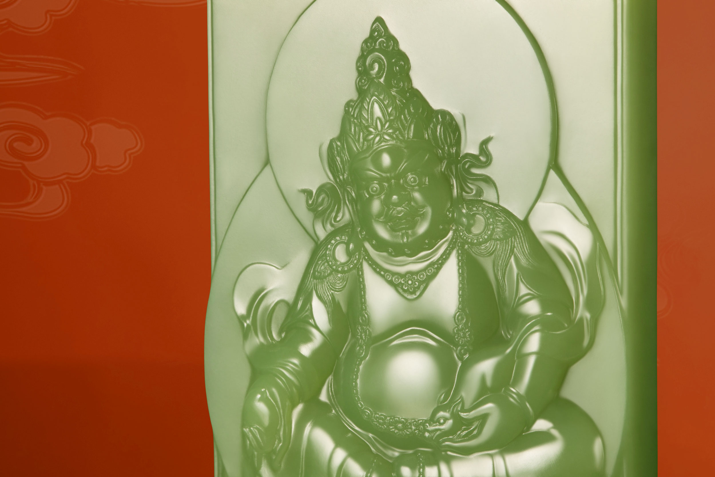 正面的边框线内,雕刻了主体人物黄财神,即黄布禄金刚,是藏传佛教各大教派普遍供养的五姓财神之一,因其身相黄色,故称黄财神,主司财富,能增长富德、寿命、智慧、物质等,使一切众生脱离一切贫困、灾难而富饶自在。