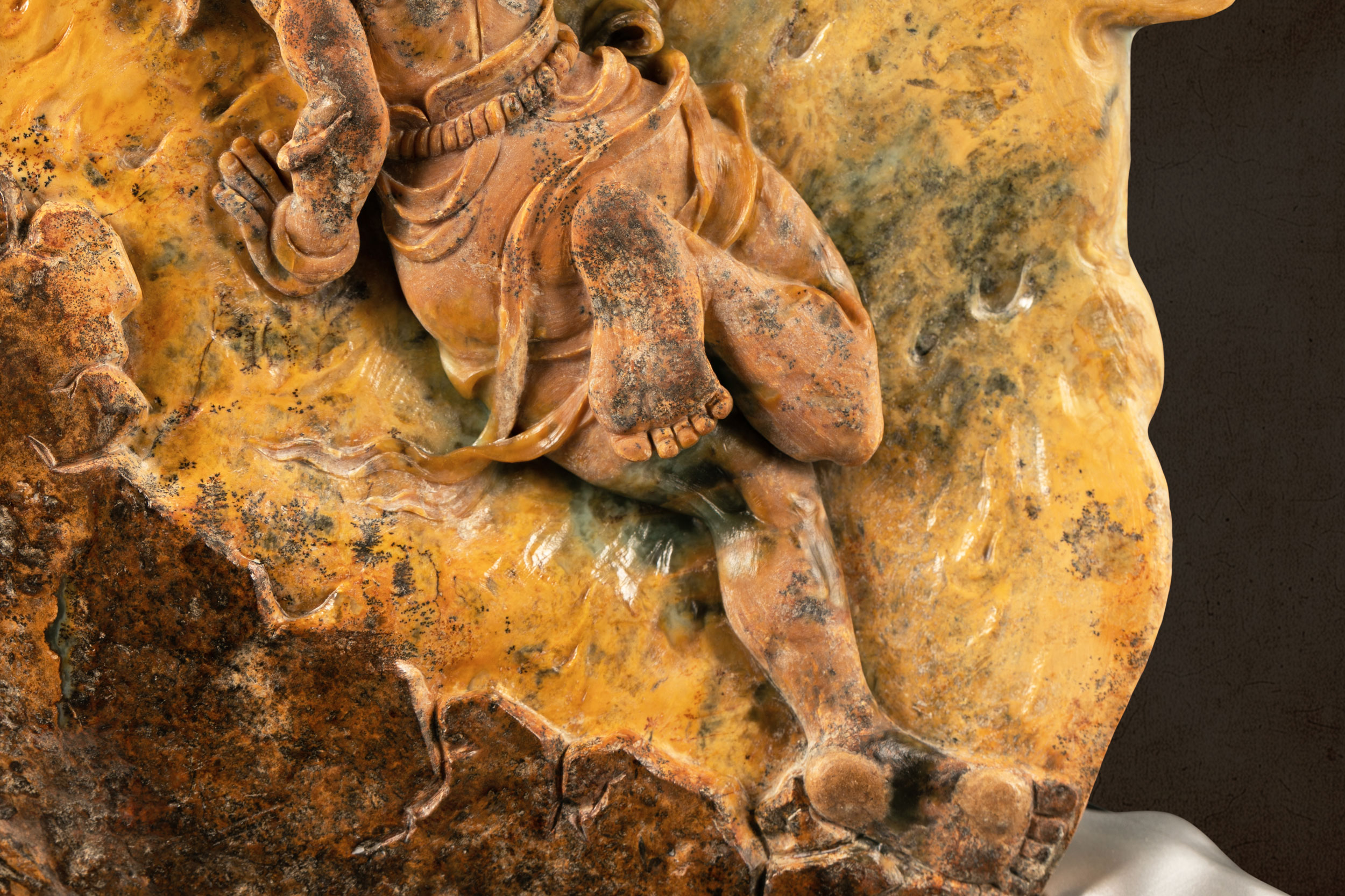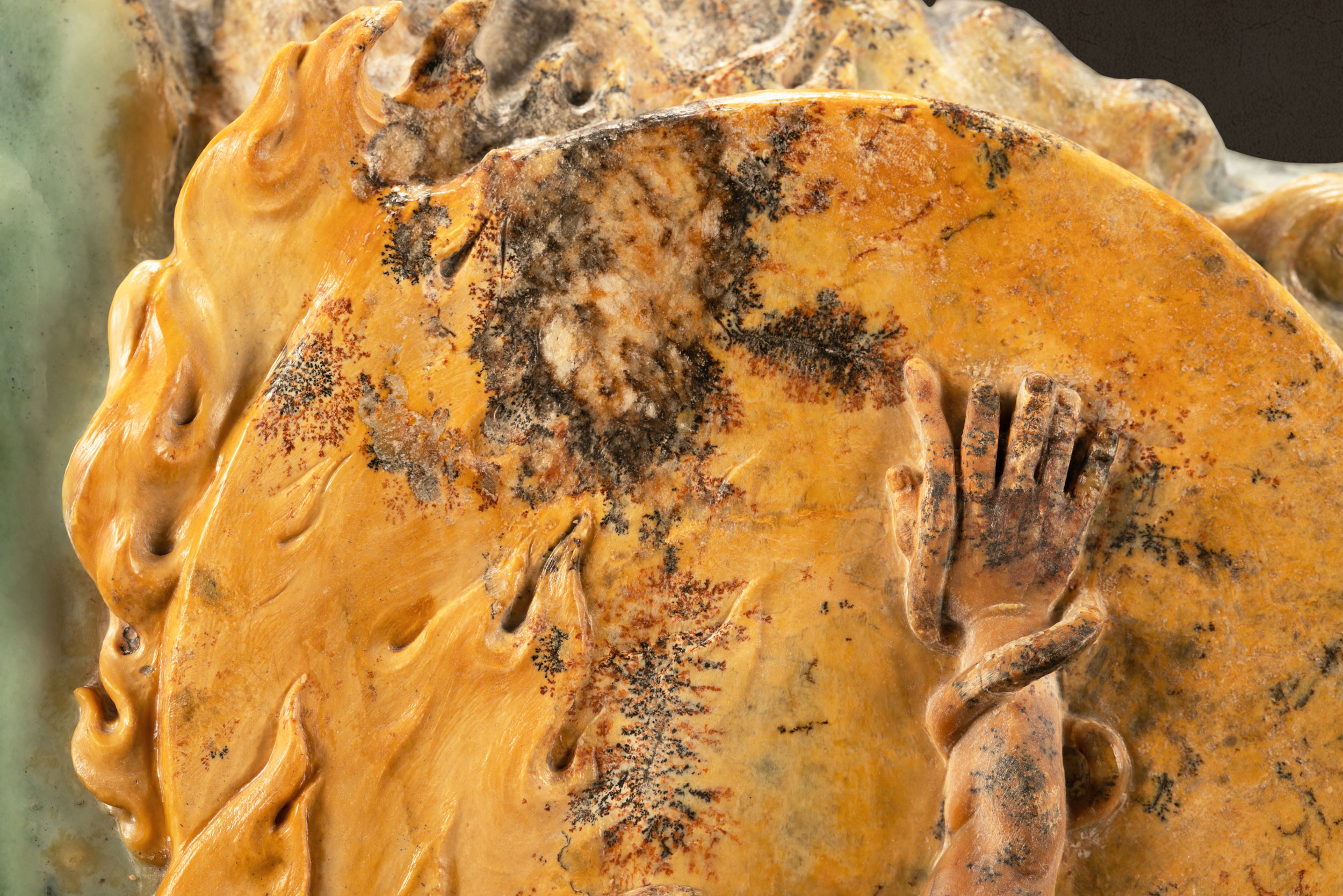 作者结合这些料形特征,自上而下,先是扒皮展露出远方被云雾缭绕的葱郁高山,然后留皮刻画近处红彤彤、热辣辣、飞快移动的大火球,以及被万道金光沐浴的夸父,热气蒸腾的天空和大地。