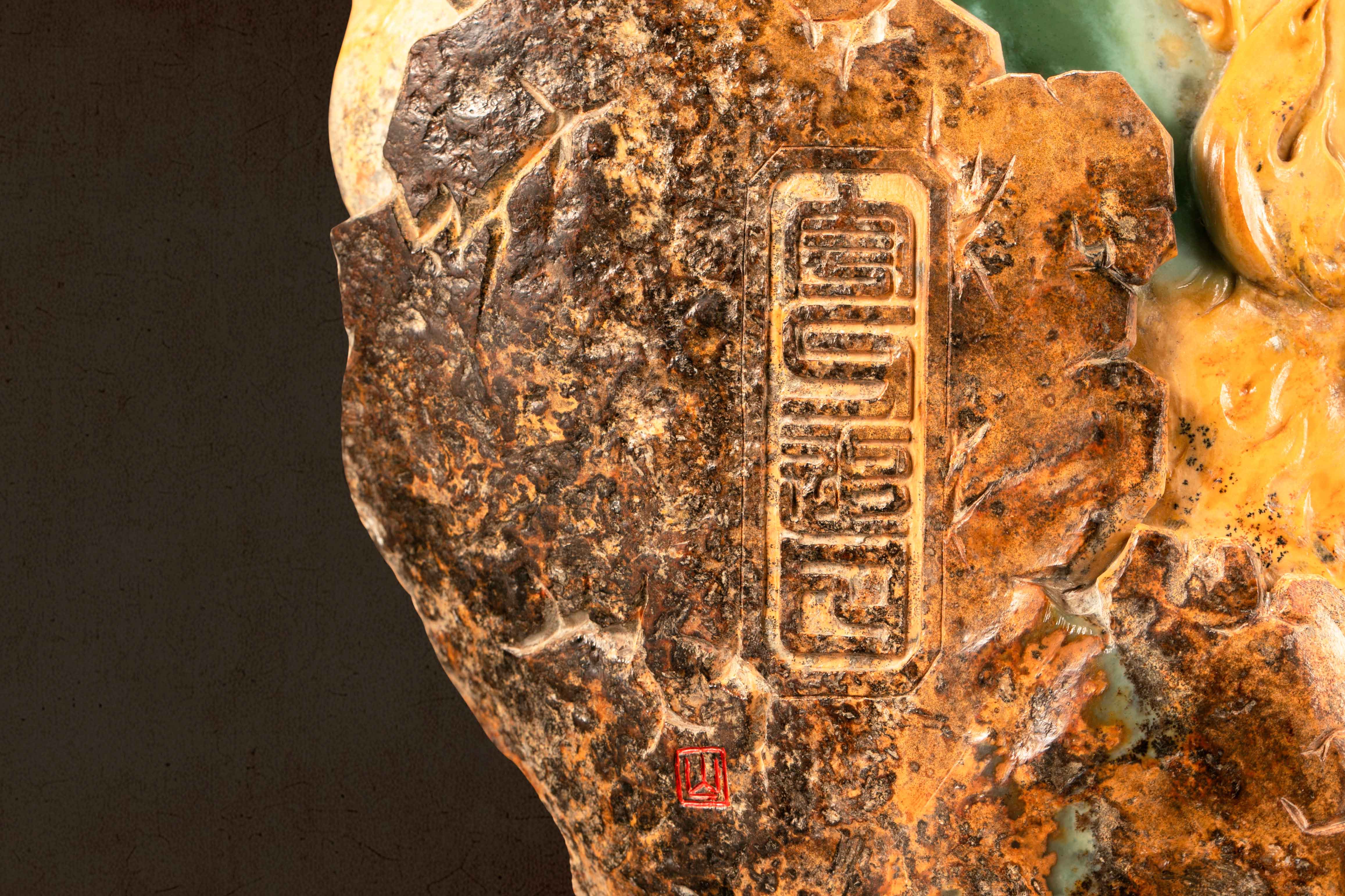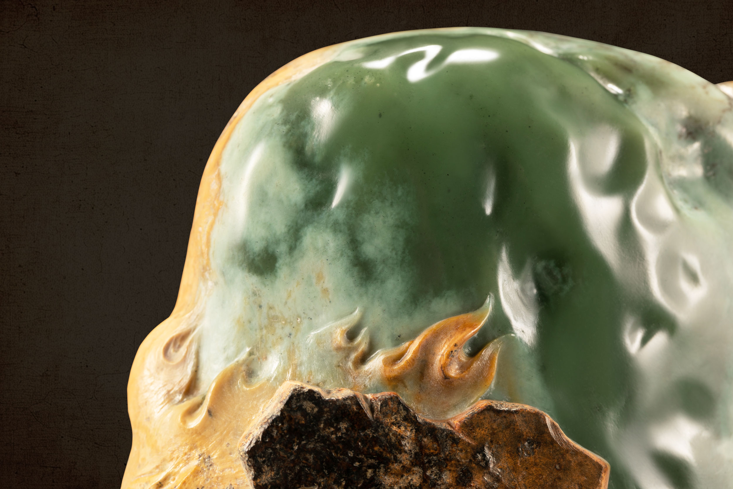 作品是析木玉籽料,外观特征十分鲜明,有大地一样的皮色,皮下泛红而渐黄,擦皮可见青翠绿肉,玉质极为细腻。