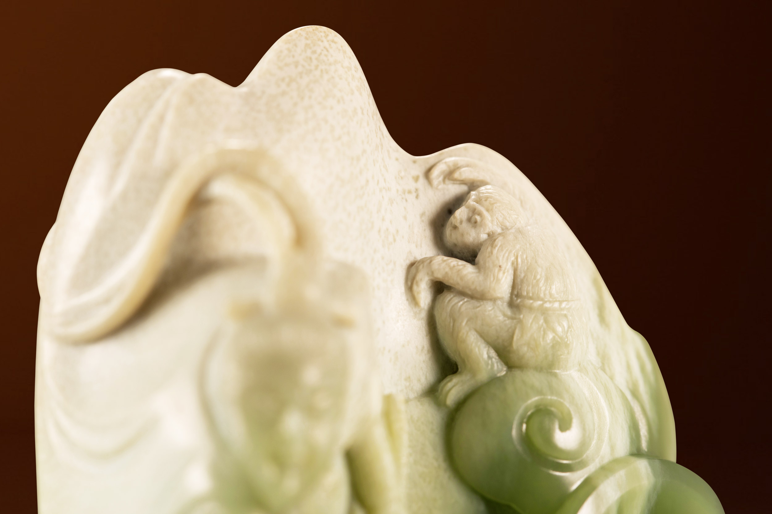在白皮居多的另一面,刻画孙悟空经受磨难的半面肖像和定坐斜月三星洞修行成上仙的画面,其间以深凹的一点玉肉和白皮巧雕成阴阳八卦图作过渡,至上而下将孙悟空从猴子到大王,再到圣、佛转变的每一个环节,以及修行的艰辛、喜悦,平静和顺境界的抵达等,作了充分、深刻而完美的呈现。