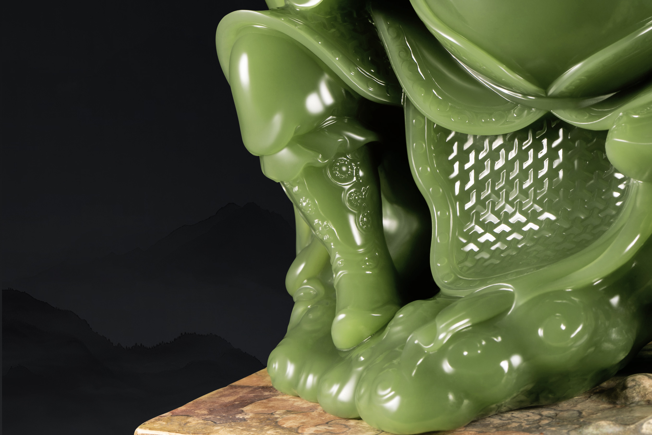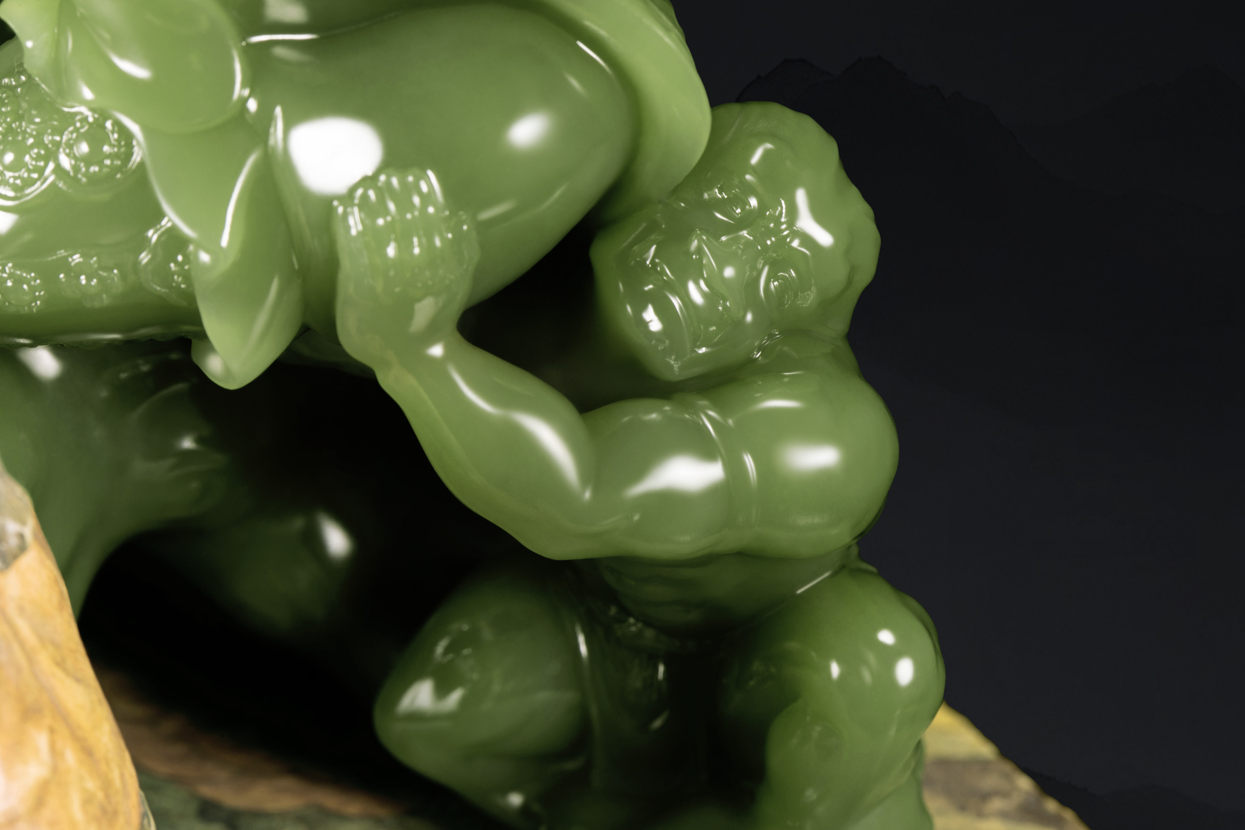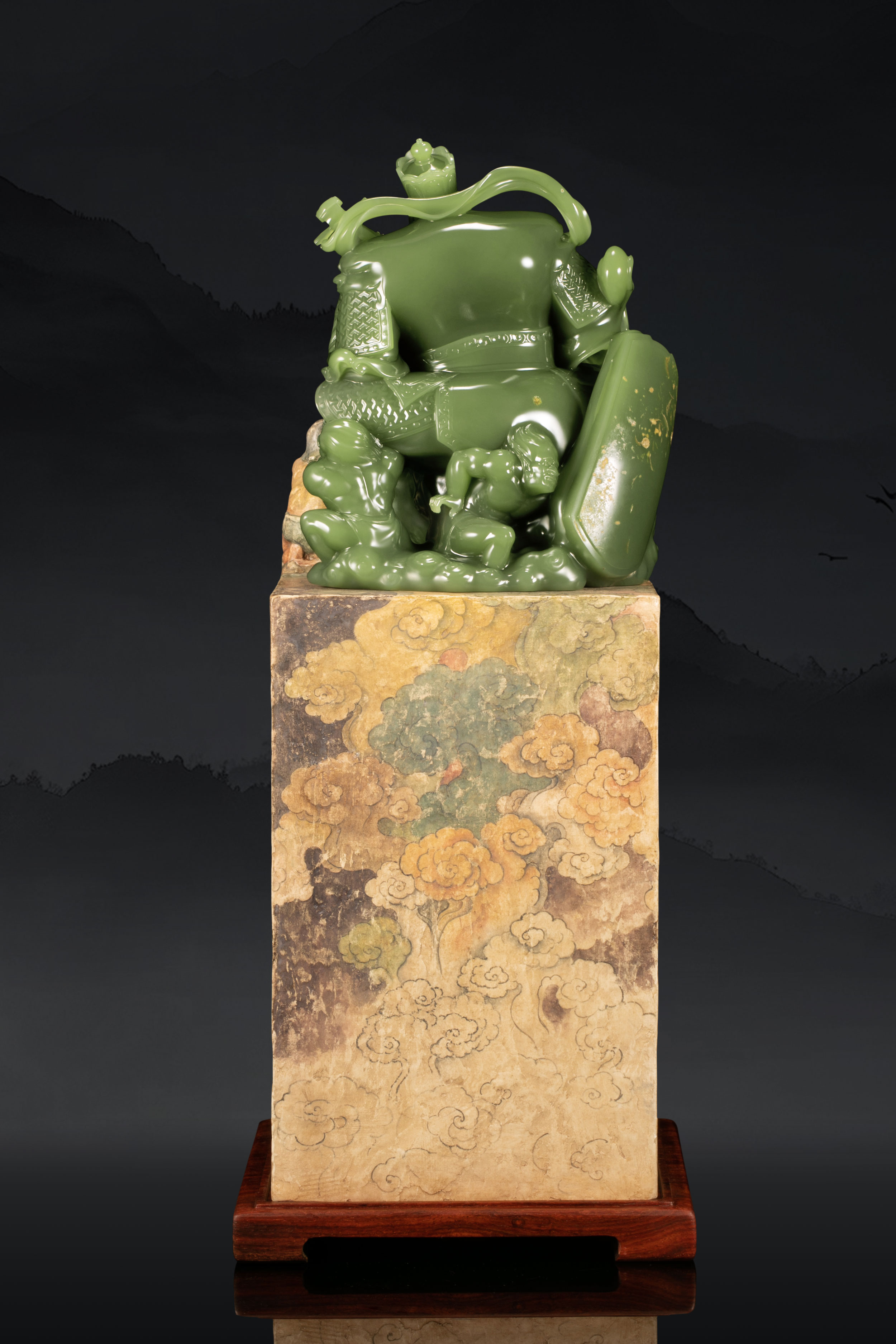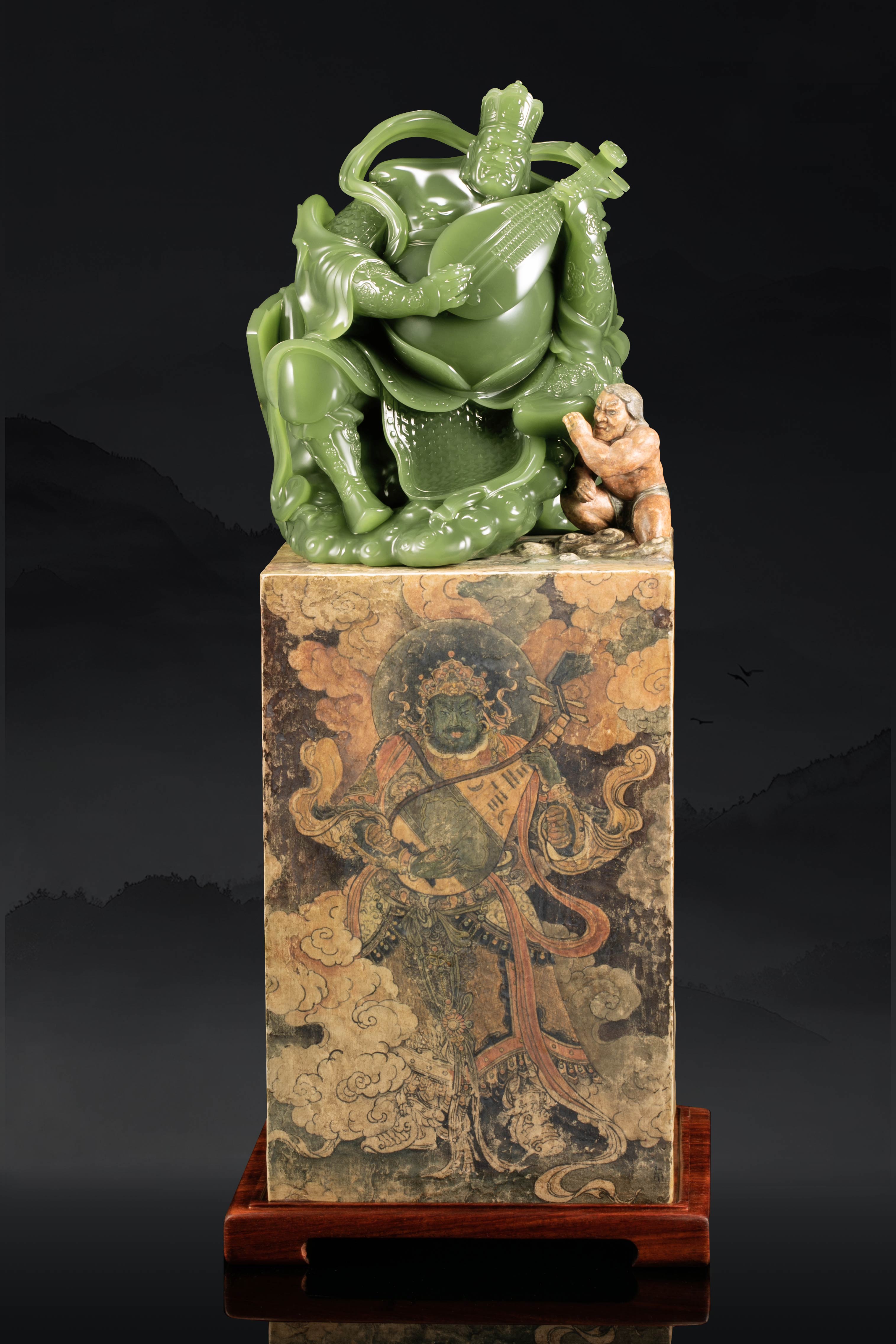 你看,由中国玉石雕刻大师张庆东匠心打造的佛教人物题材作品《东尊天王》,含底座高度为41cm,长14.5cm,宽14.5cm,总重量2680克,体量不算大,但古壁画效果的底座与人物张力极显的细润析木玉交相辉映,意蕴绝佳,彰显出同一尊天王-东尊天王的威武凌然、刚毅雄健,视觉效果非同一般,既深蕴中华美学精神特质,又与父亲在人心目中的形象高度契合。