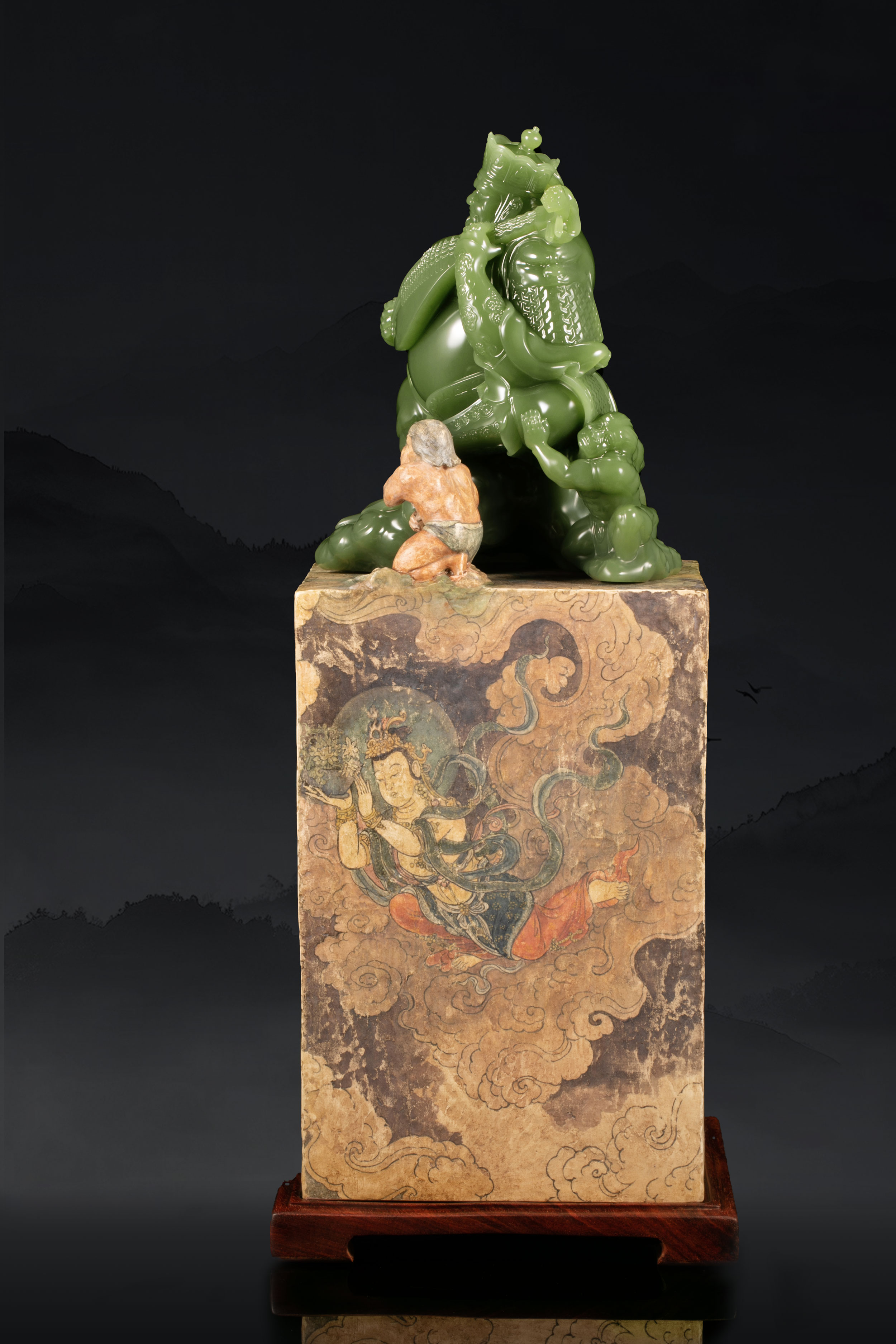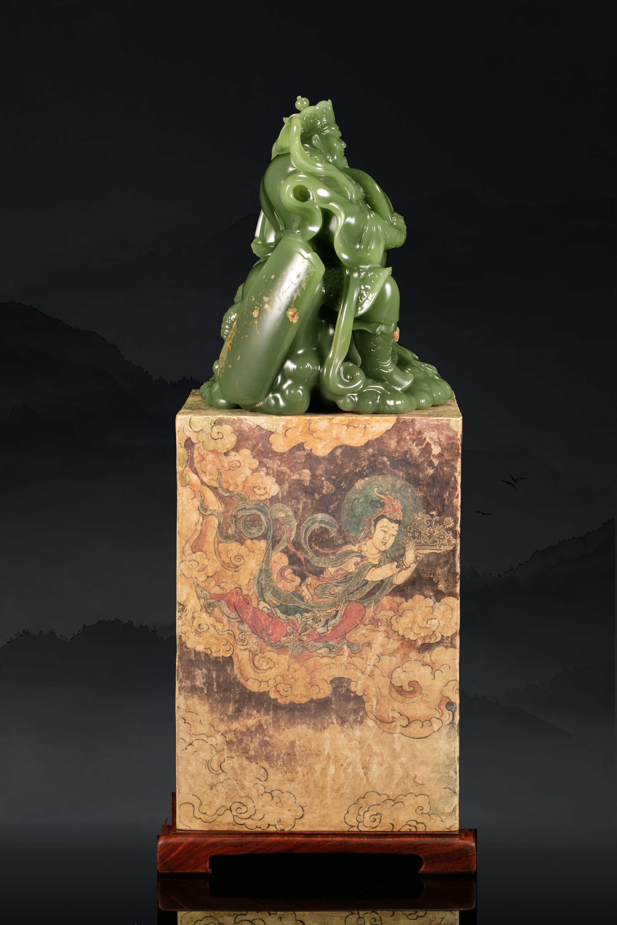 玉上散落的零星红沁,为玉色增添一抹古韵,也与古壁画手法处理的底座完美呼应。