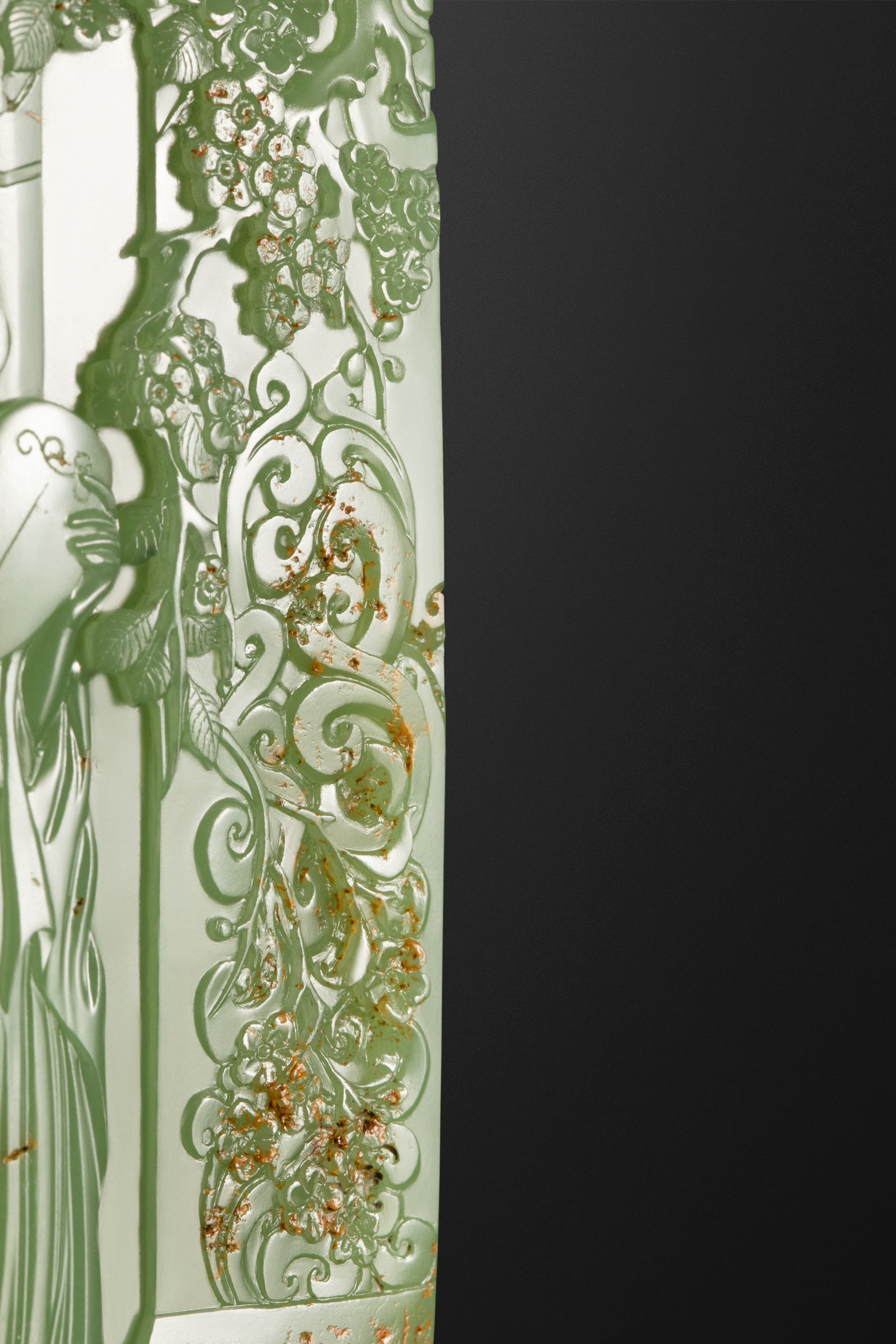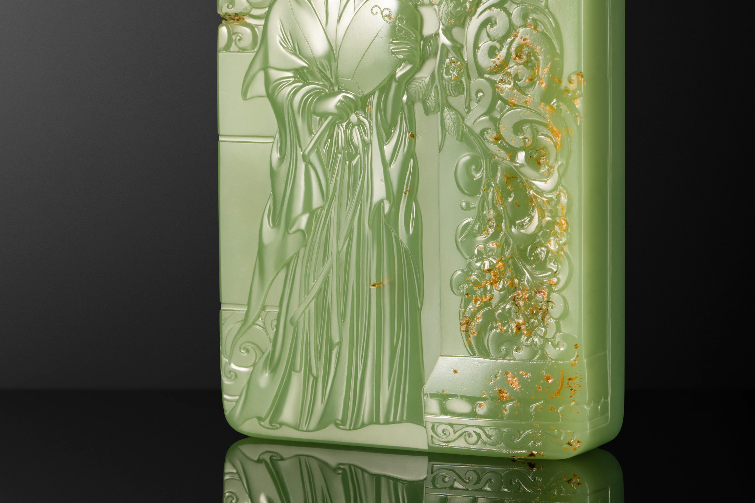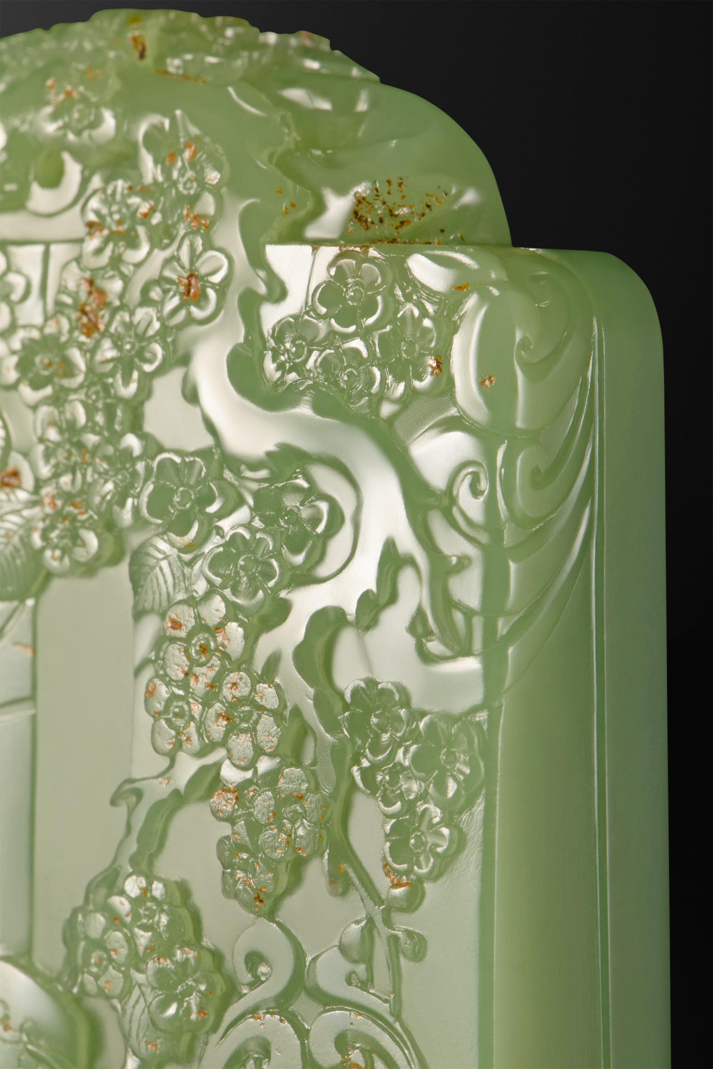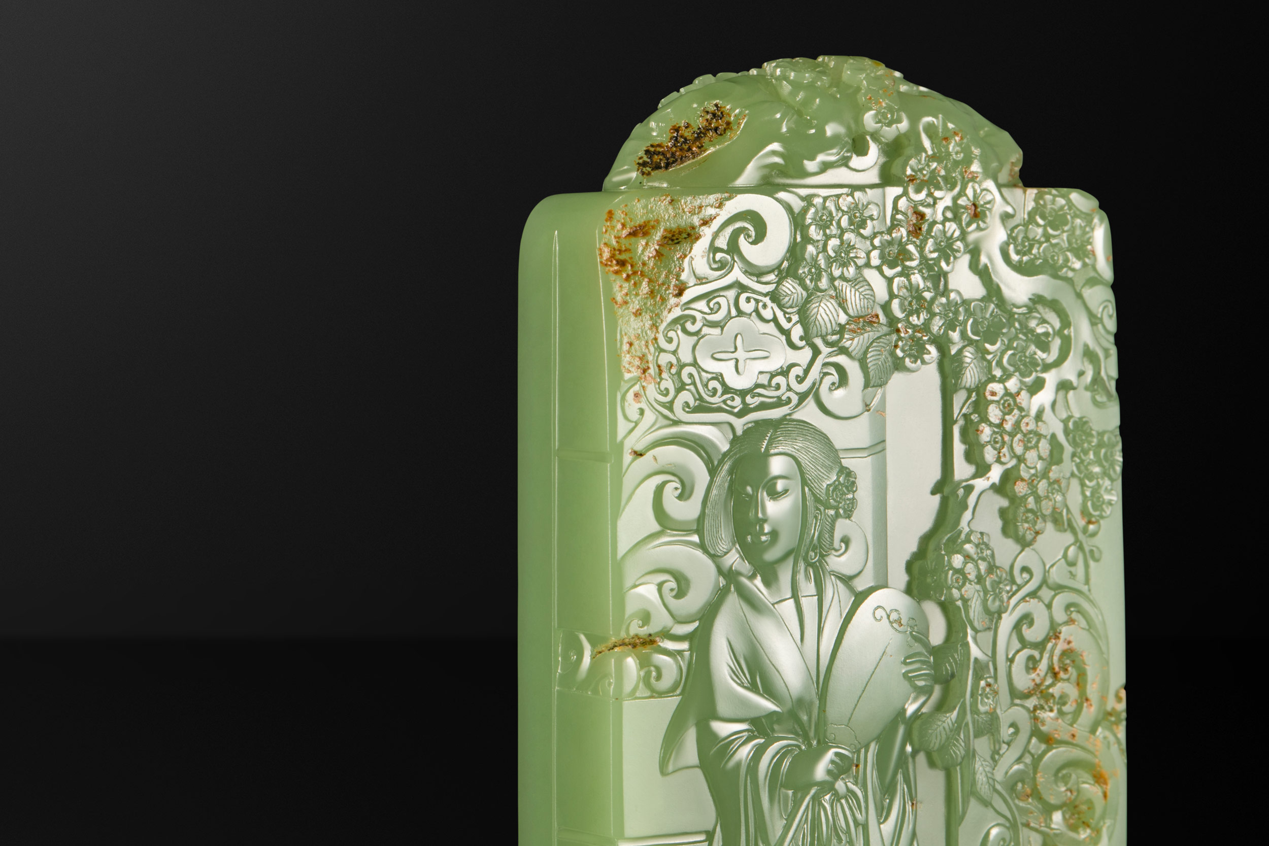 中国玉石雕刻大师、正高级工艺美术师、国家级非物质文化遗产(海派玉雕)代表性传承人翟倚卫,最擅在玉石上描物出神,诗画结合,寓意寄托,彰显人格精神和温柔、敦厚、平和之气。