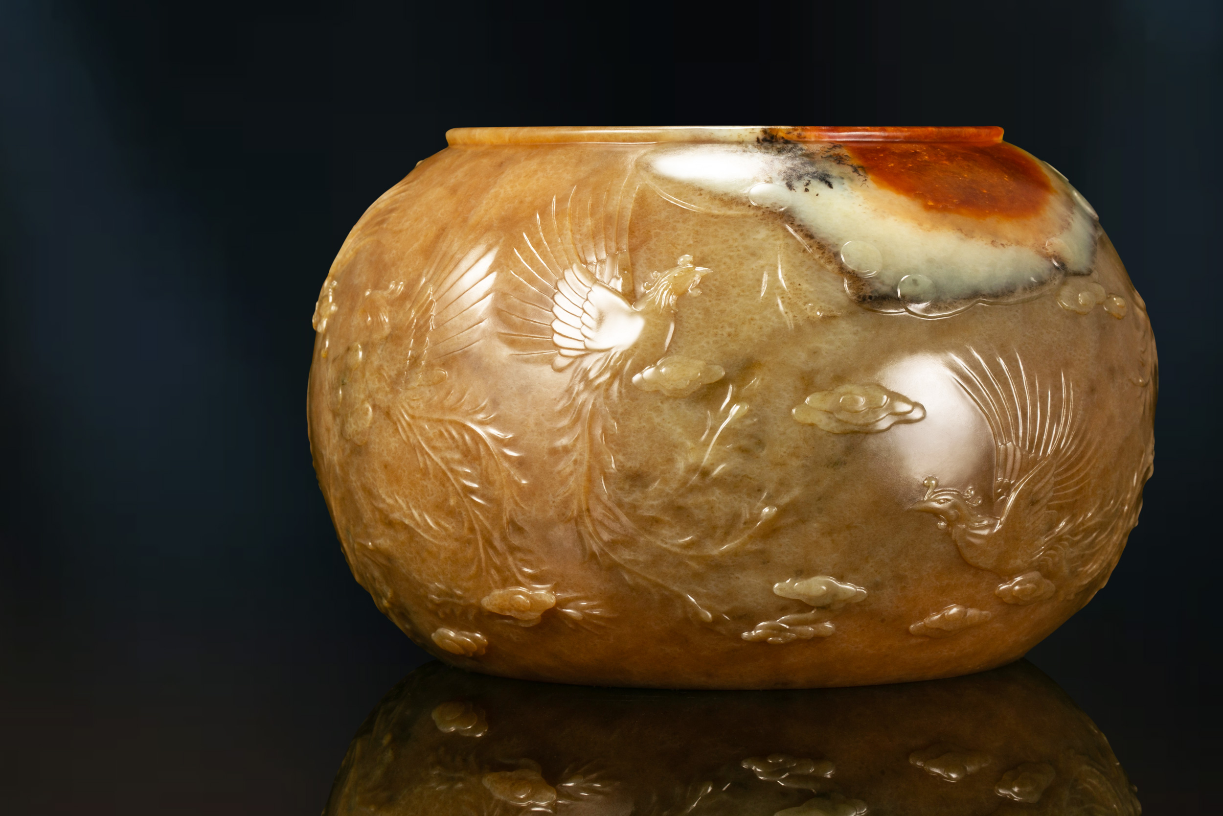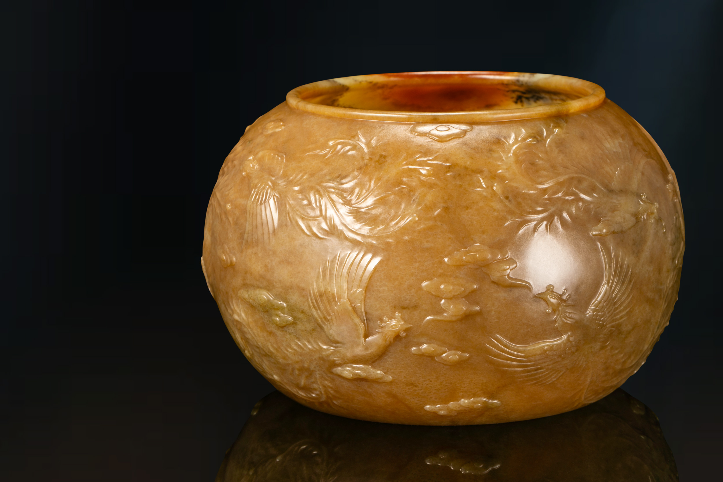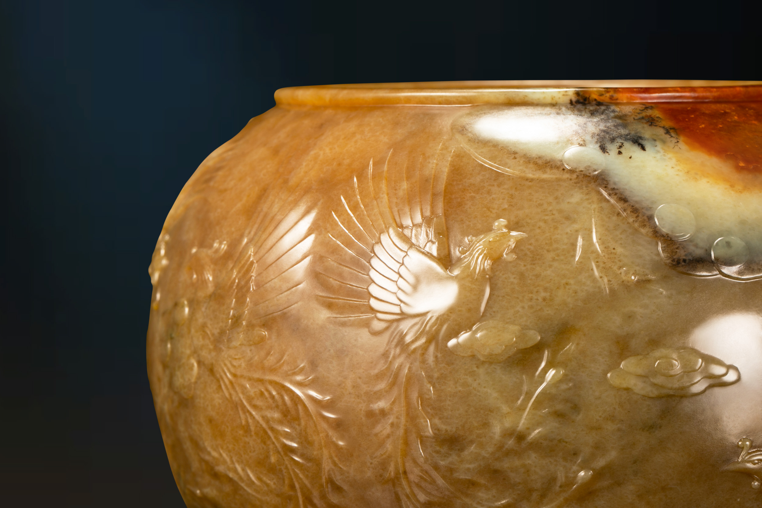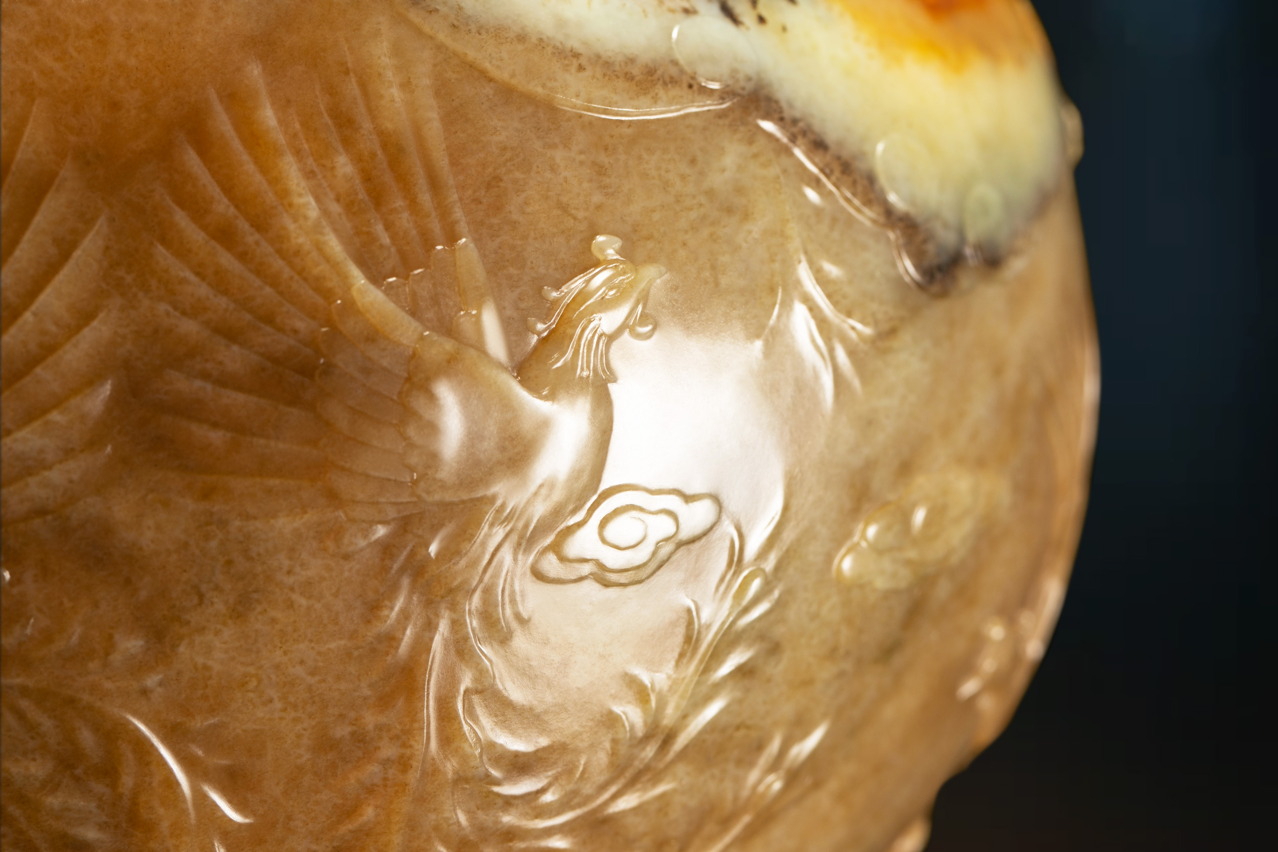 他简工勾勒,真实地反映出析木玉糖料的自然之美。他也用精工,以细腻的工笔画技法,在胎薄如纸的洗壁上刻画九凤朝阳的盛况。