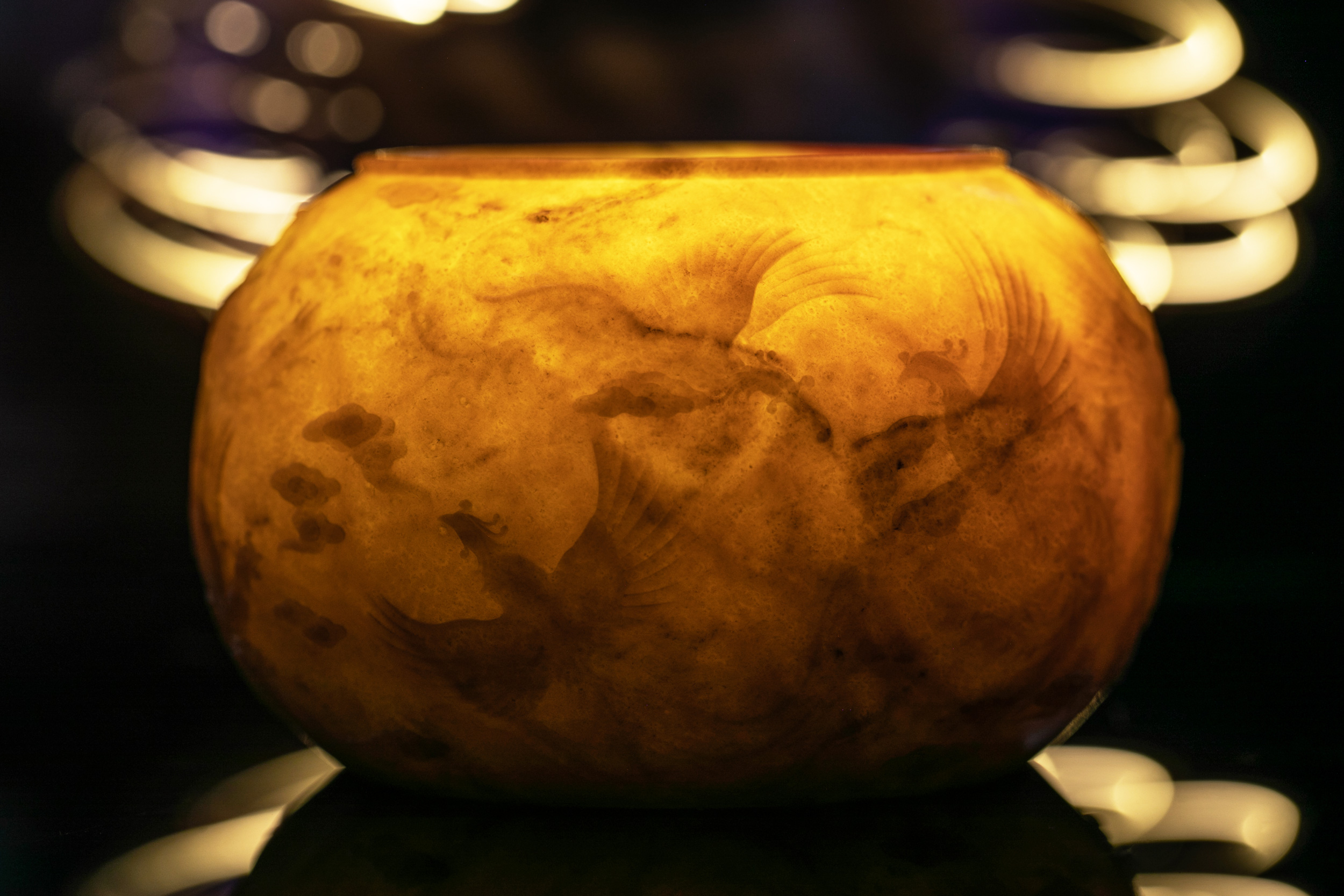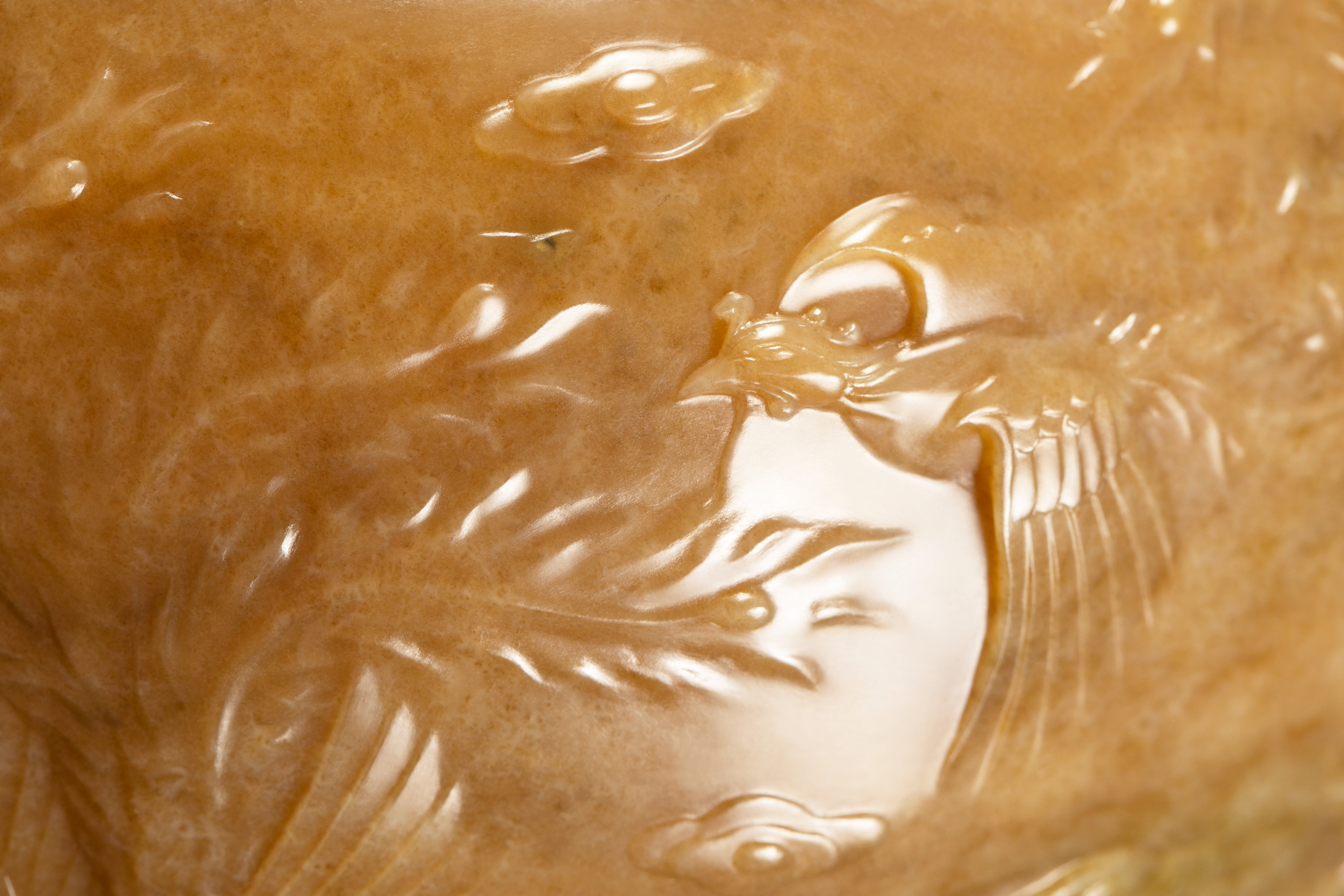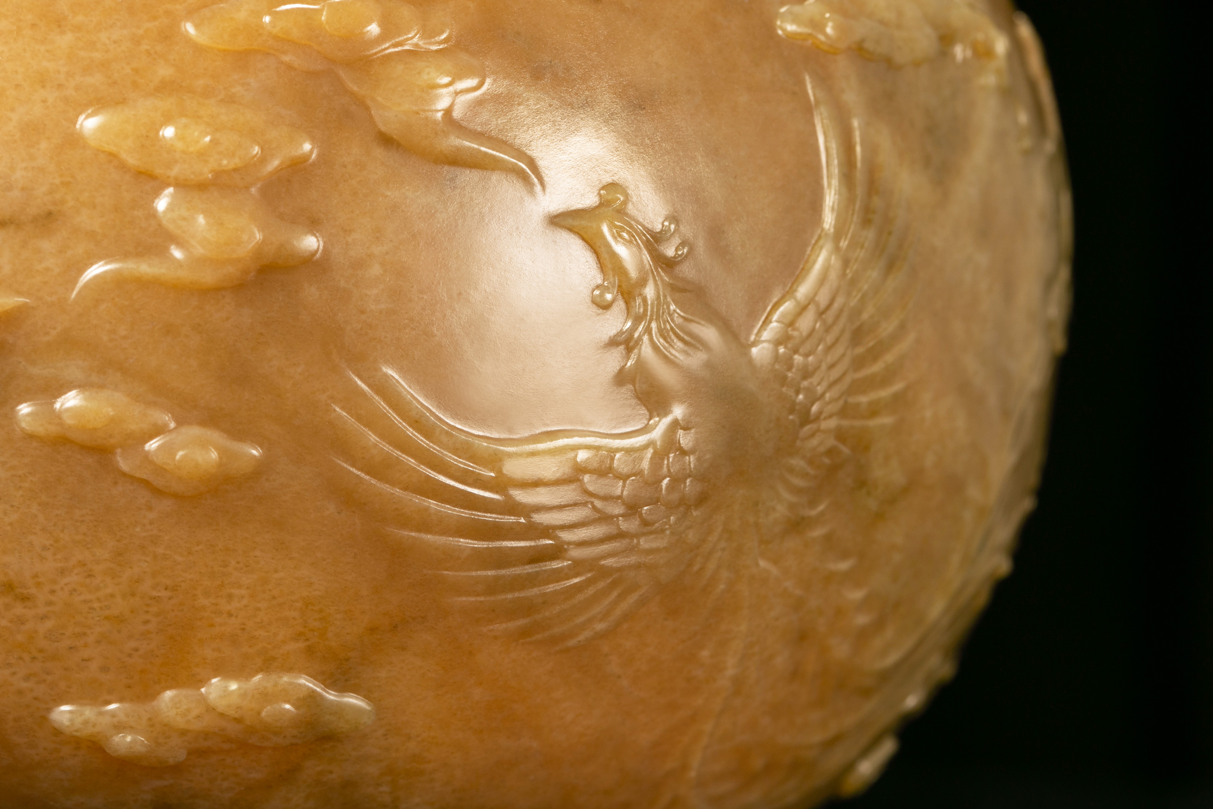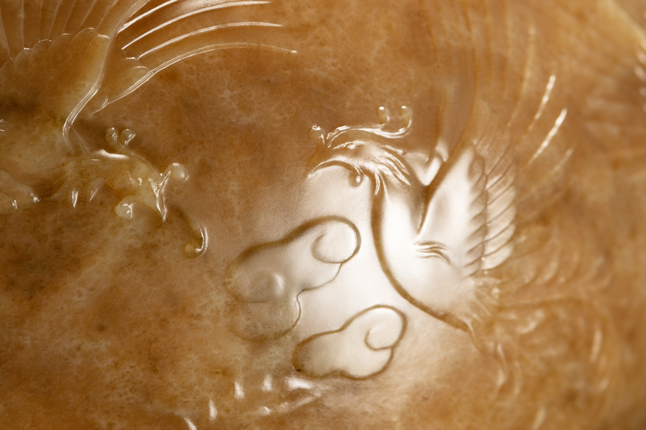 他简工勾勒,真实地反映出析木玉糖料的自然之美。他也用精工,以细腻的工笔画技法,在胎薄如纸的洗壁上刻画九凤朝阳的盛况。
